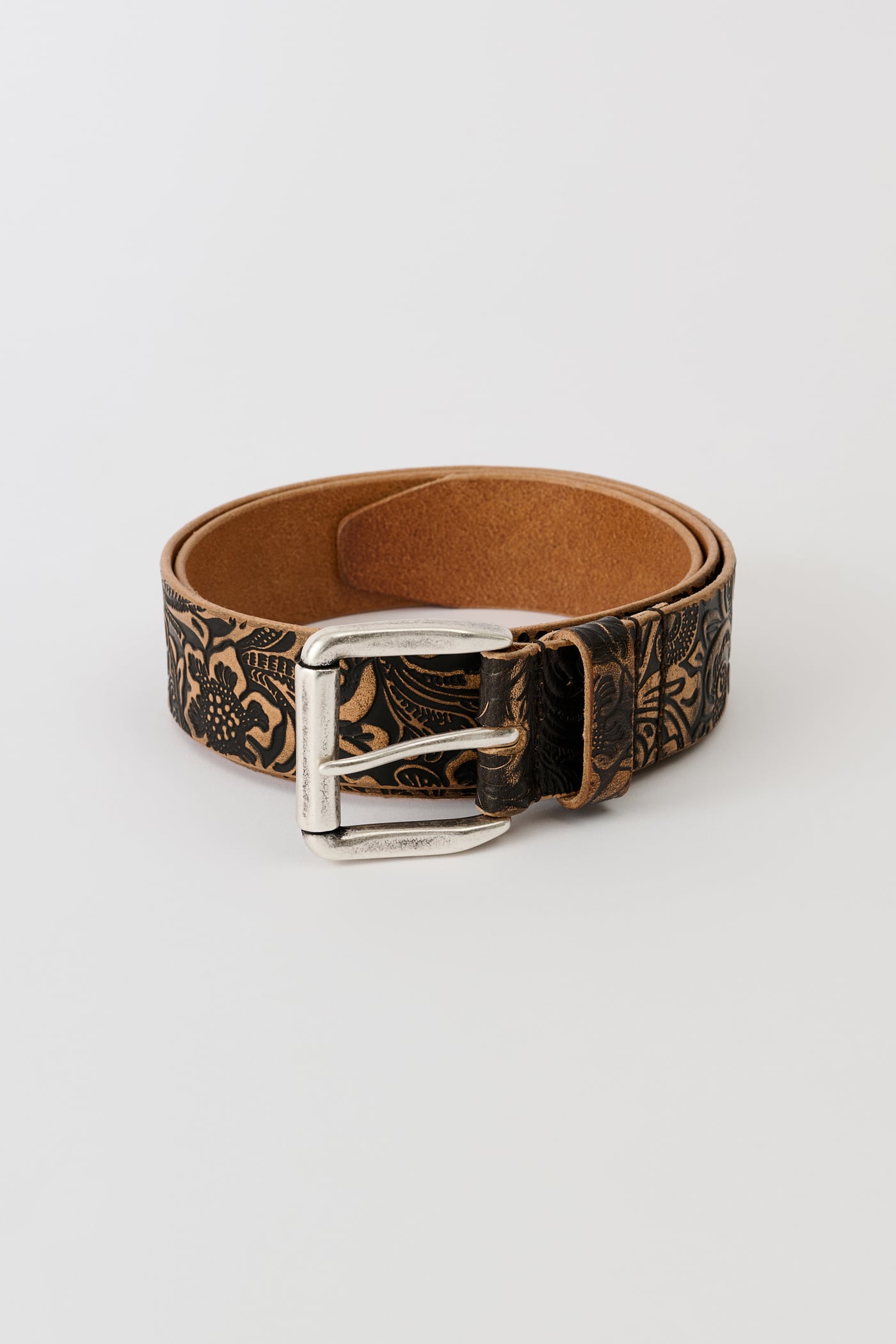Our 4 cm Belt in Paisley Black Vintage Leather. Produced in Italian cow leather with an engraved paisley pattern, this belt features a metal single pin buckle closure, metal keeper and measures 40mm in width. Comes with a dust bag.