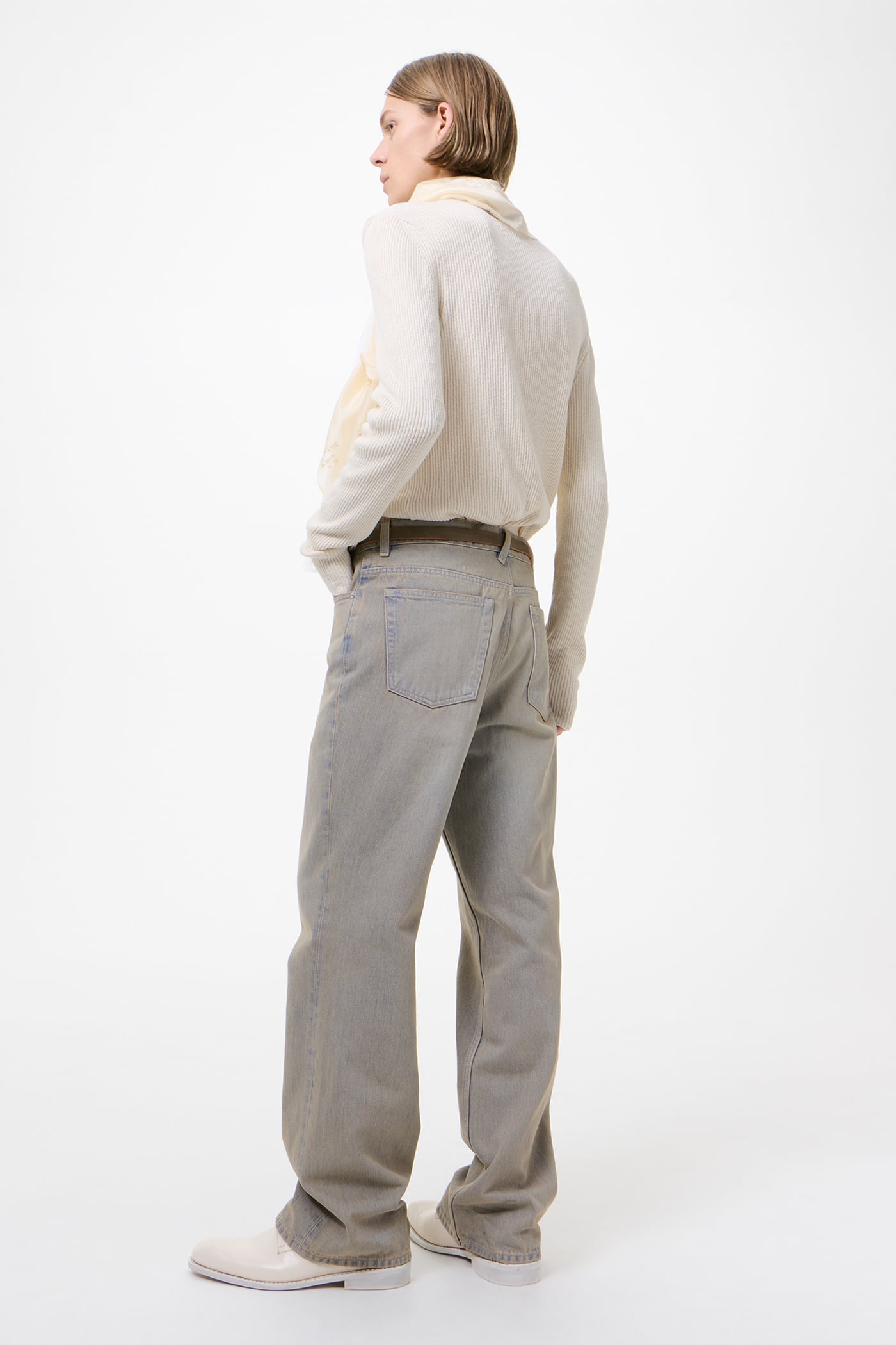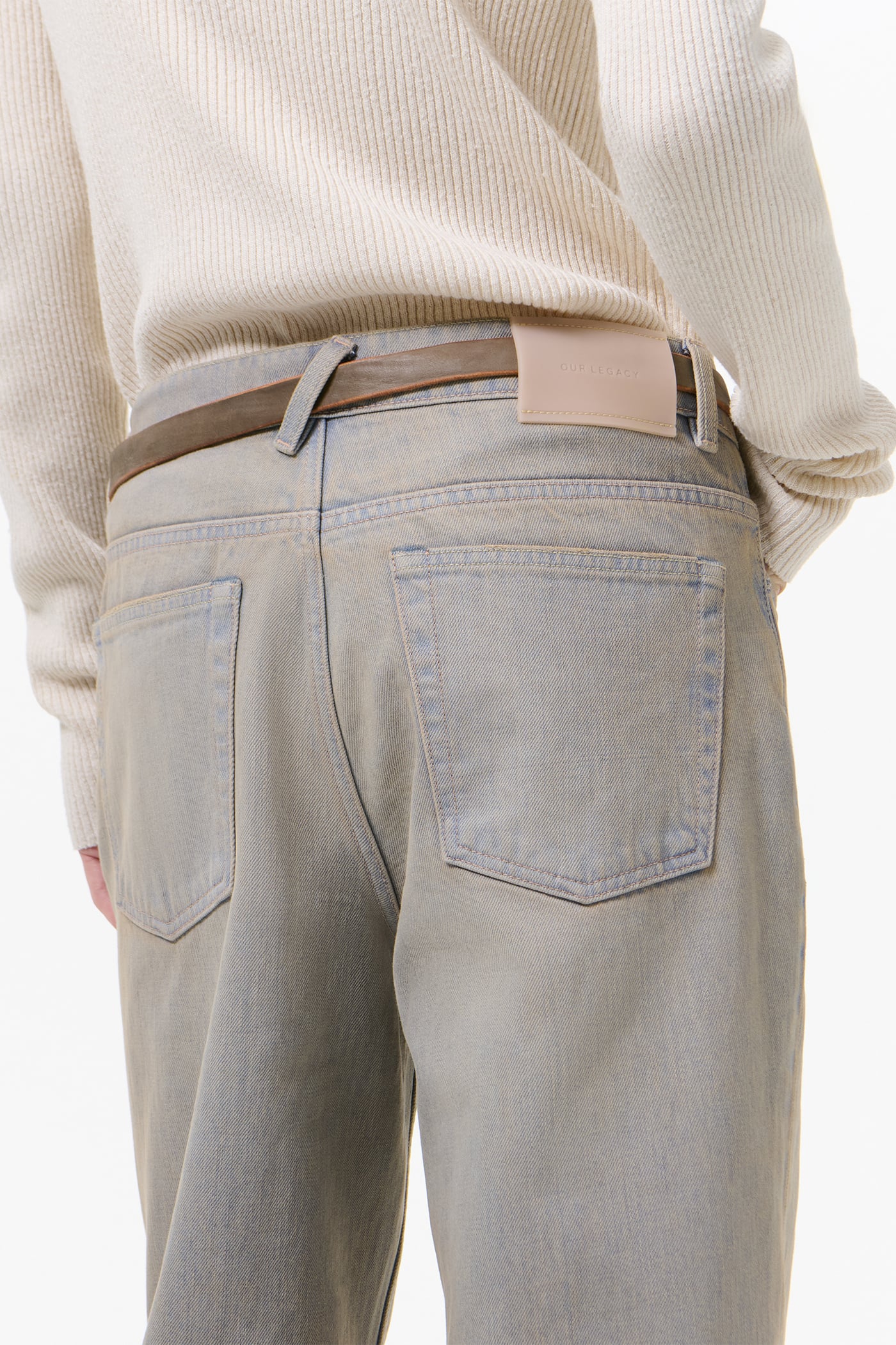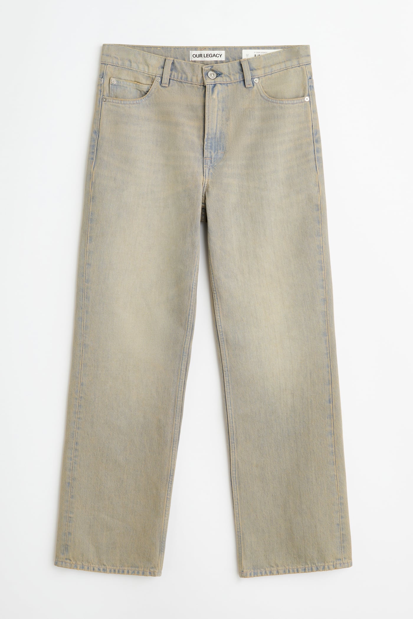 Our 70s Cut in Lume Wash. Produced in a Turkish cotton and polyester blend denim, the 70s Cut has undergone an extensive washed and tinted treatment that creates an indigo-tinged, alabaster-like finish. Our 70s Cut has a high waist with a straight hip and a boot cut leg, and features five pockets, steel rivets and a zip fly.