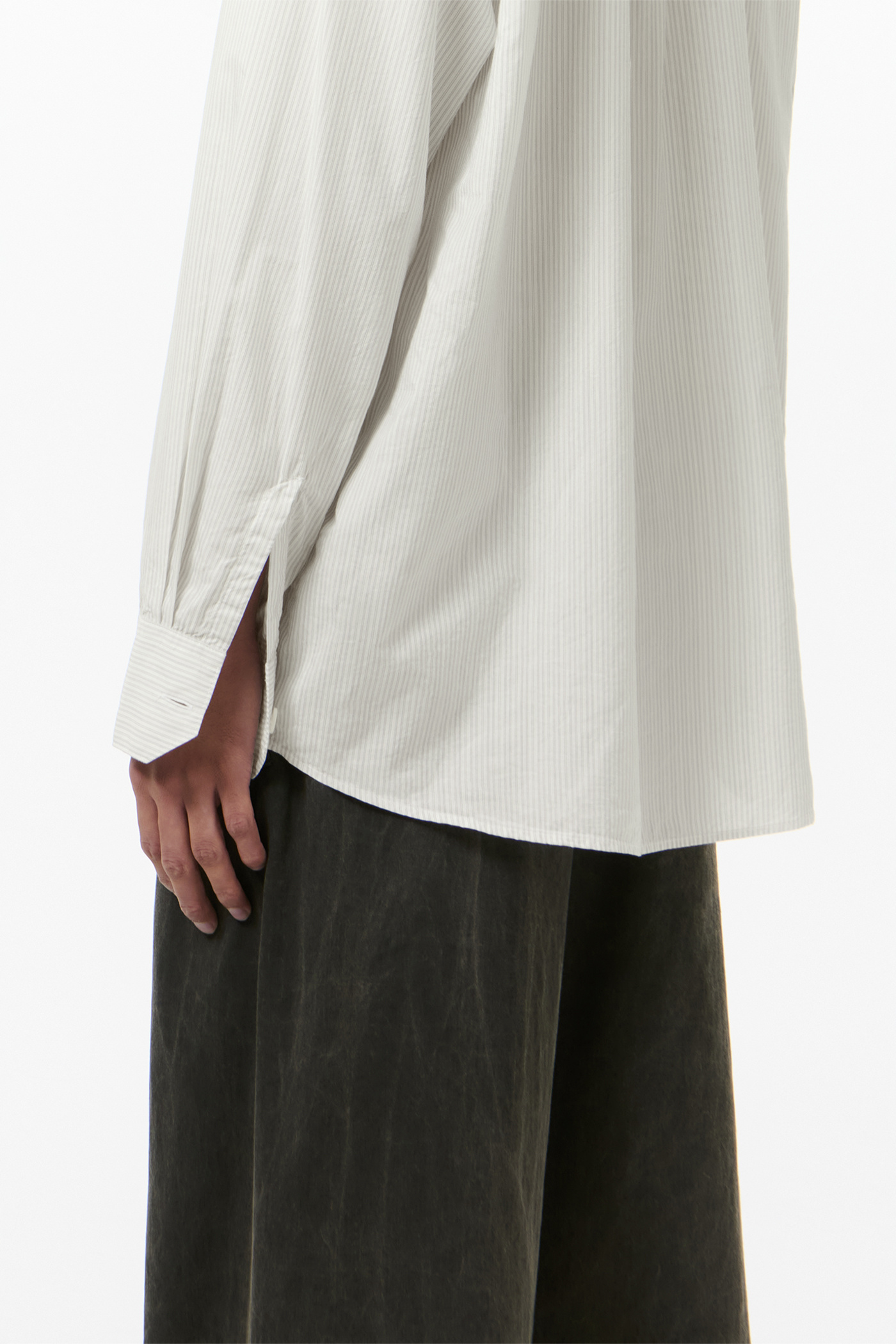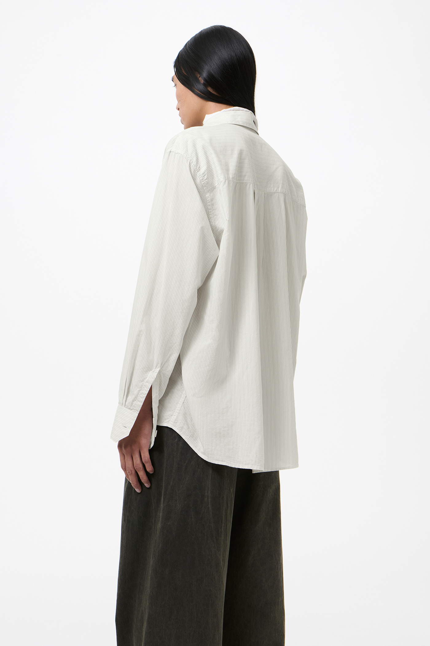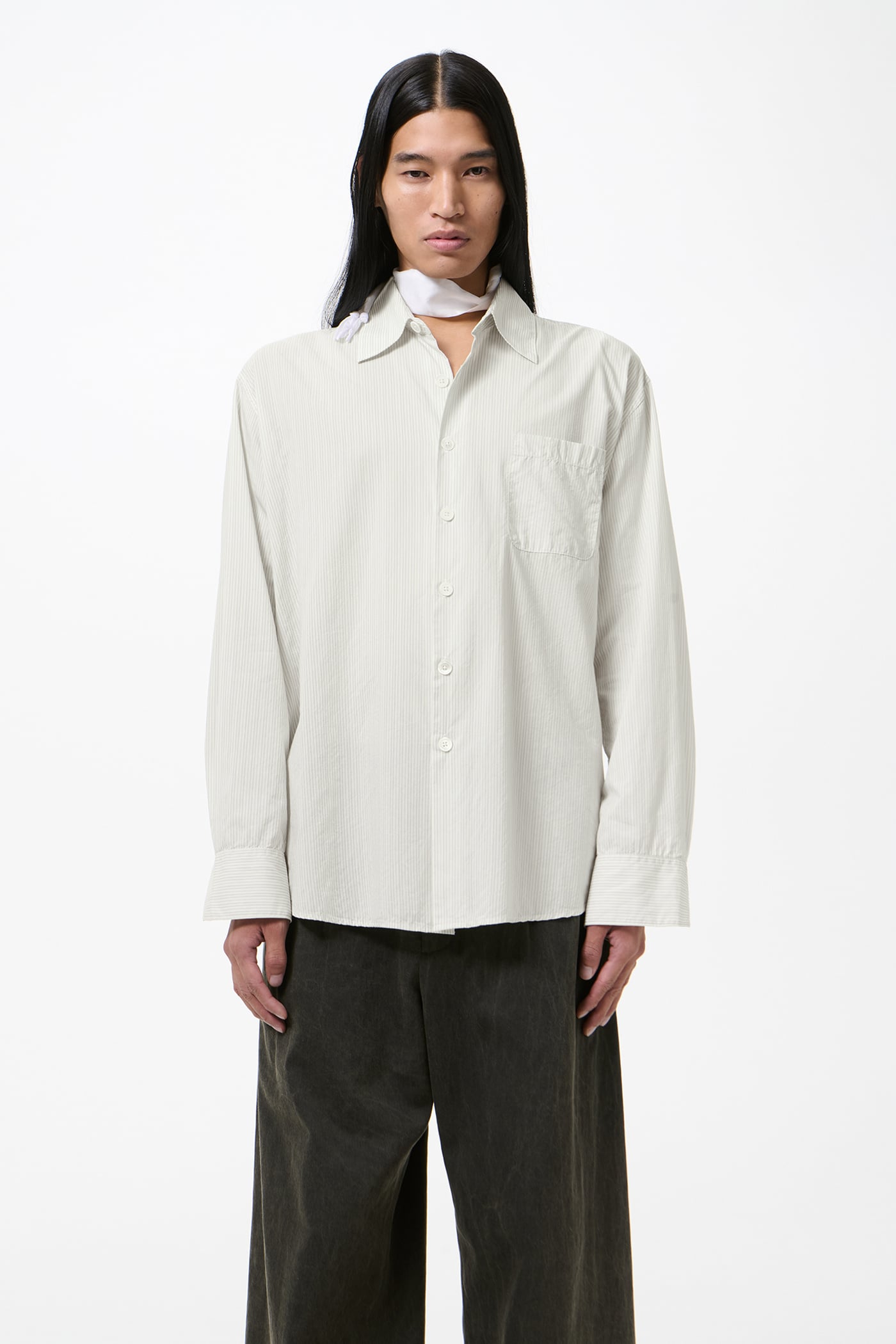 Our Above Shirt in Index Stripe Coolthread Cloth. Produced in a striped Portuguese cotton and cupro cloth, the men's Above Shirt has a slightly oversized cut and features a single chest pocket, OL embroidery, mother of pearl buttons, a curved hem and mitered cuffs.