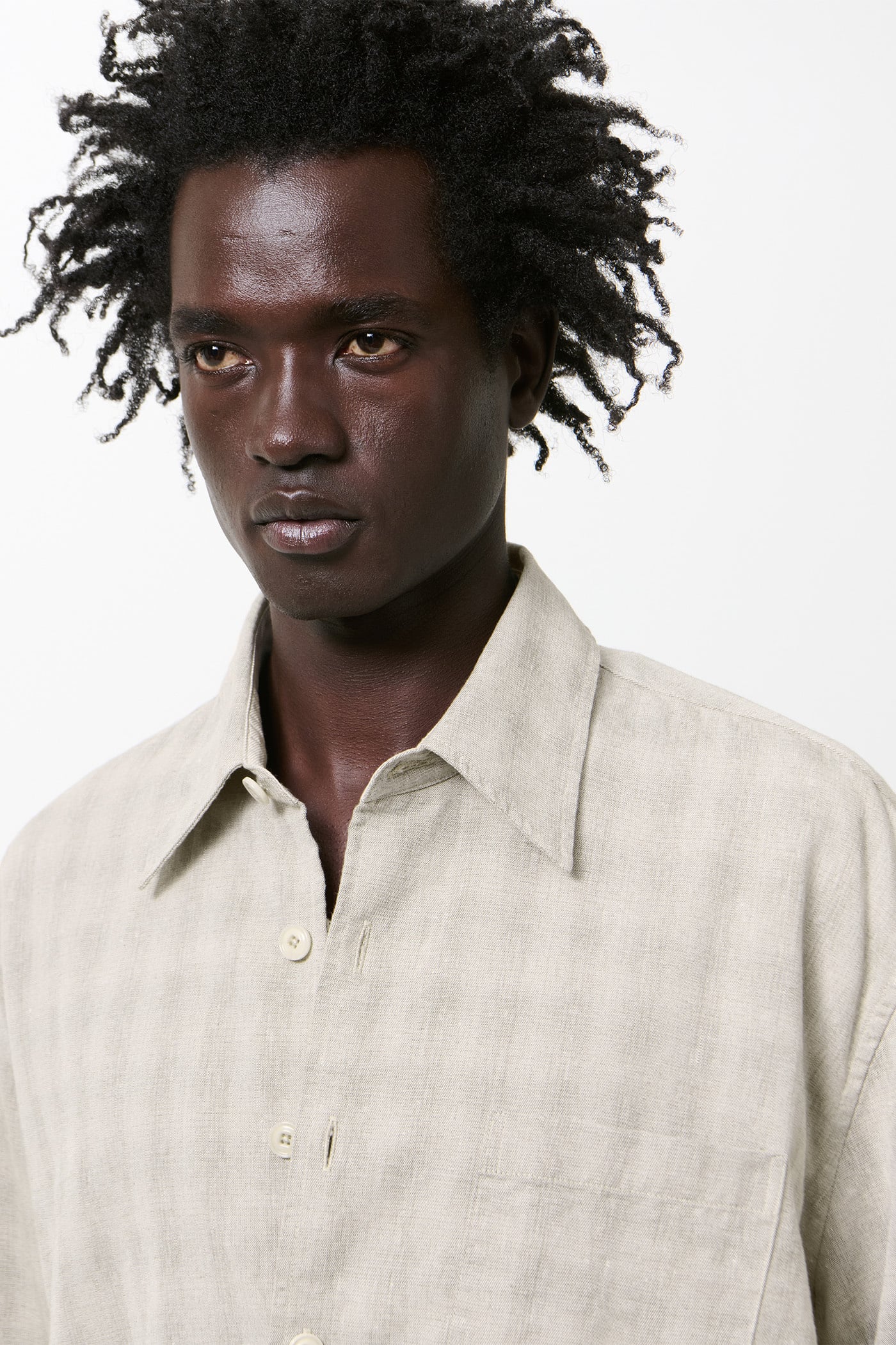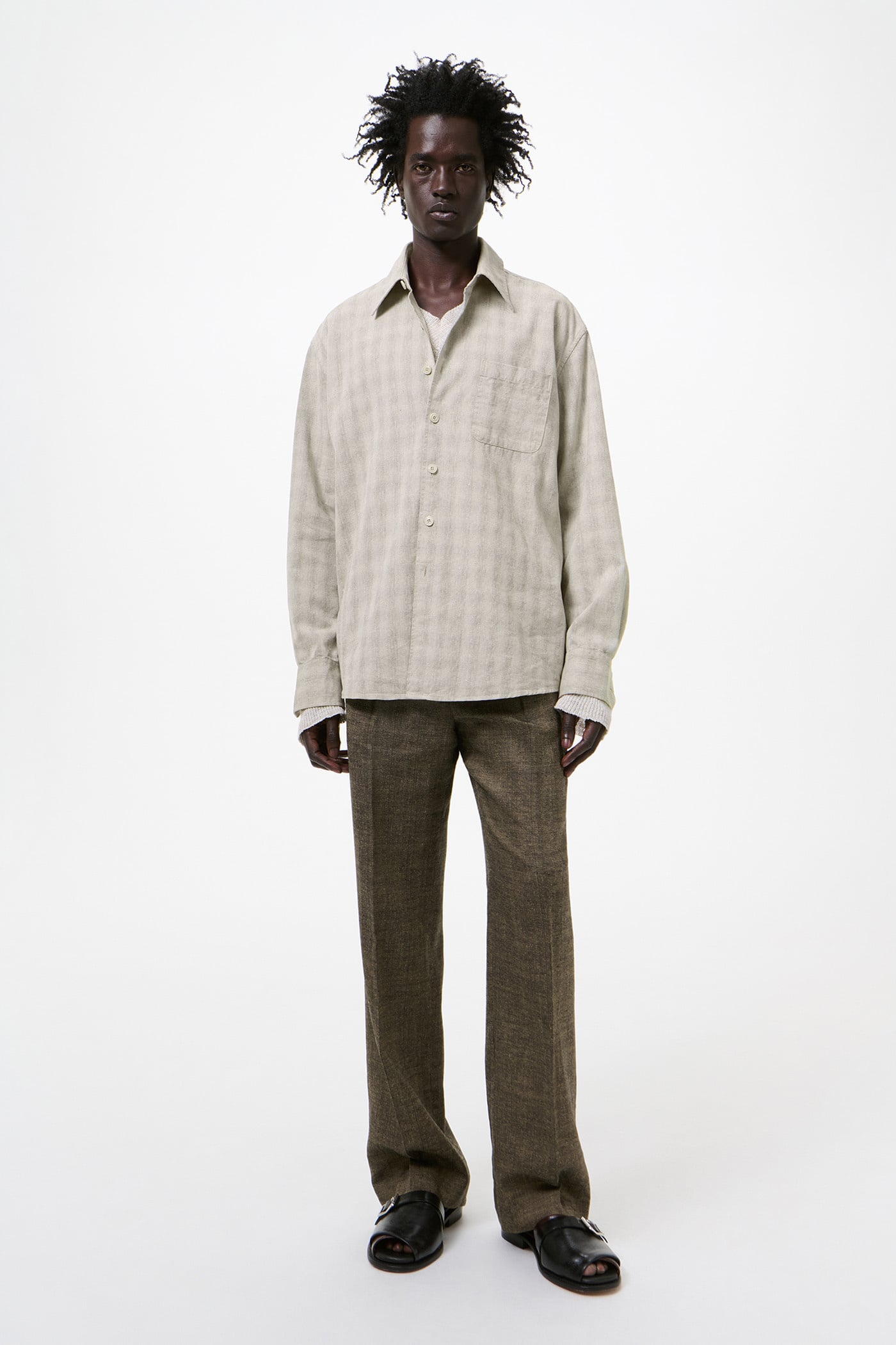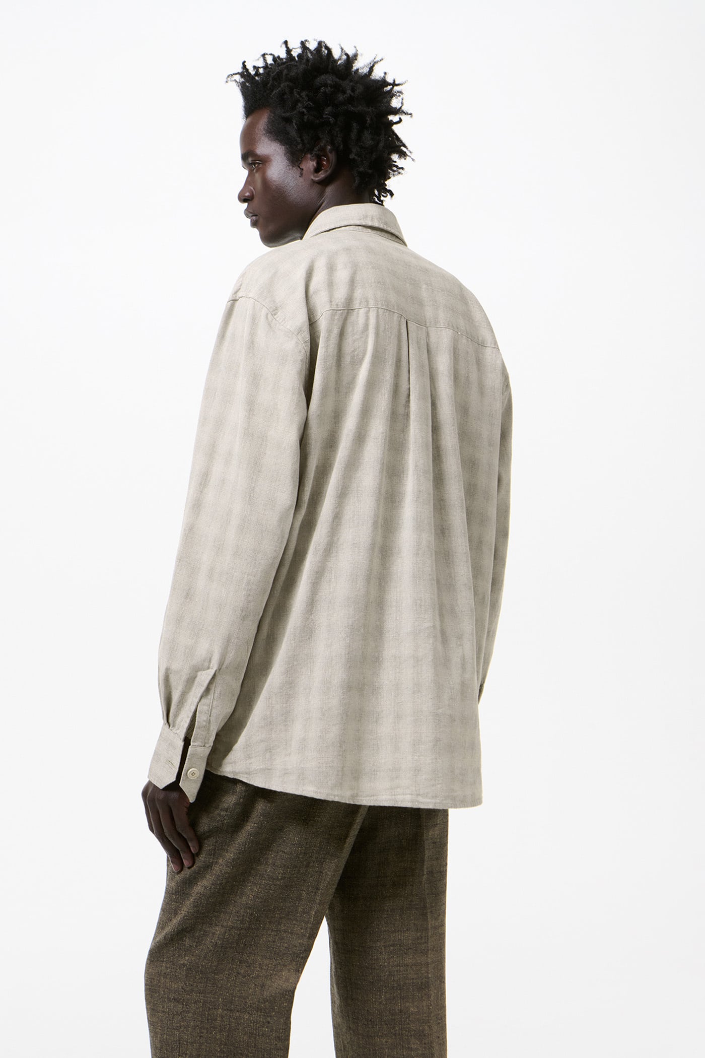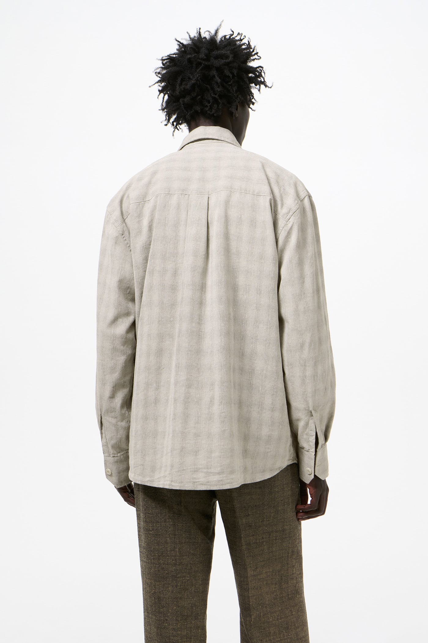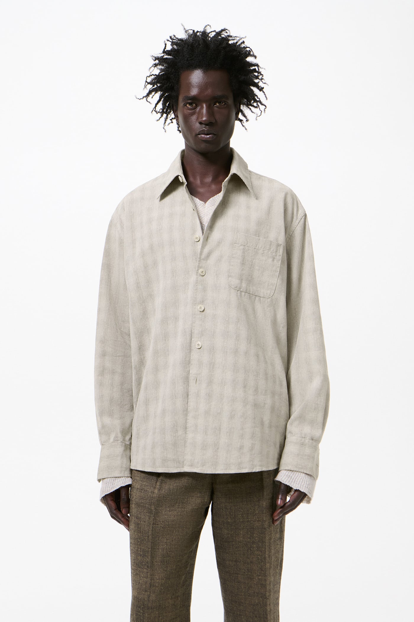 Our Above Shirt in Sage Trail Check Dryline Weave. Produced in an Italian cotton, linen and polyester blend fabric with a dryline weave and check pattern, the men's Above Shirt has a slightly oversized cut and features a single chest pocket, corozo buttons, a curved hem and mitered cuffs.
