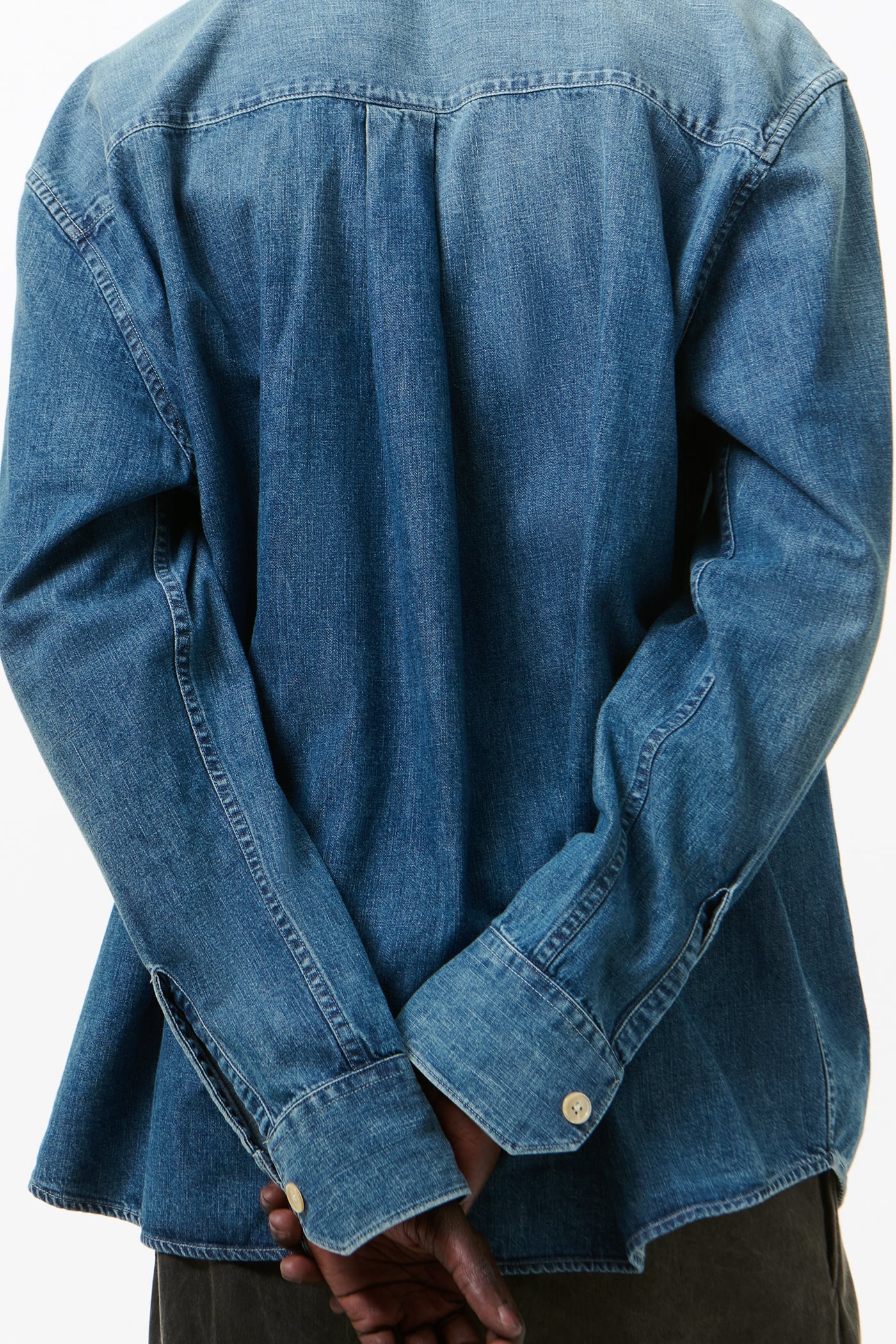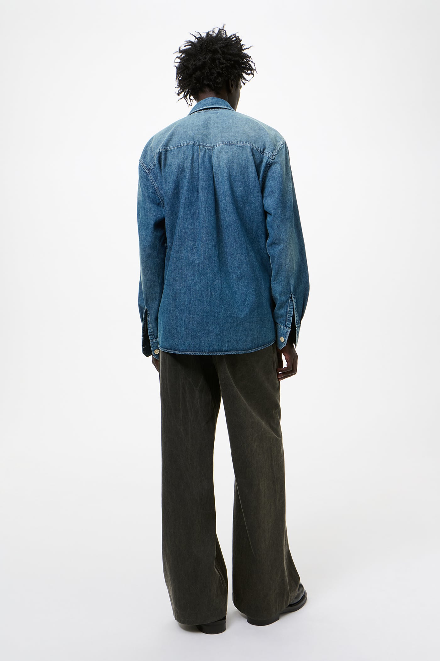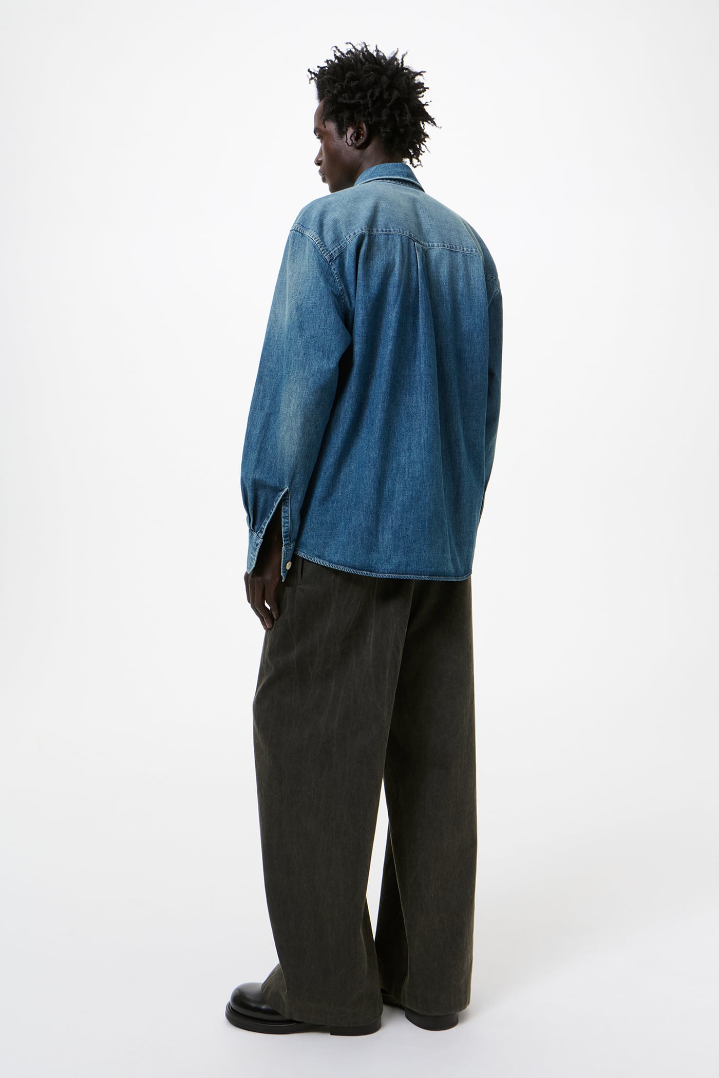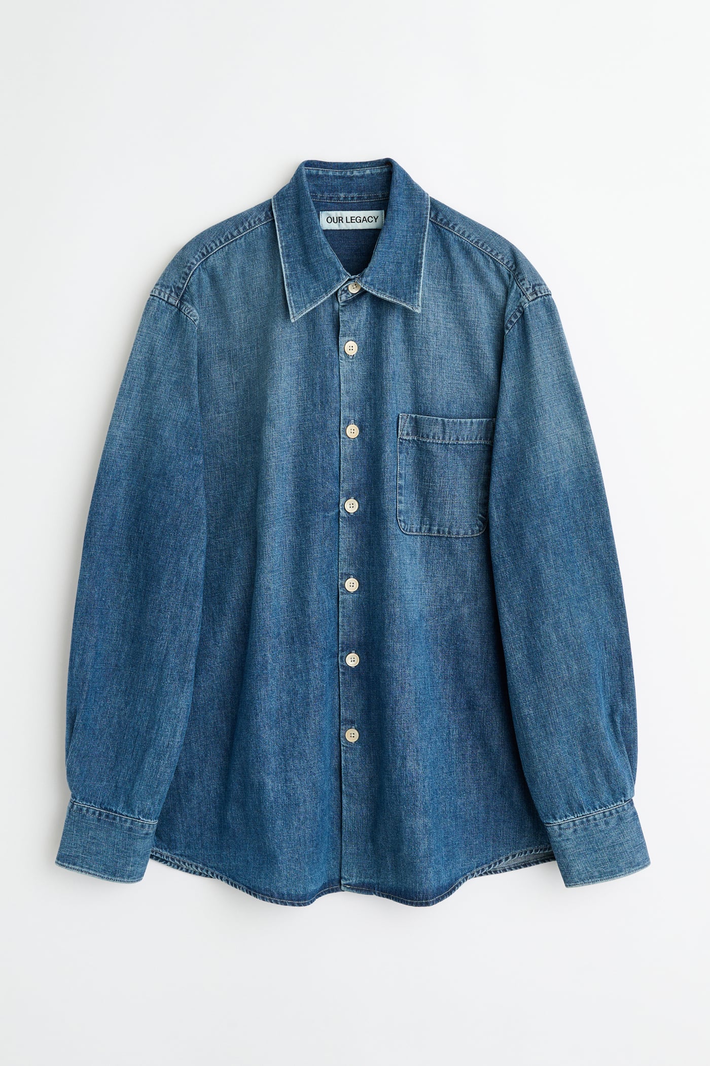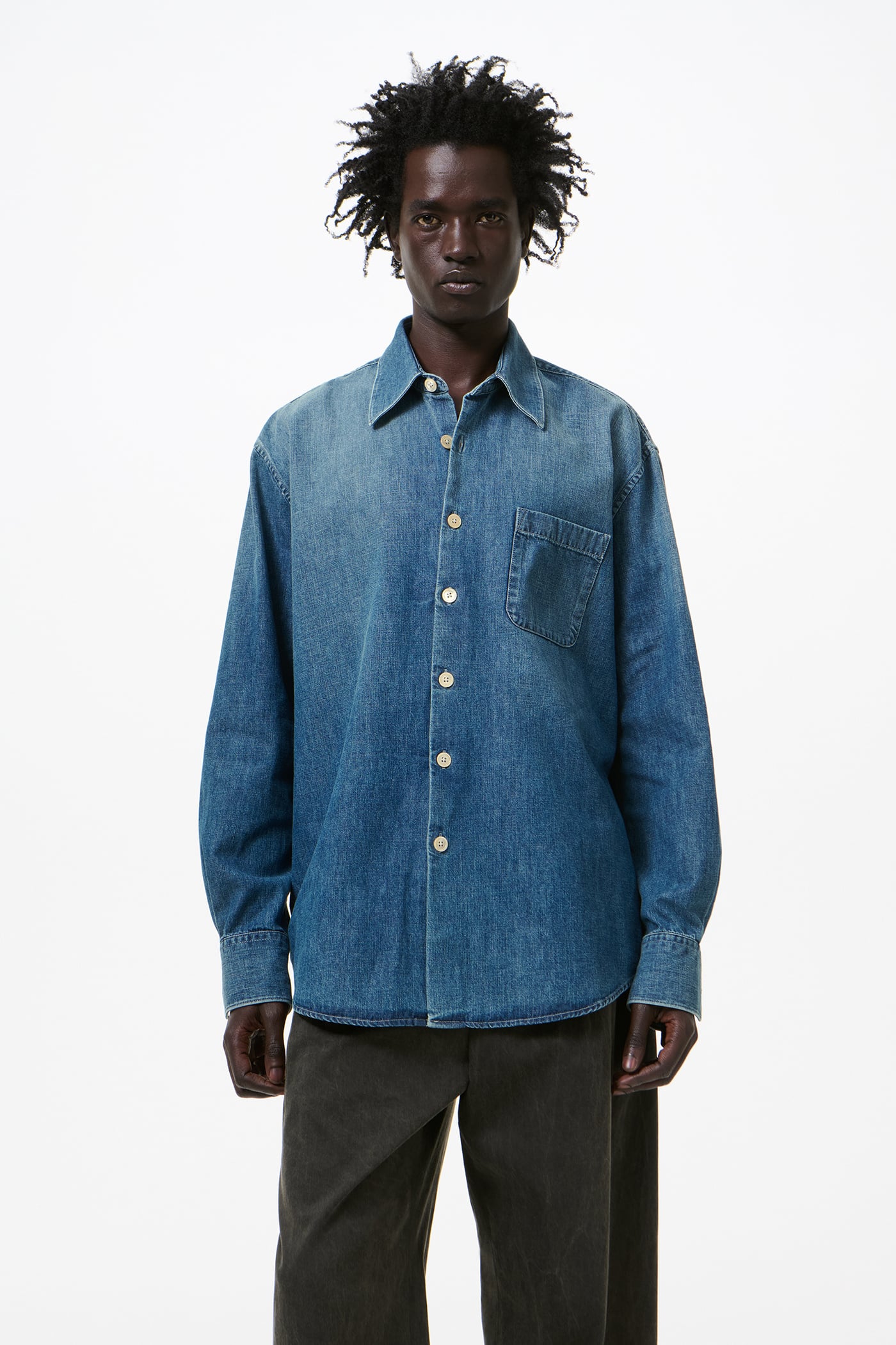 Our Above Shirt in Whatever Wash. Produced in an Italian organic cotton fabric with a vintage denim wash, the men's Above Shirt has a slightly oversized cut and features a single chest pocket, mother of pearl buttons, a curved hem and mitered cuffs.