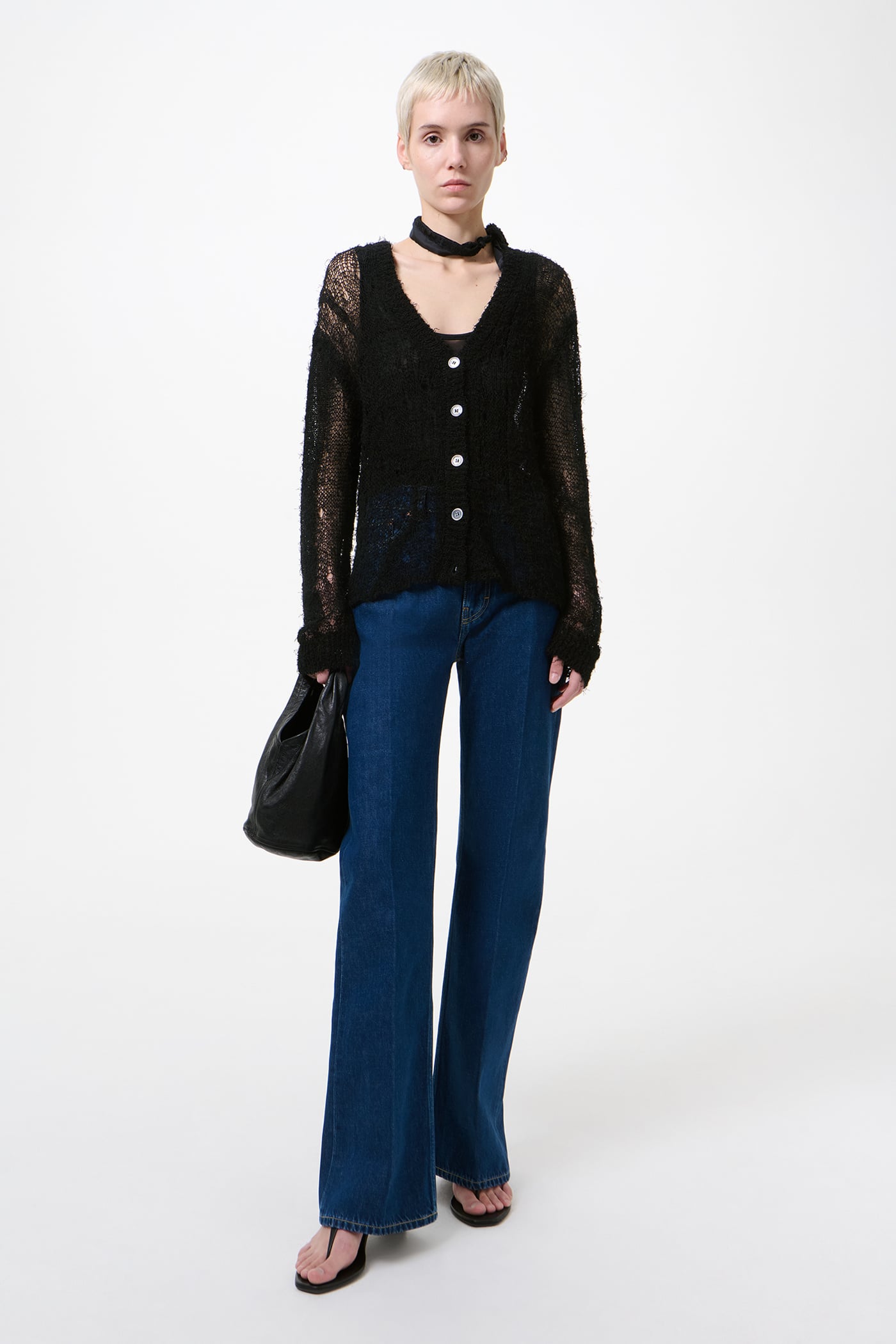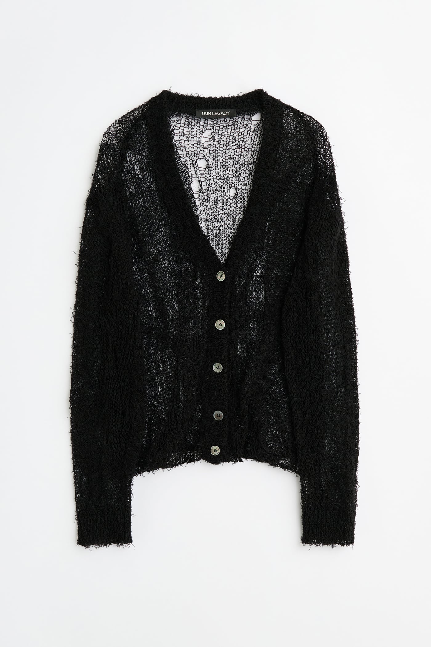 Our Academy Cardigan in Black Ragged Open Linen. Produced in an Italian linen, nylon and cotton yarn with a ragged, open-knit texture. The yarn’s lively, slightly fringed surface gives a tactile, organic character that will subtly evolve with wear. The Academy Cardigan has a relaxed fit with dropped shoulders and features a V-neck, a ribbed placket, mother of pearl buttons, and ribbed cuffs and hem.