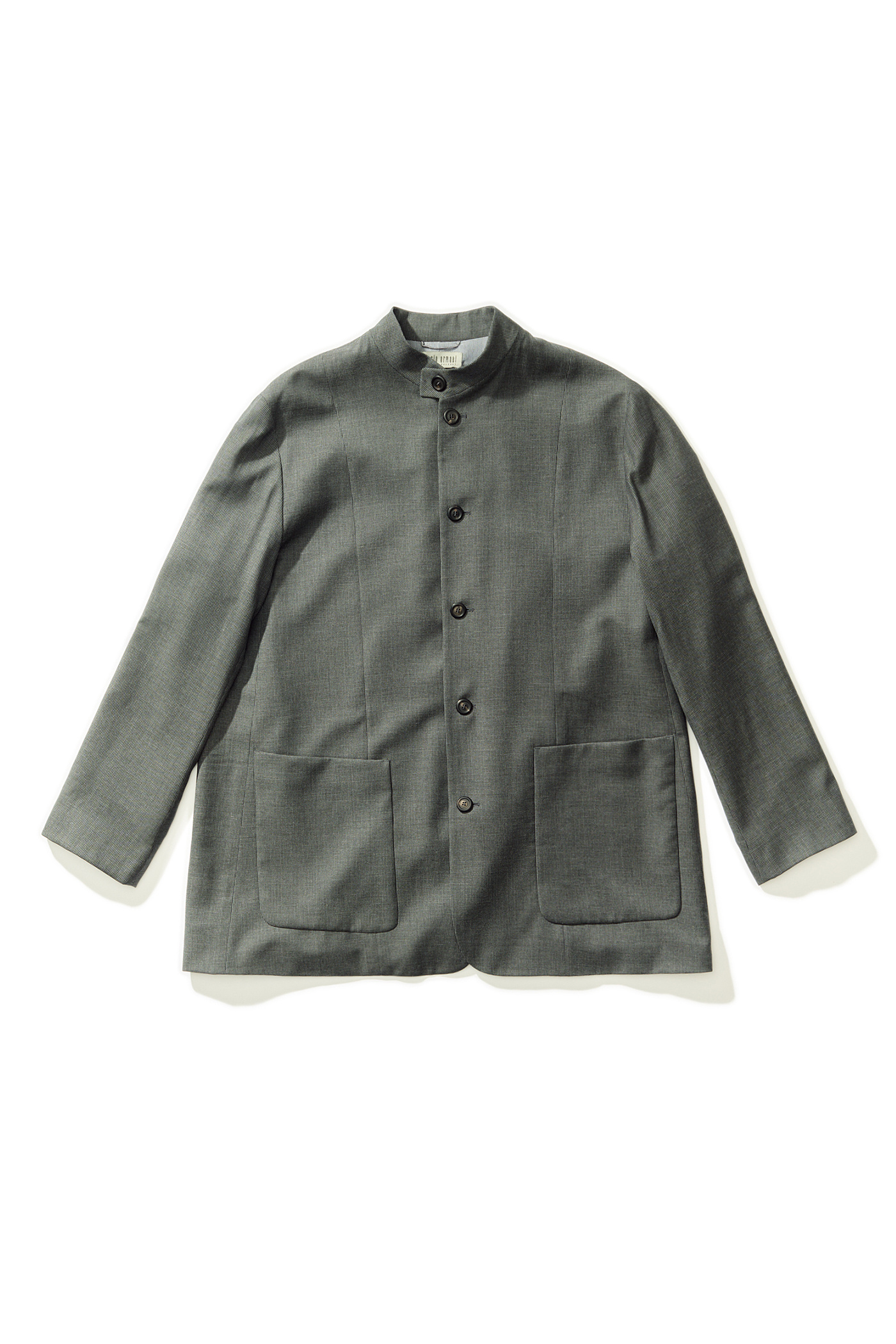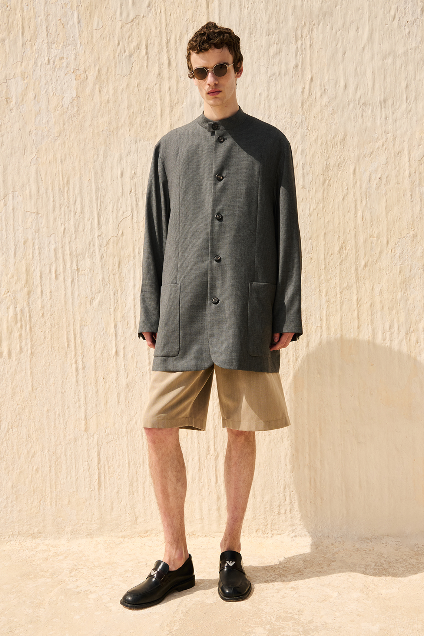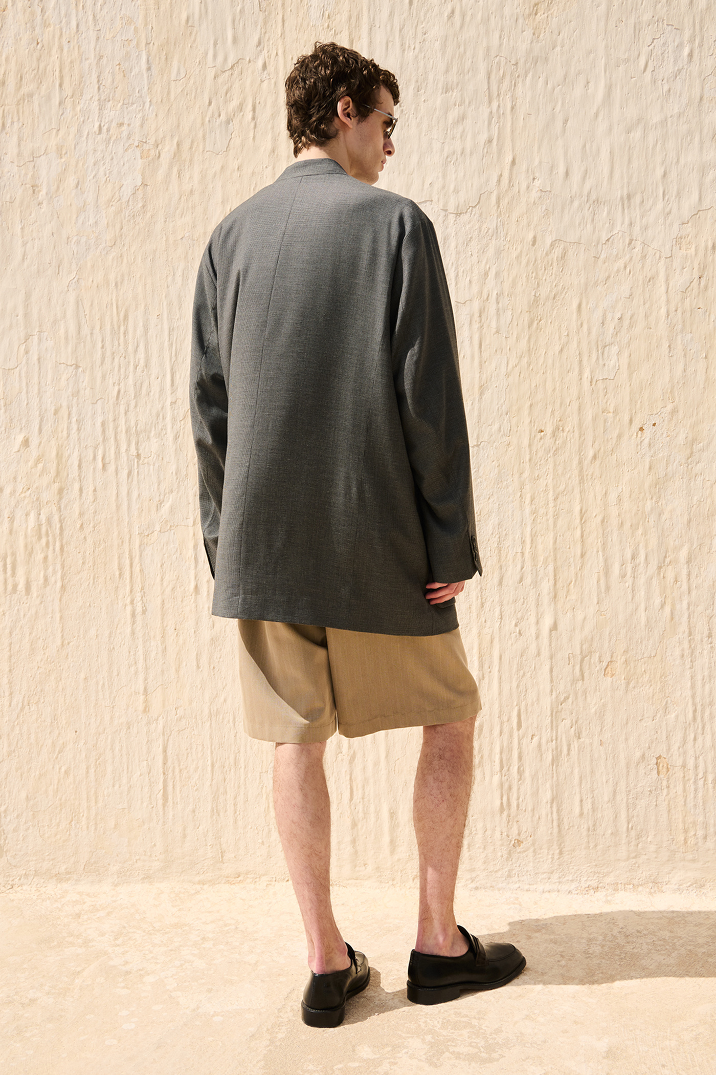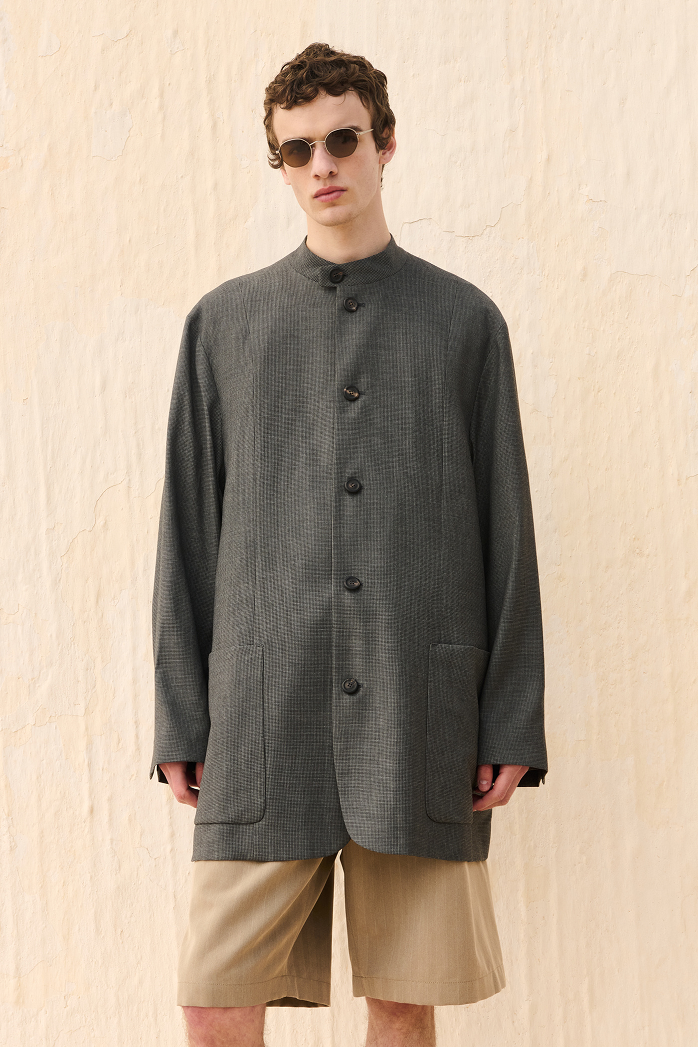 Our Ampolla Blazer in Foschia Nuvolosa Weave. Crafted from premium Italian deadstock fabric in wool and viscose blend, our Ampolla Blazer features a distinctive stand collar, horn button closure, practical patch front pockets, and a welt inner pocket. The design is completed with vented sleeves with buttons and a full lining for added structure and comfort.