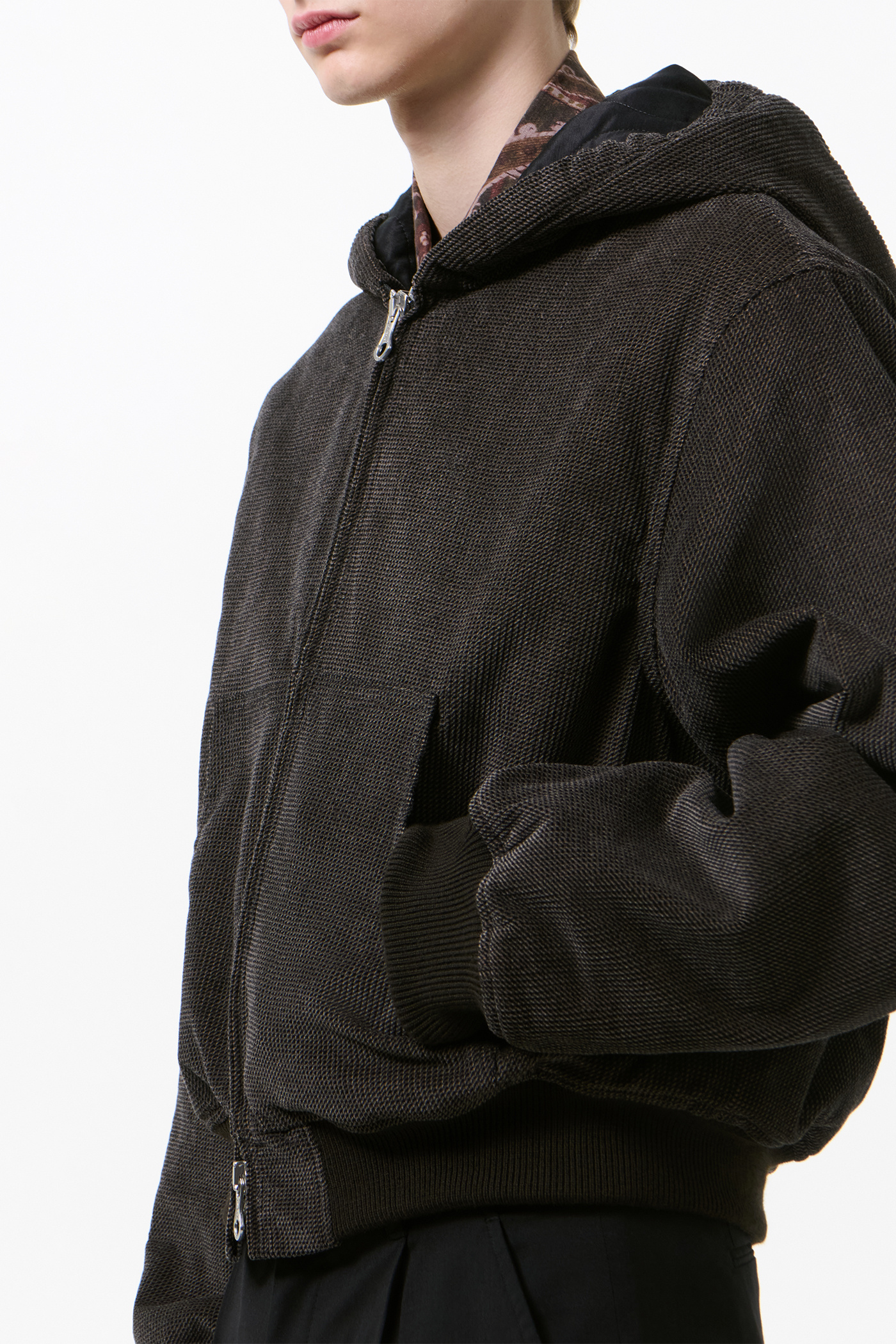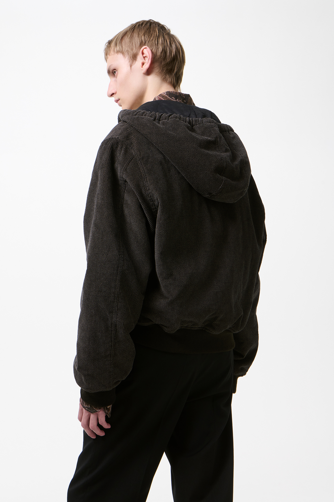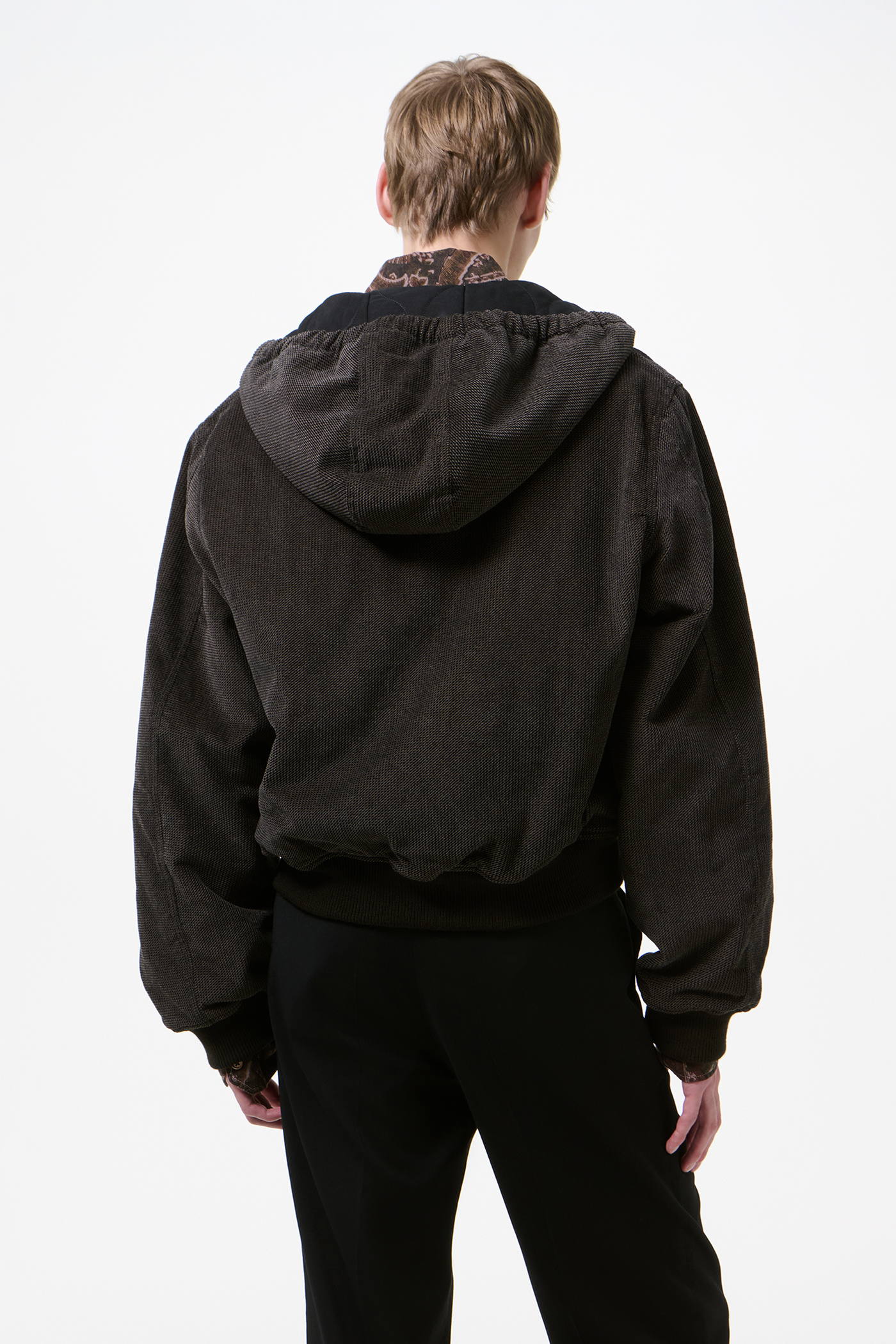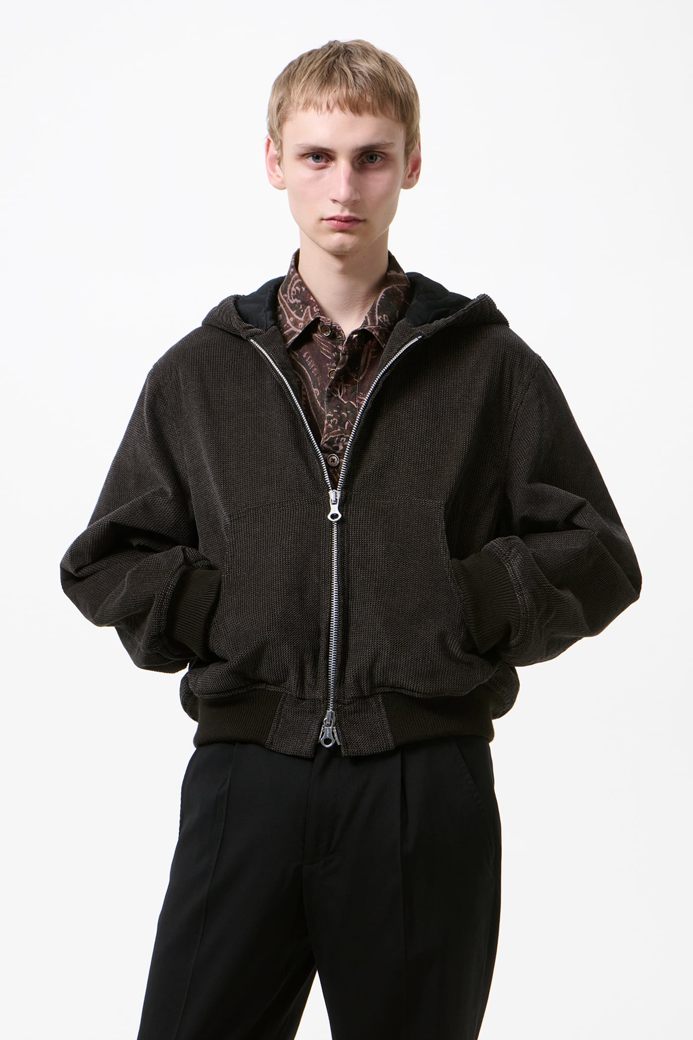 Our Bank Jacket in Dark Brown Twill Cord. Produced in Chinese cotton twill corduroy fabric, the men's Bank Jacket has a relaxed, boxy fit and features an elasticated hood, a distressed Lampo two-way zip, pouch pockets, and ribbed cuffs and hem.