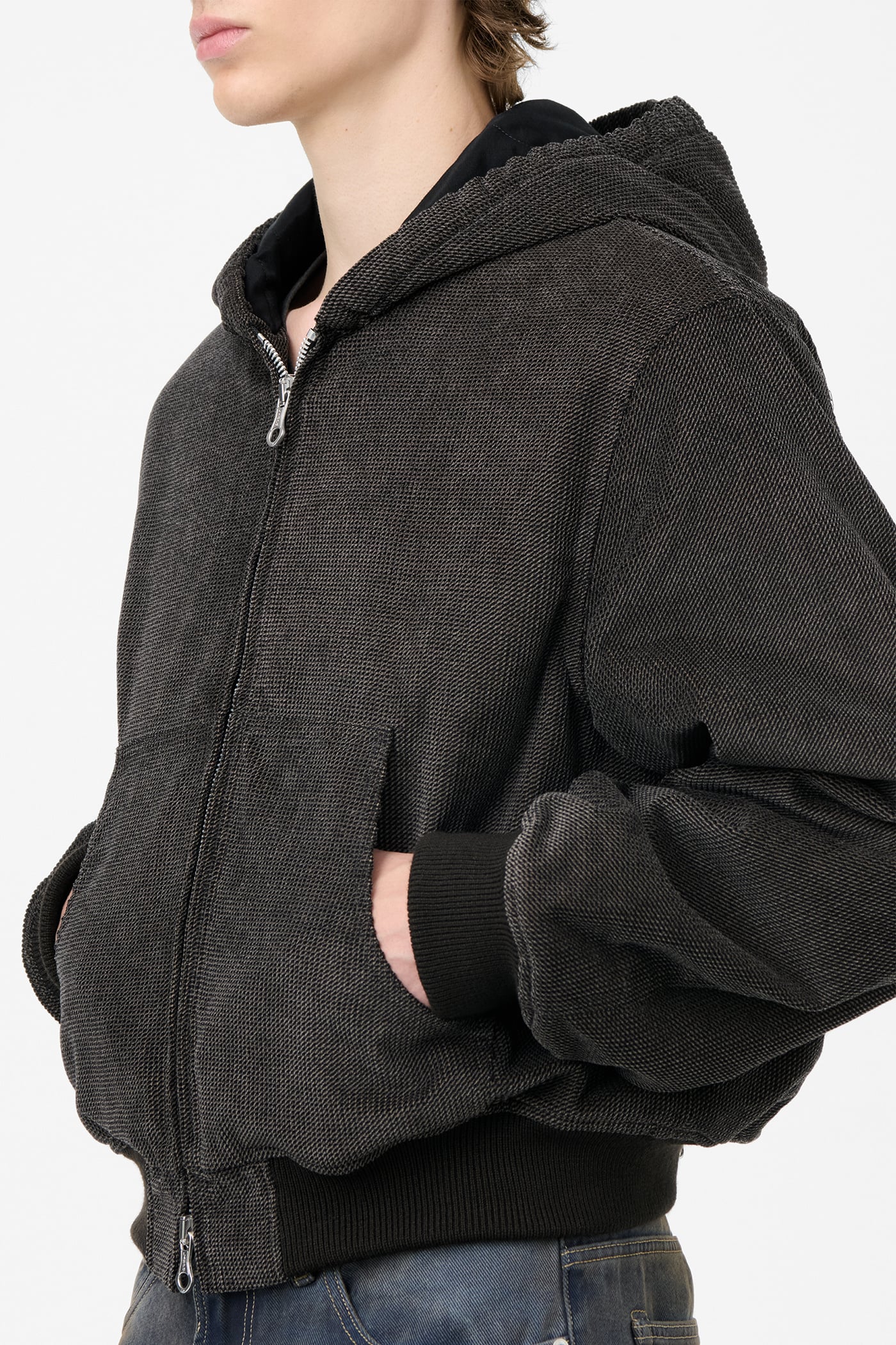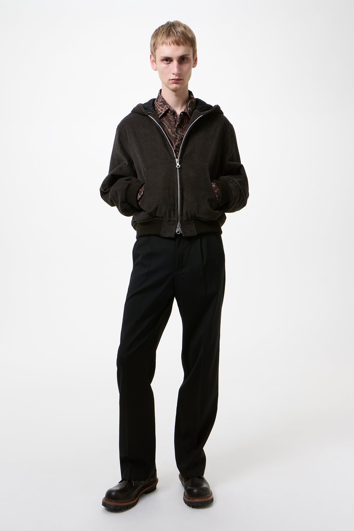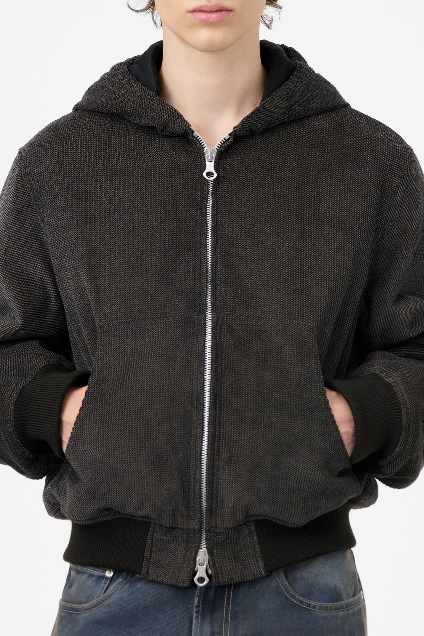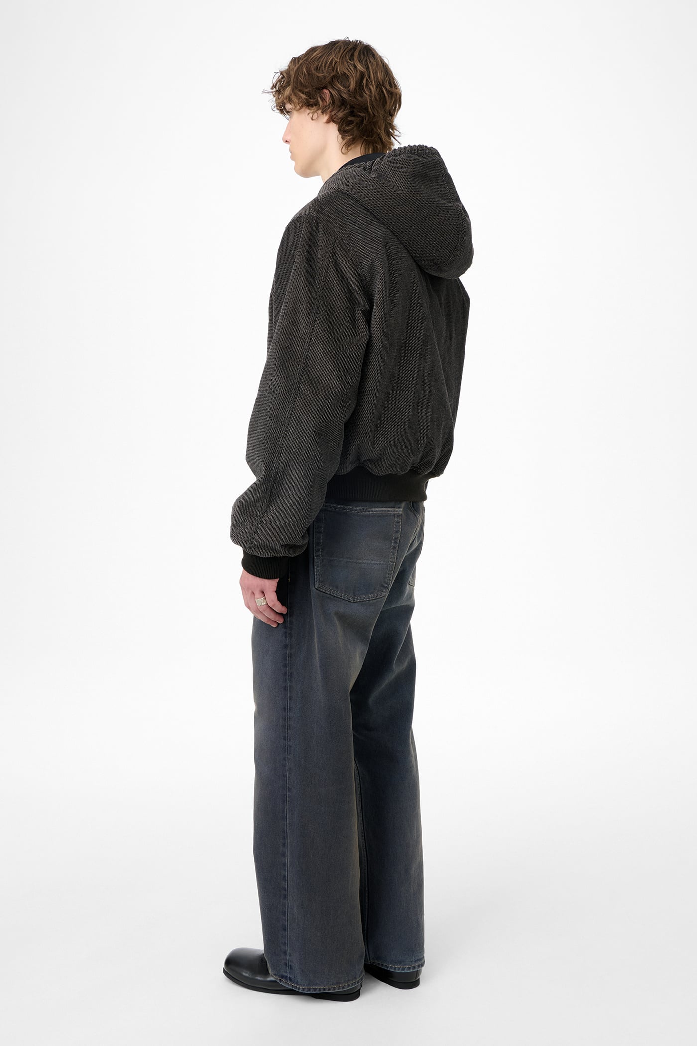 Our Bank Jacket in Dark Brown Twill Cord. Produced in Chinese cotton twill corduroy fabric, the men's Bank Jacket has a relaxed, boxy fit and features an elasticated hood, a distressed Lampo two-way zip, pouch pockets, and ribbed cuffs and hem.