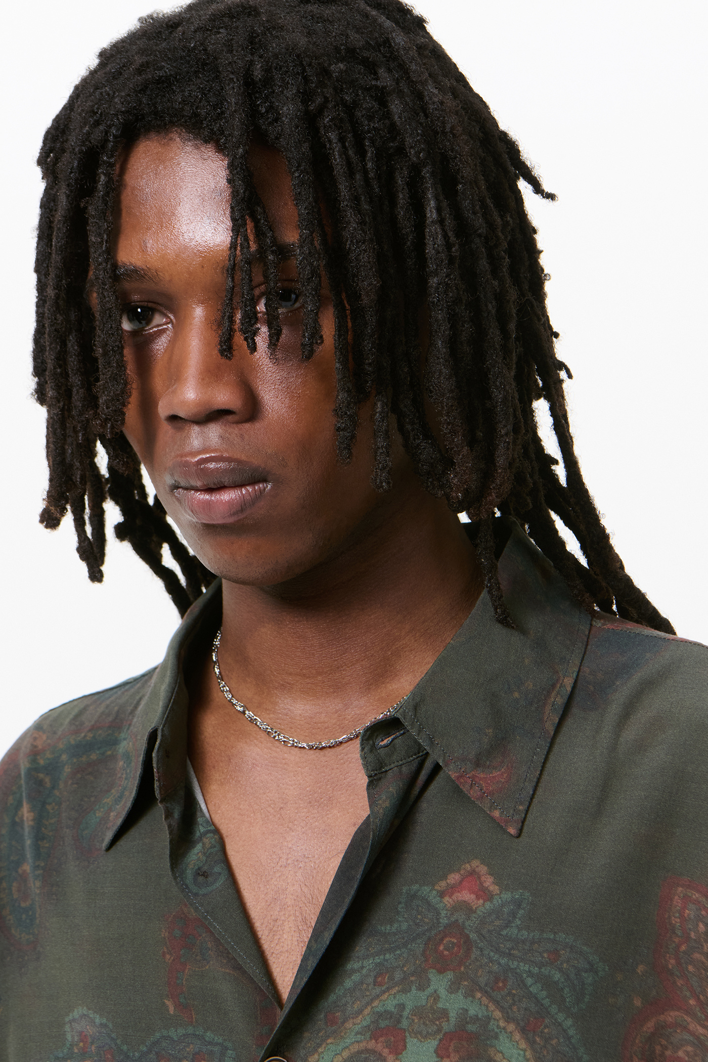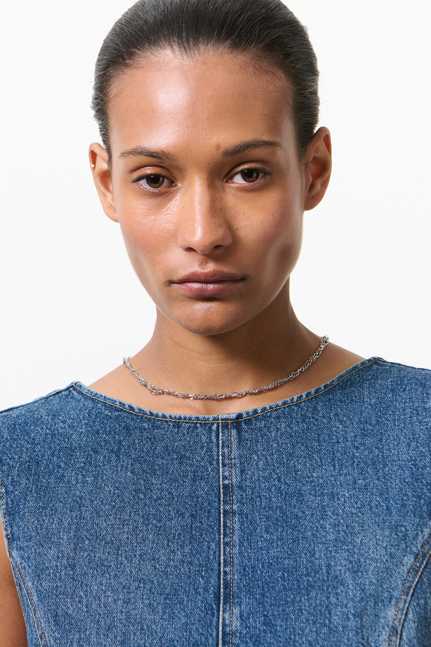 Our Barbwire Necklace in Surgical Brass. Our own development of a classic Figaro chain twisted around itself, creating the appearance of soft barbwire. This mid-length necklace features a lightweight construction with a shiny silver finish and is crafted from brass in Italy.