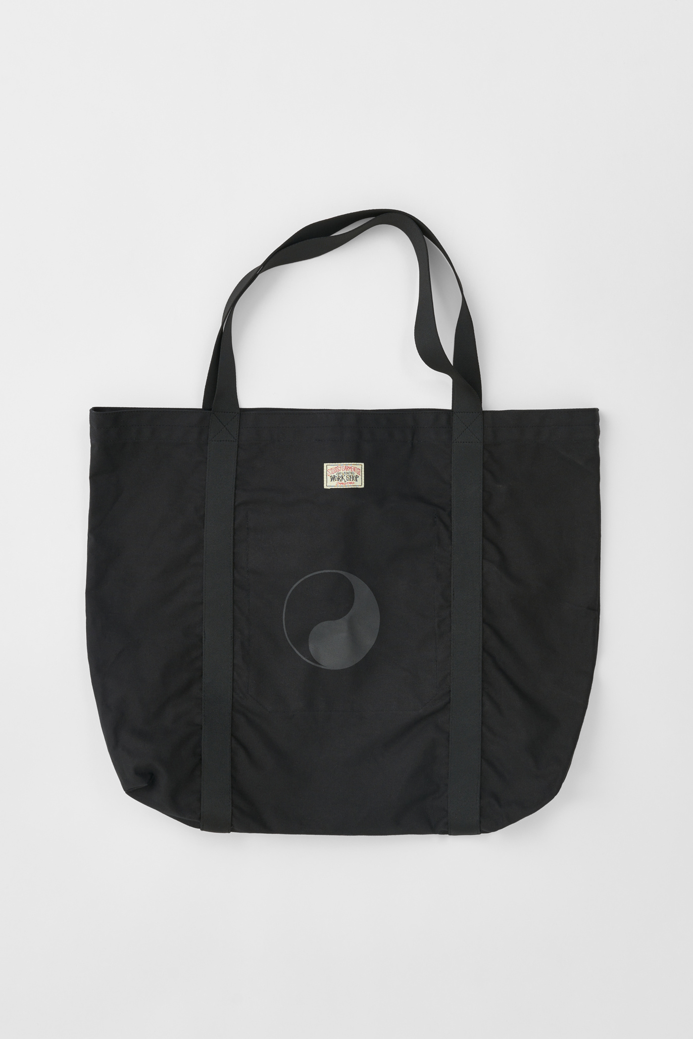 WORK SHOP X STÜSSY Beach Bag in Black. Produced in a dead stock Scottish dry wax cotton fabric, the Beach Bag has a large central compartment, Yin Yang and Stüssy prints, nylon shoulder straps and an internal patch pocket.