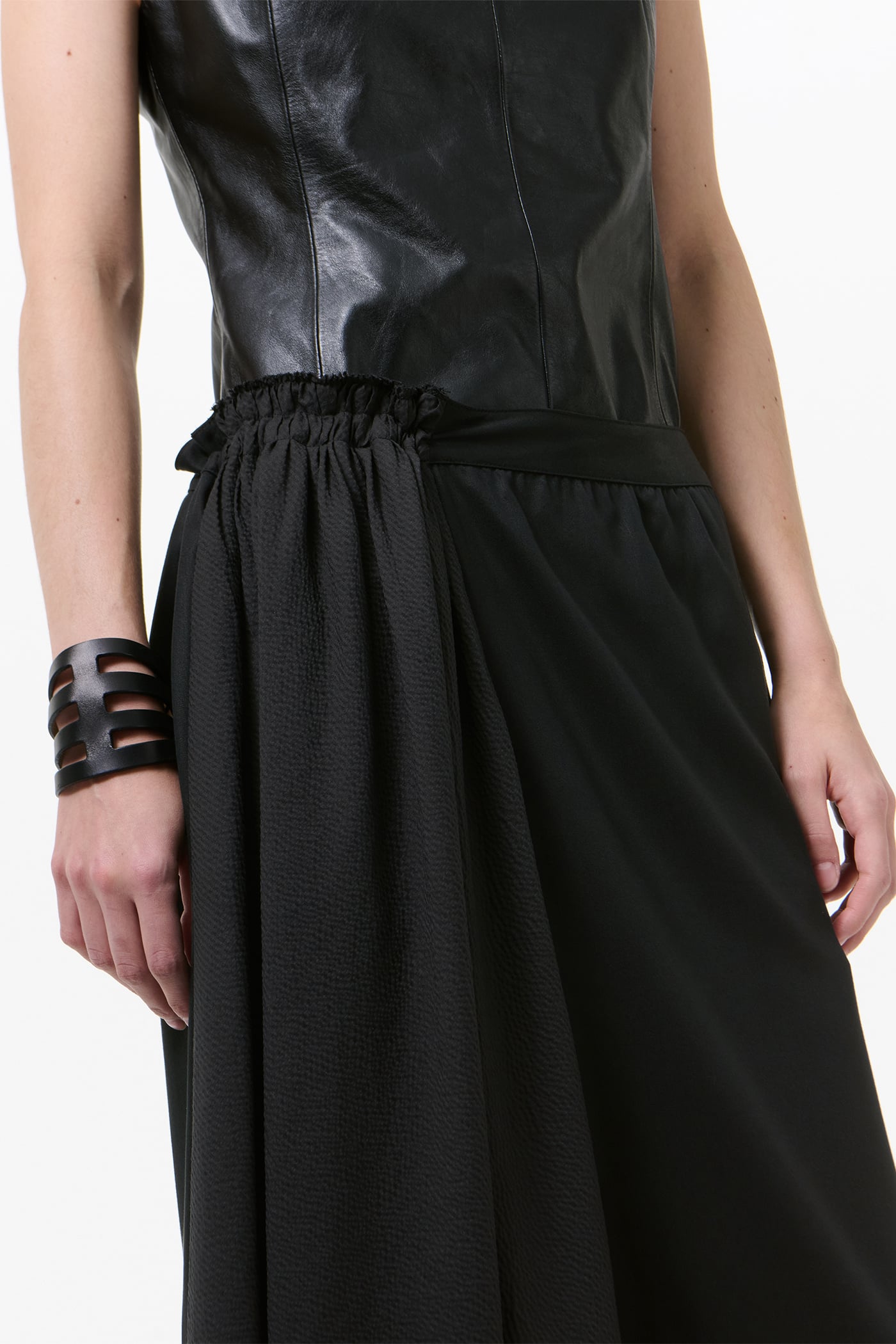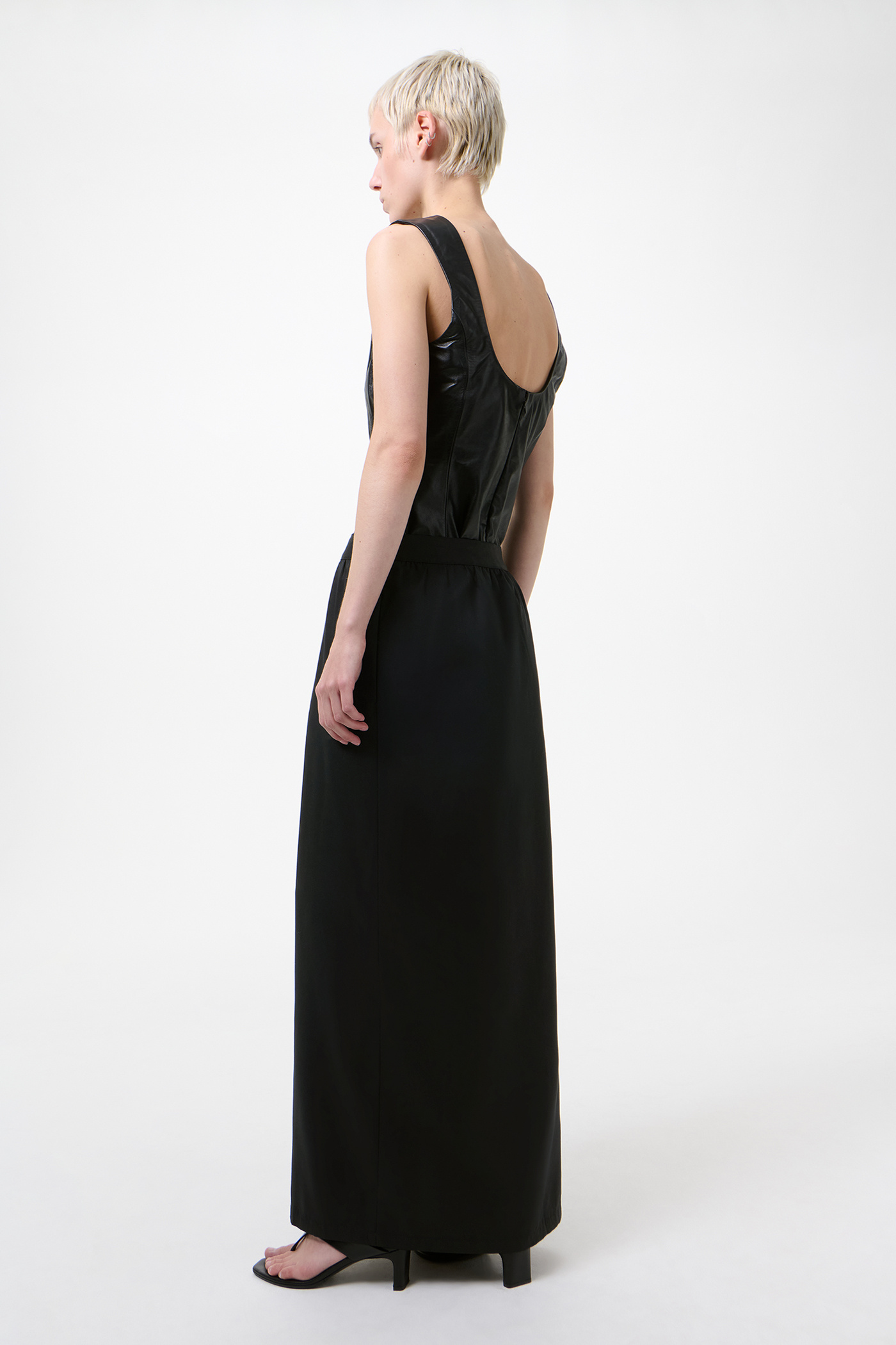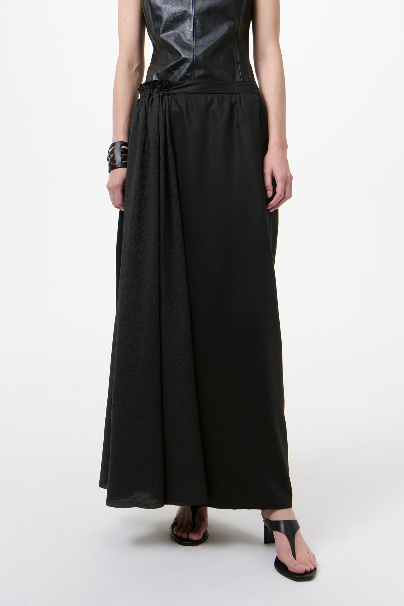 Our Beach Skirt in Draping Black Lyocell. Produced in a Portuguese lyocell fabric, the women's Beach Skirt has an elongated straight silhouette and features a gathered front panel, an internal right-side drawstring to adjust the waistband to the desired fit, and functional inseam pockets. The one-size construction accommodates multiple sizes and can be styled to drape with ease.