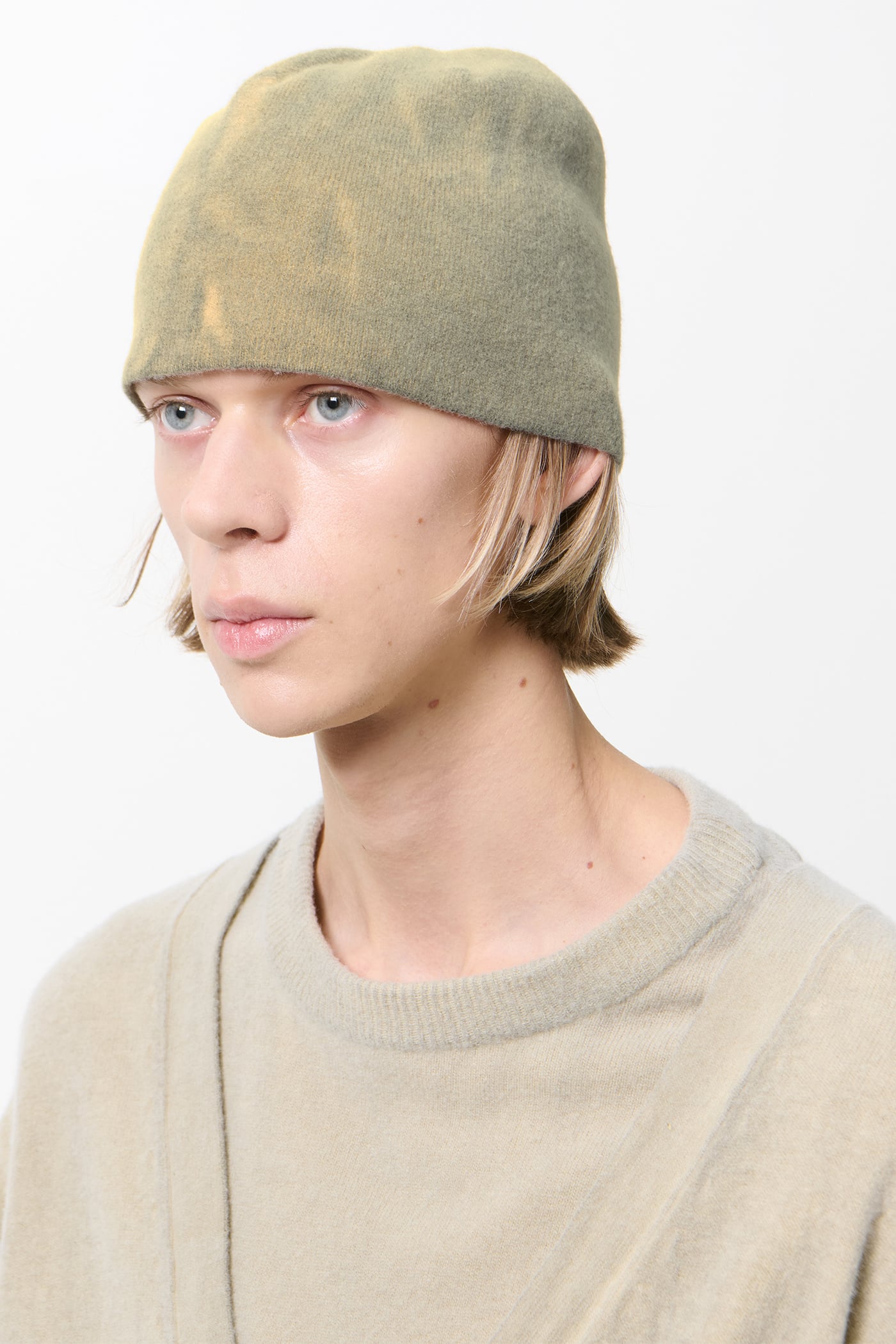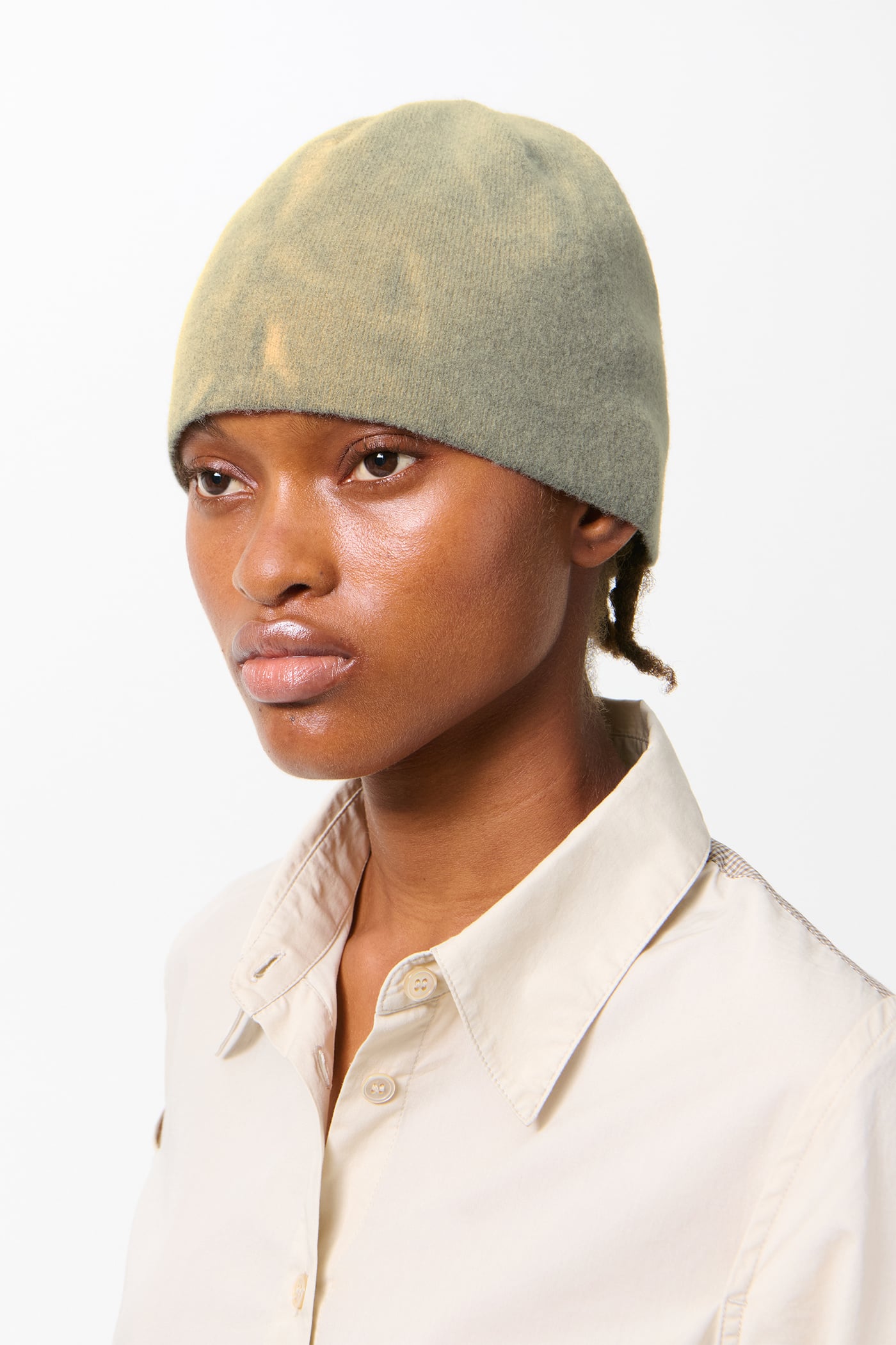 Our Beanie in Moss Spray Dye Cherub Wool. Produced from Italian merino wool yarn in a Milano stitch knit, the beanie has a simple construction with a darted crown and a soft, breathable hand. Finished with a spray-dyed treatment that creates nuanced tonal gradients, making each piece unique. One size.