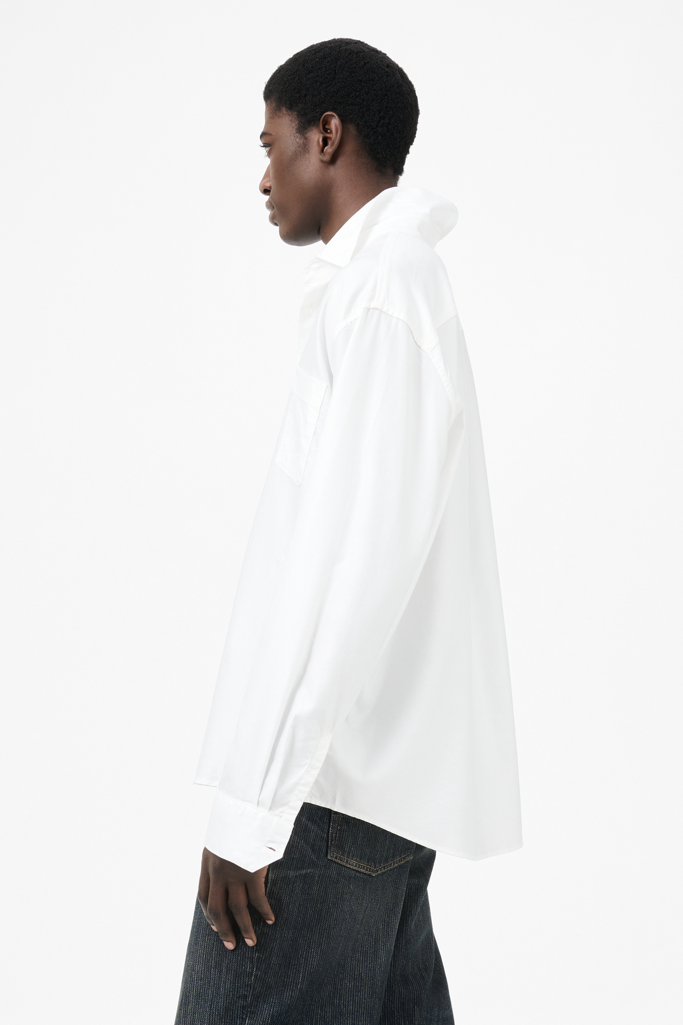 Our Beyond Shirt in Static White Liquid Oxford. Produced in Portuguese Tencel fabric, the men's Beyond Shirt has a regular, straight fit and features mother of pearl buttons, a curved hem and straight body construction.