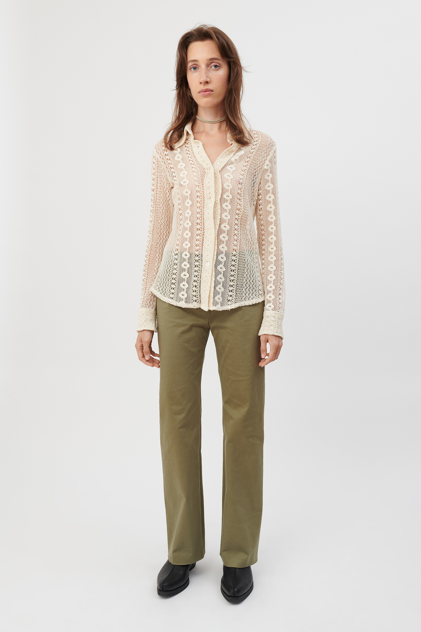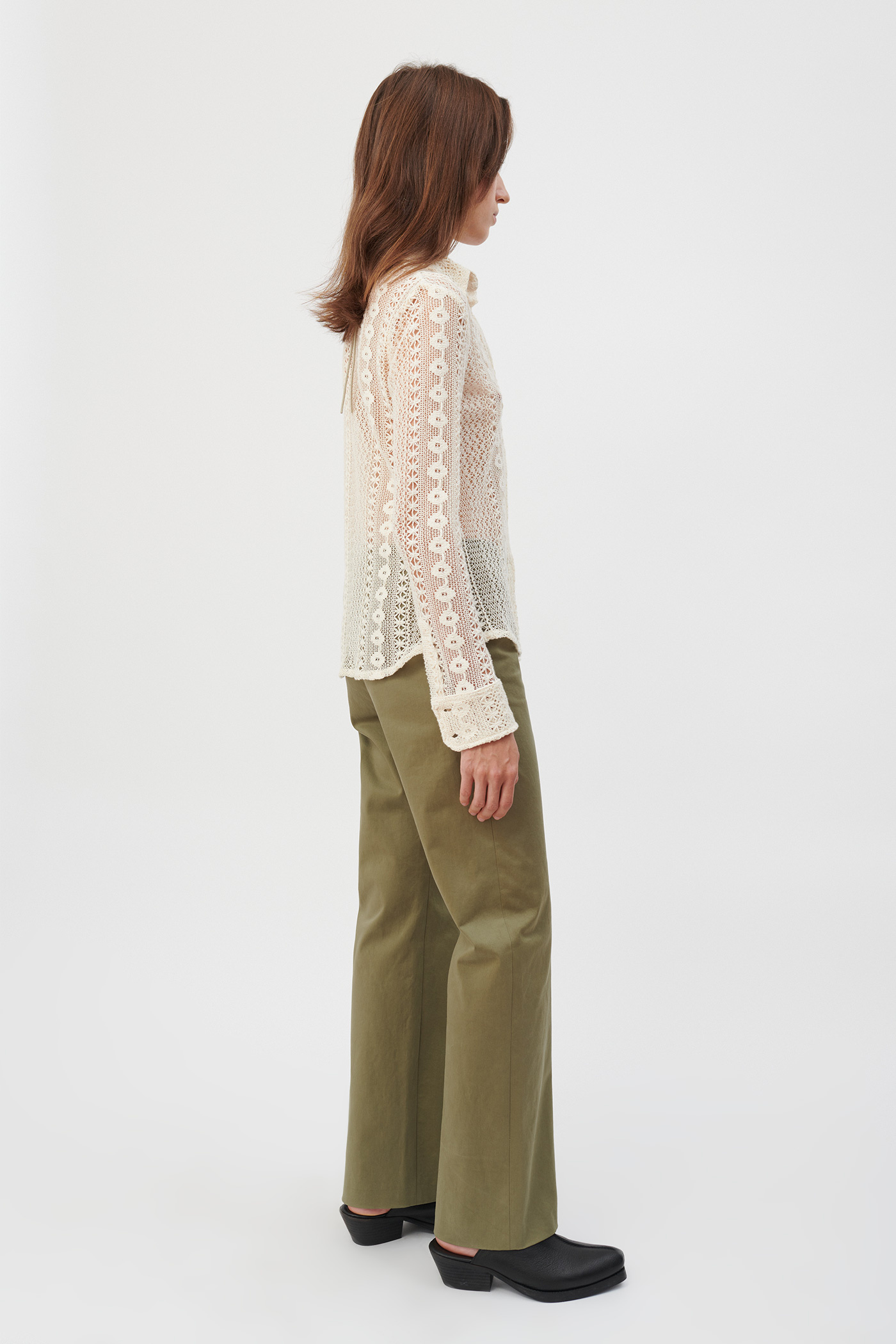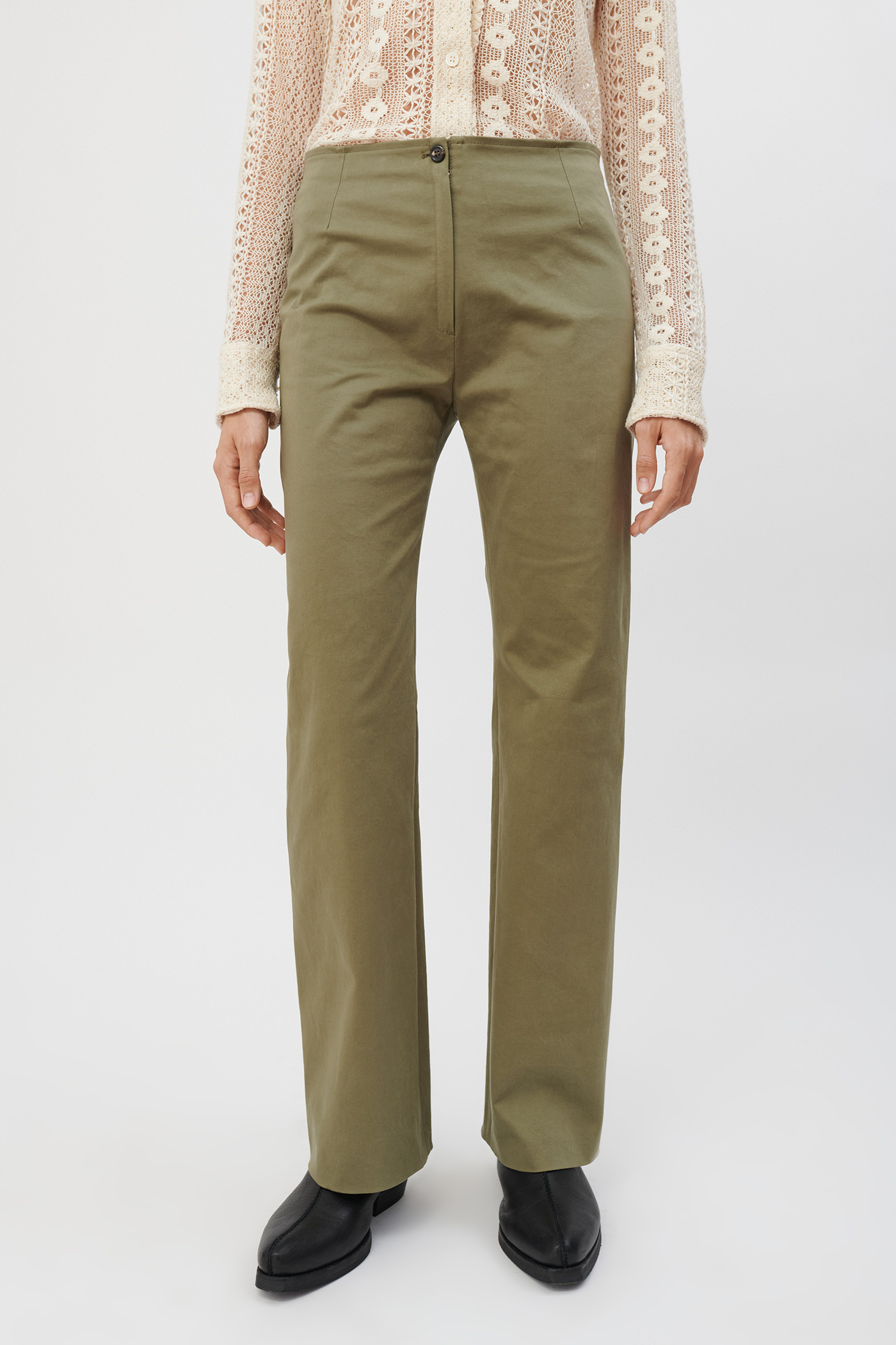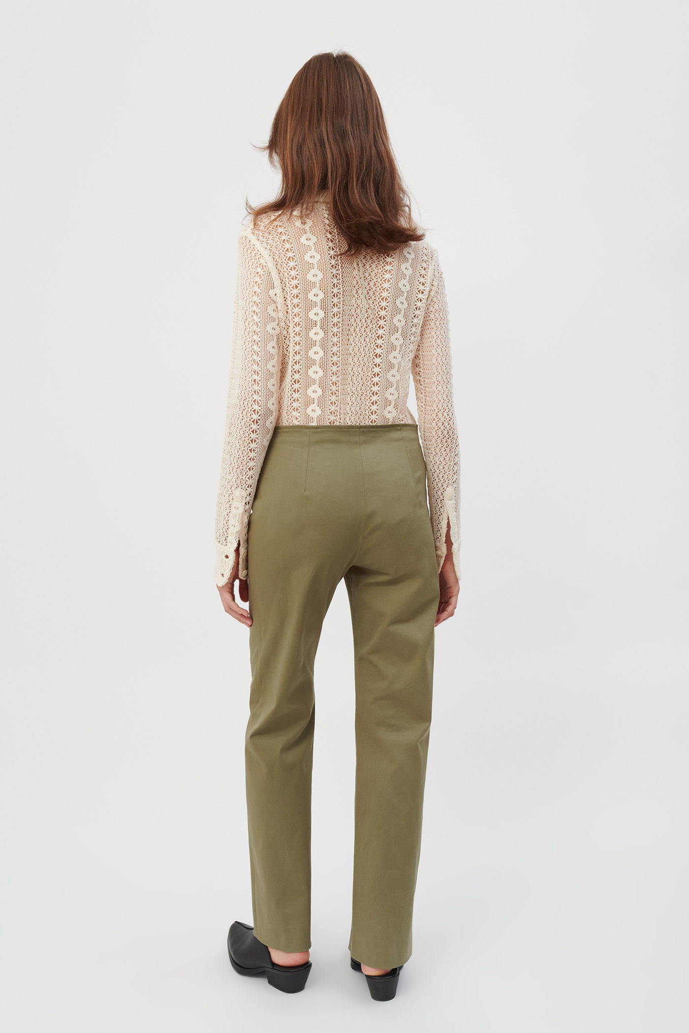 Our Biker Trouser in Army Green Cotton. Produced in 98% Cotton and 2% Elastane, the Biker Trousers are high waisted with a straight fit, a YKK zip fly and a snap button closure.