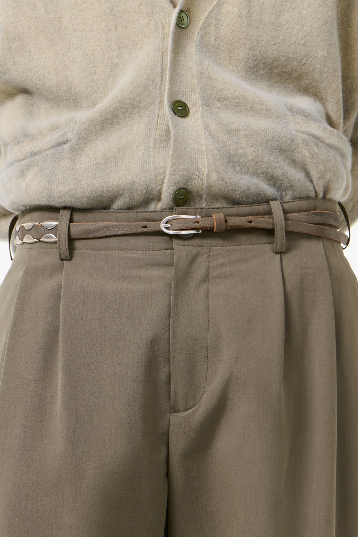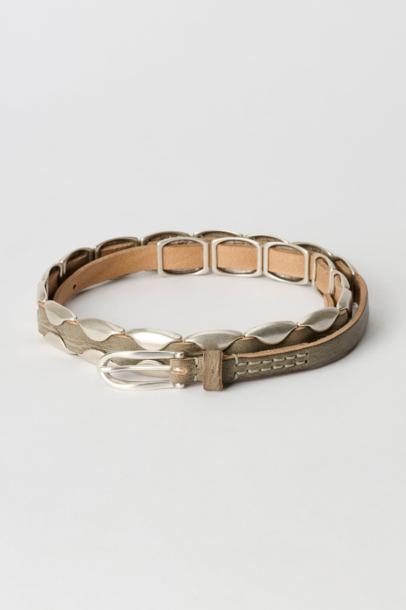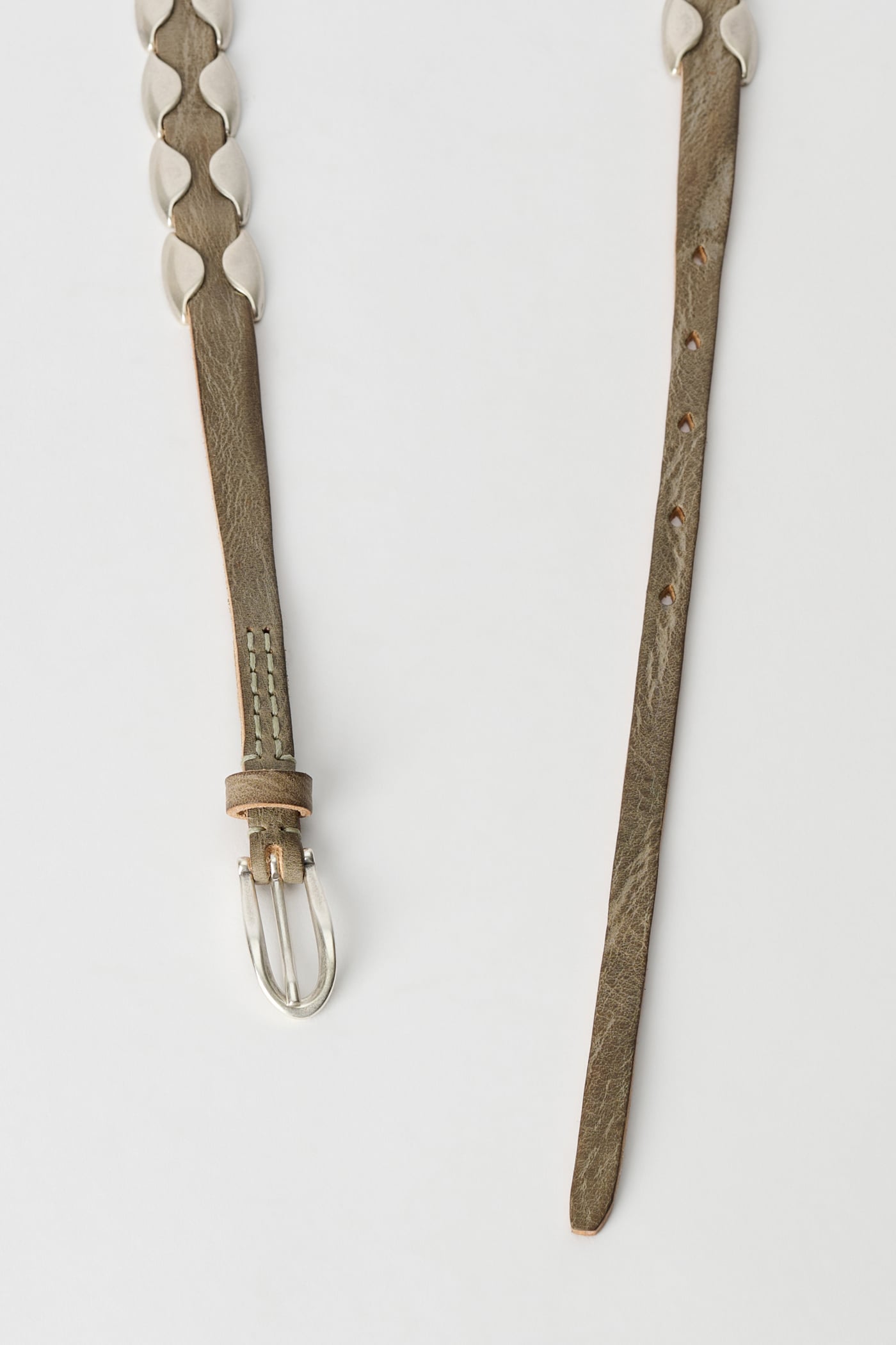 Our Billow Belt in Overcast Blue Leather. Produced in Italian cow leather, this 1 cm belt is detailed with sliding studs along its full length for adjustable rivet placement, and features a metal pin buckle, a leather keeper and arrives with a dust bag.