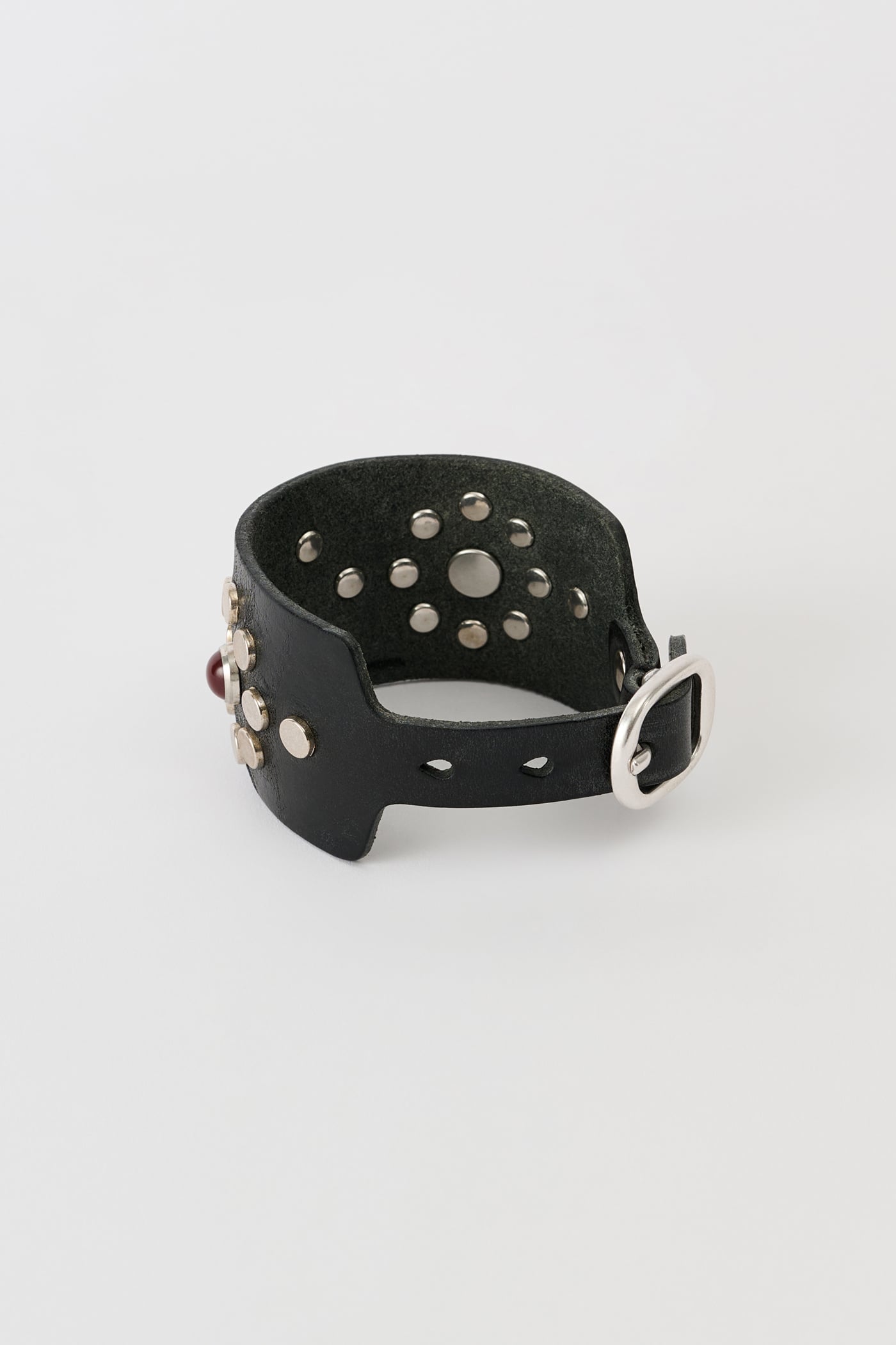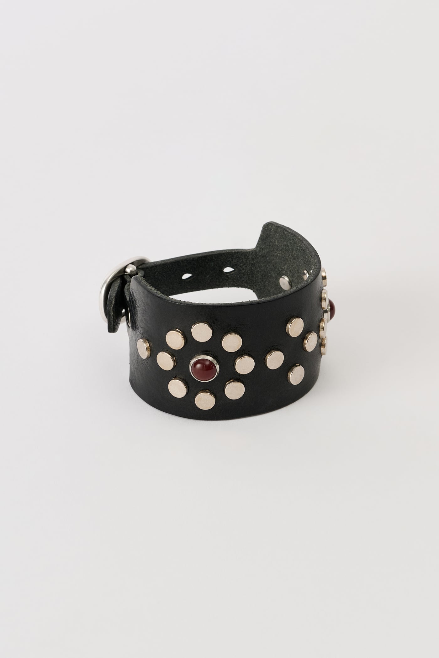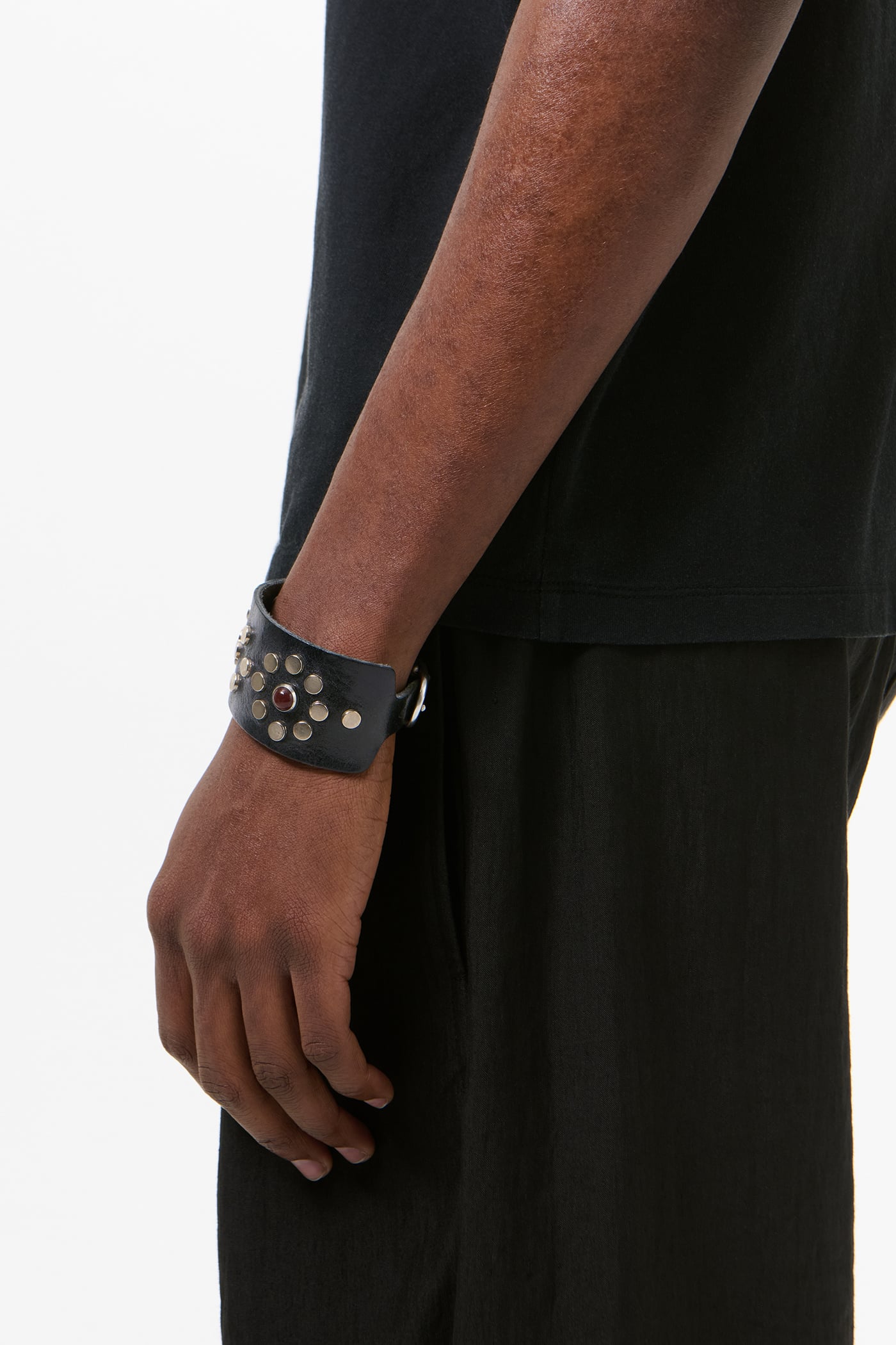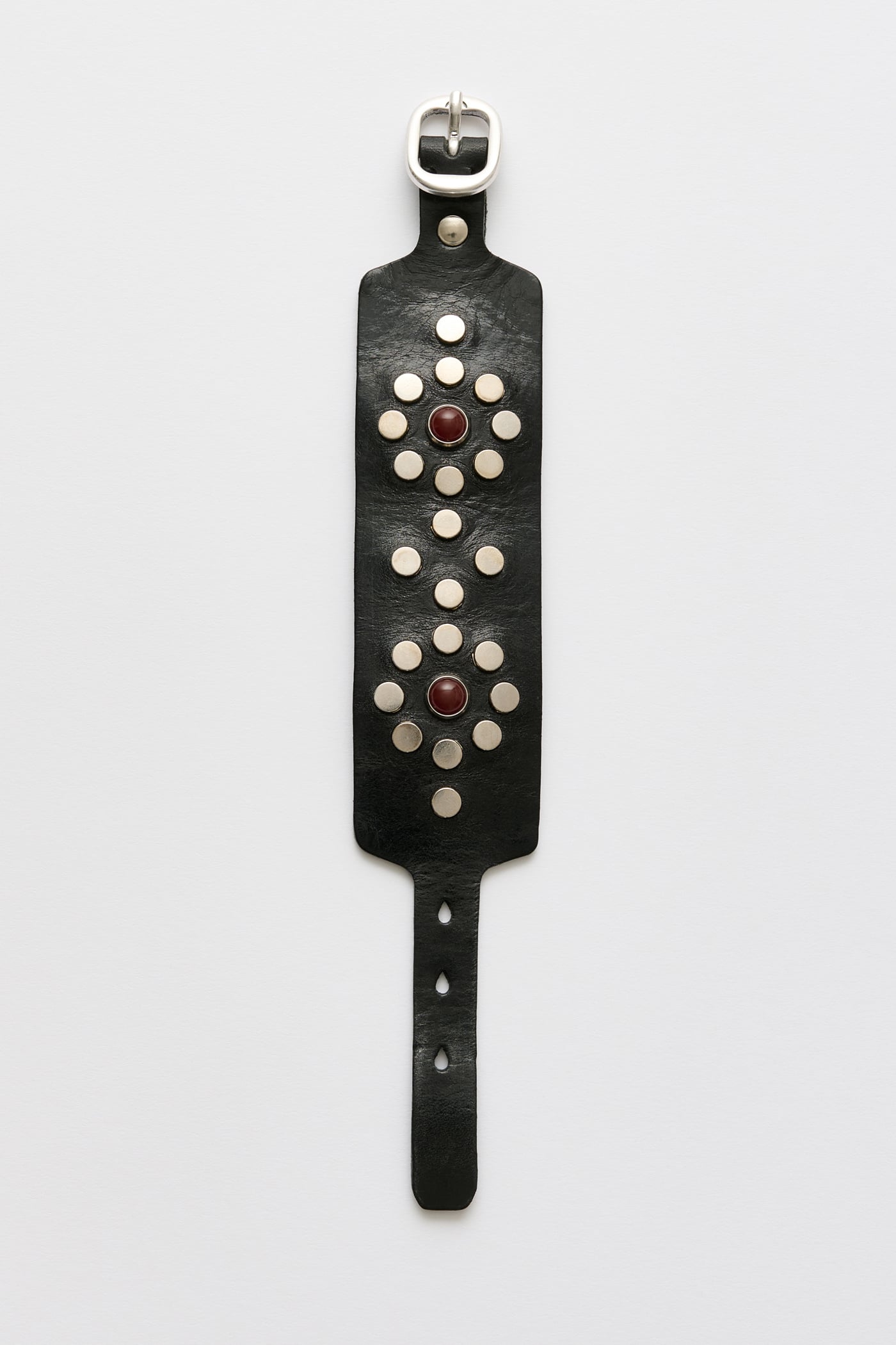 Our Blossom Bracelet in Flecking Black Leather. Produced in Italian cow leather, the Blossom Bracelet is hand cut and 3.5 cm wide, and features a flower studded design, an adjustable fit and a metal pin buckle closure.