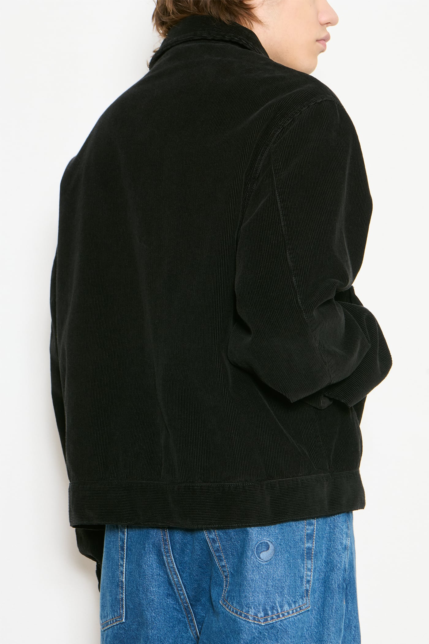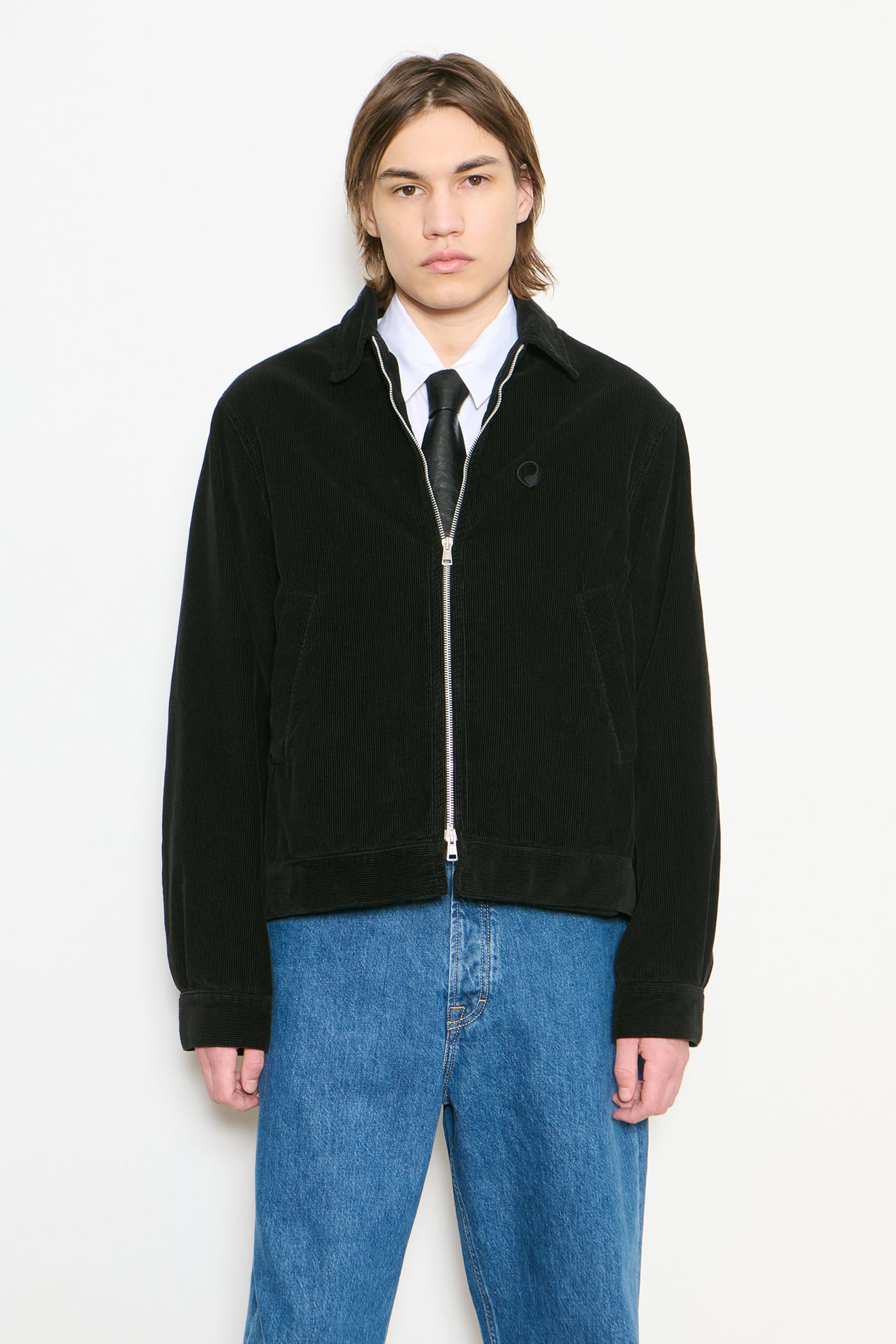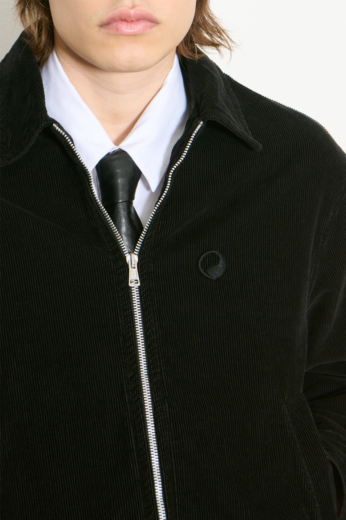 Our Blouson Jacket in Overdyed Black Cord. Produced in Italian deadstock cotton corduroy with an overdyed black finish, the Blouson Jacket has a relaxed, boxy fit and features a two way zip closure, two welt pockets, horn cuff buttons, a Yin Yang chest embroidery, a straight hem and a full lining.