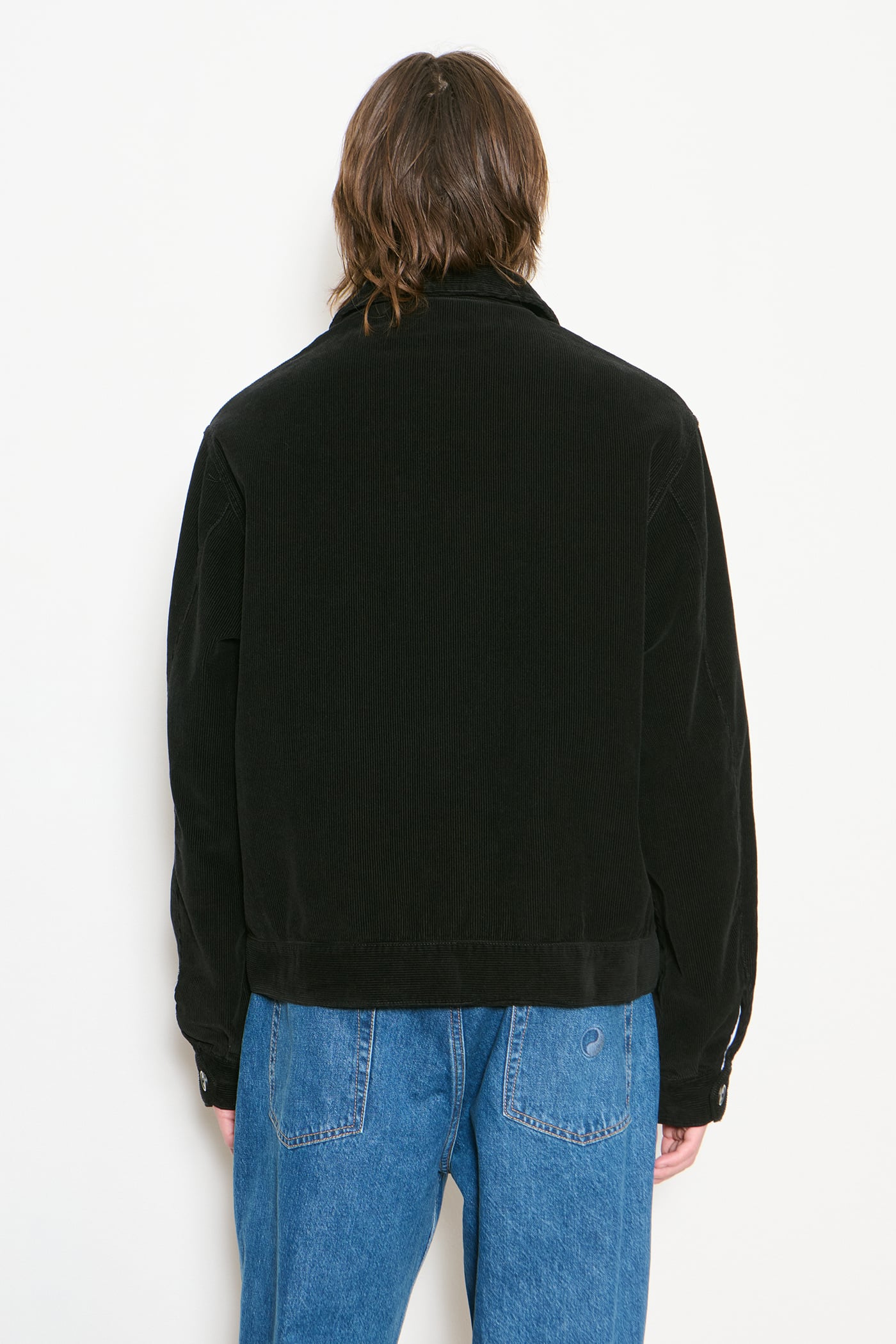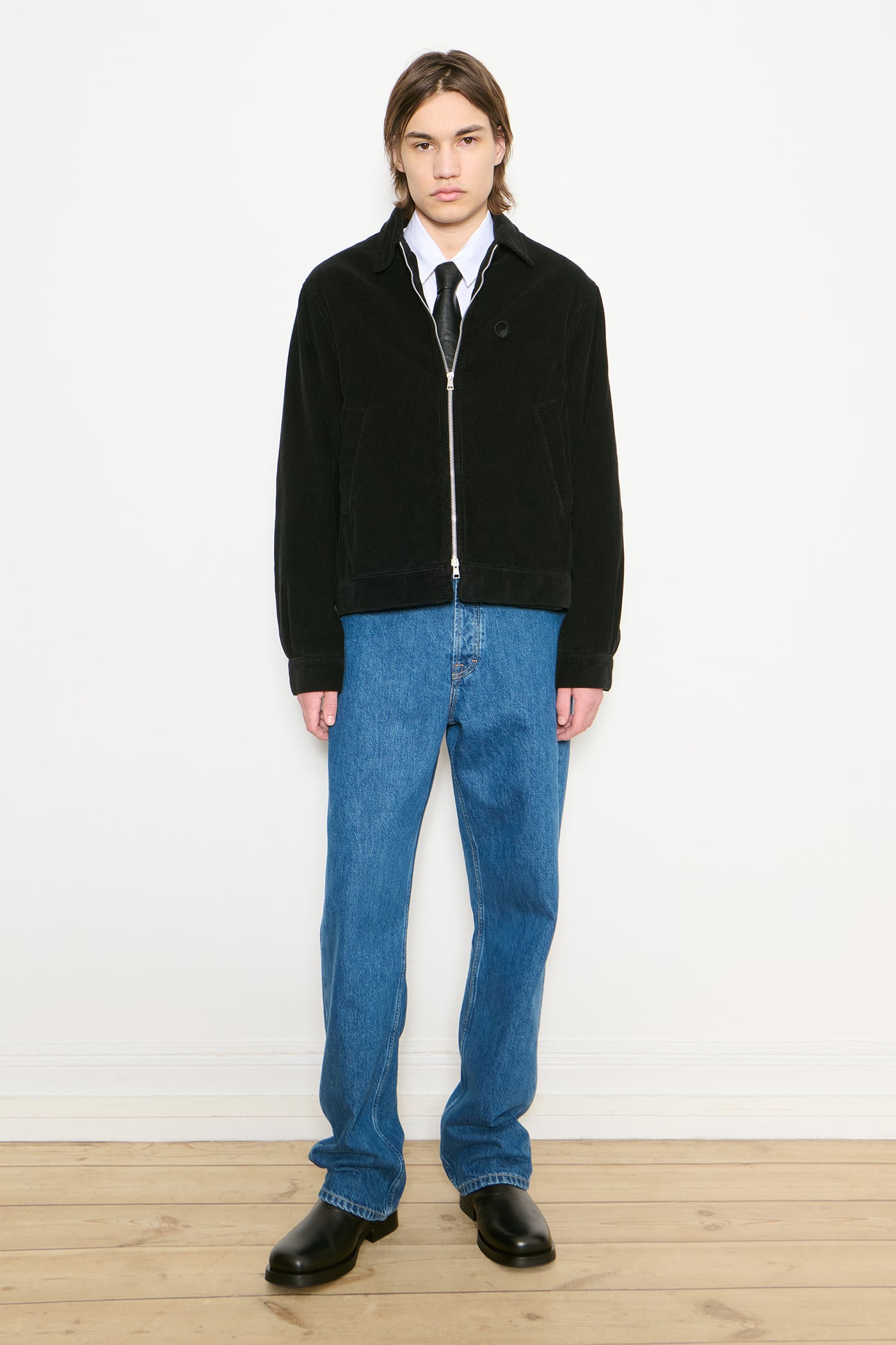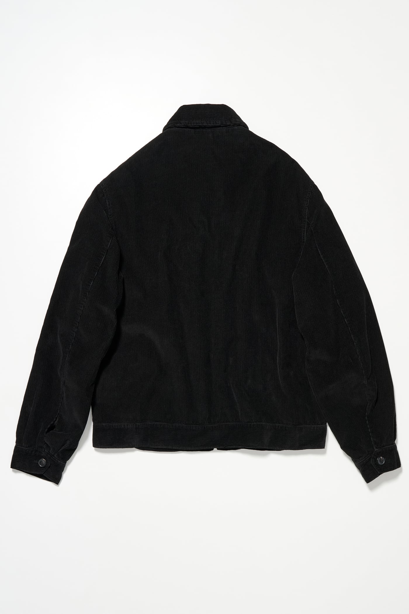 Our Blouson Jacket in Overdyed Black Cord. Produced in Italian deadstock cotton corduroy with an overdyed black finish, the Blouson Jacket has a relaxed, boxy fit and features a two way zip closure, two welt pockets, horn cuff buttons, a Yin Yang chest embroidery, a straight hem and a full lining.