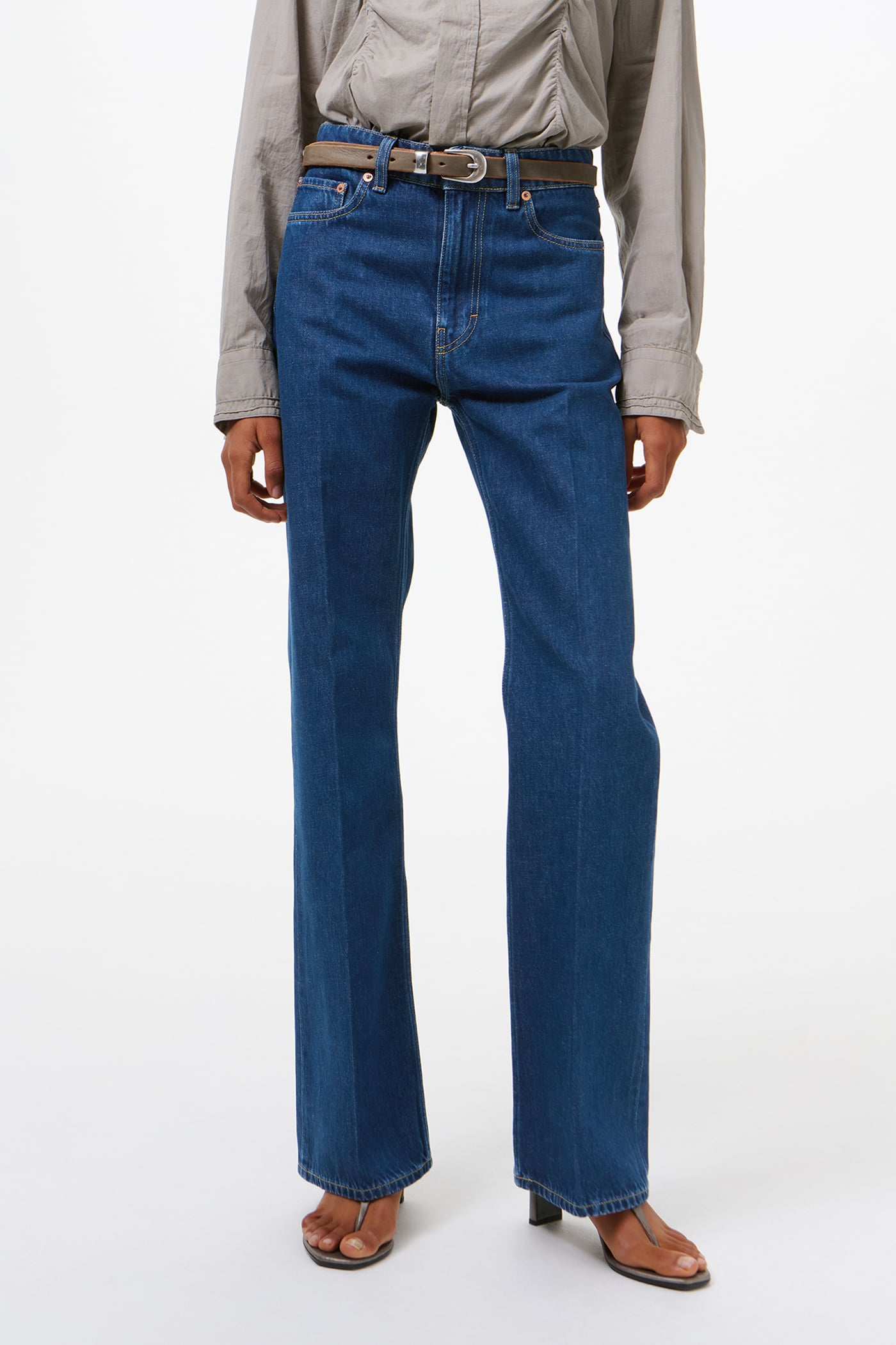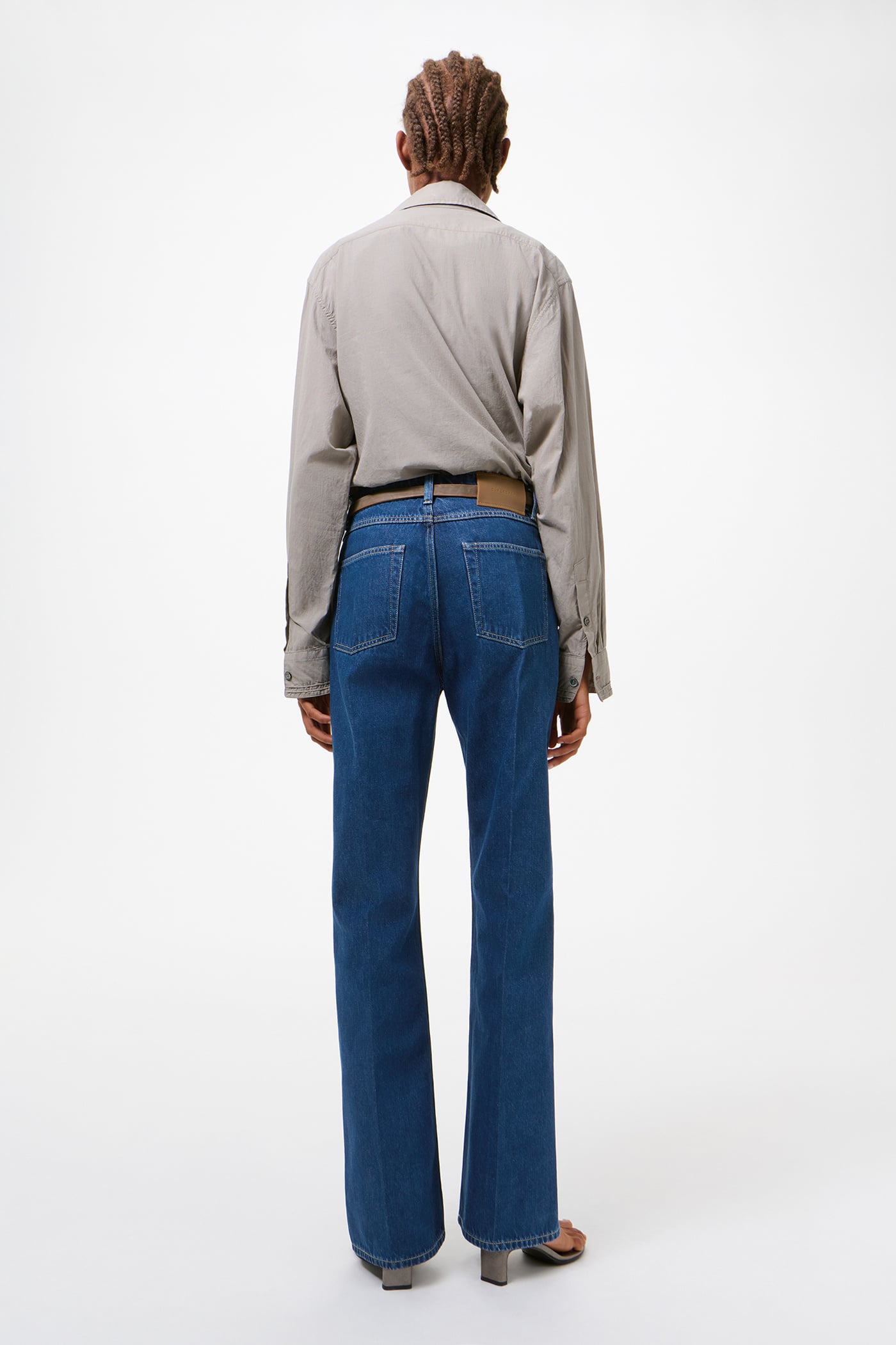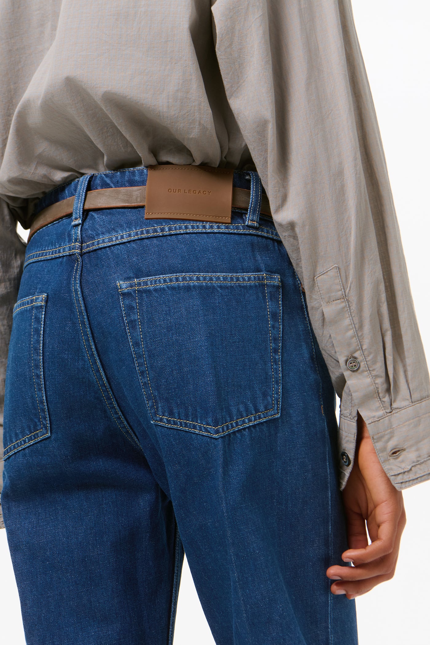 Our Boot Cut in Blue Press Crease. Produced in a Turkish indigo-dyed cotton, viscose and polyester blend fabric, the women's Boot Cut has a mid waist with a straight fit and a boot-cut leg, and features pressed creases, five pockets, a zip fly and the Our Legacy rubber patch.