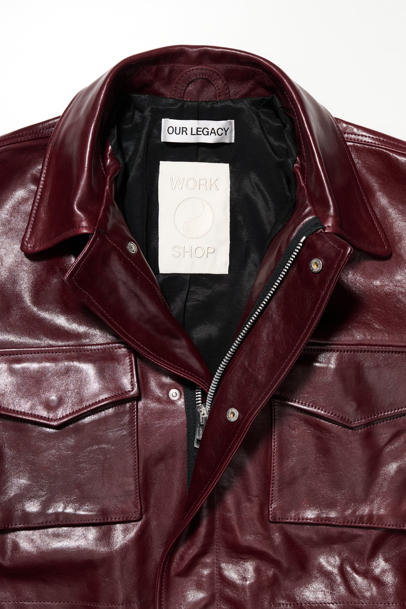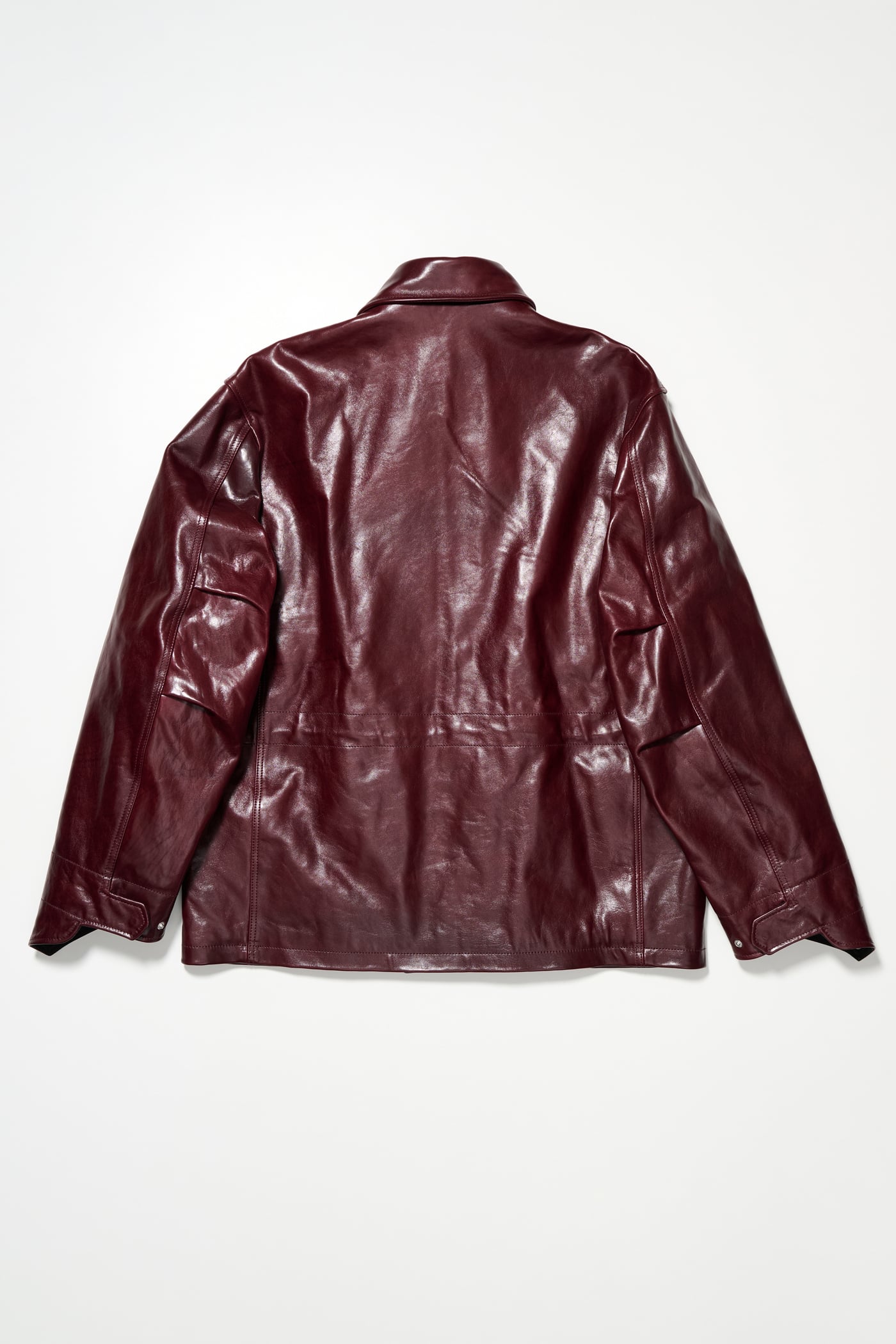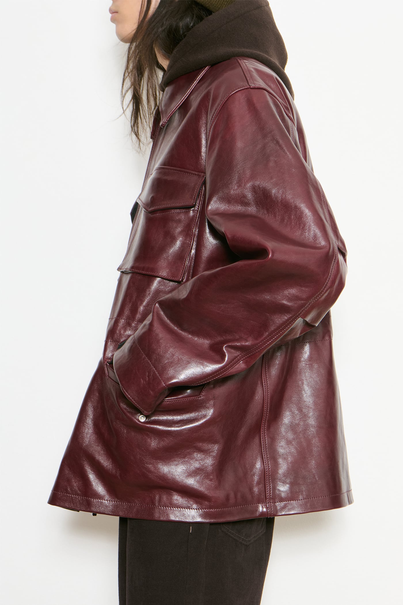 Our Borough Jacket in Chianti Leather. Produced in Italian deadstock leather, the Borough Jacket has a boxy, oversized fit and features chest patch pockets with gussets, front flap pockets, an inside welt pocket, an inside waist drawstring, a foldable hand guard detail, buttoned cuffs, brass hardware, a straight hem and a full lining.