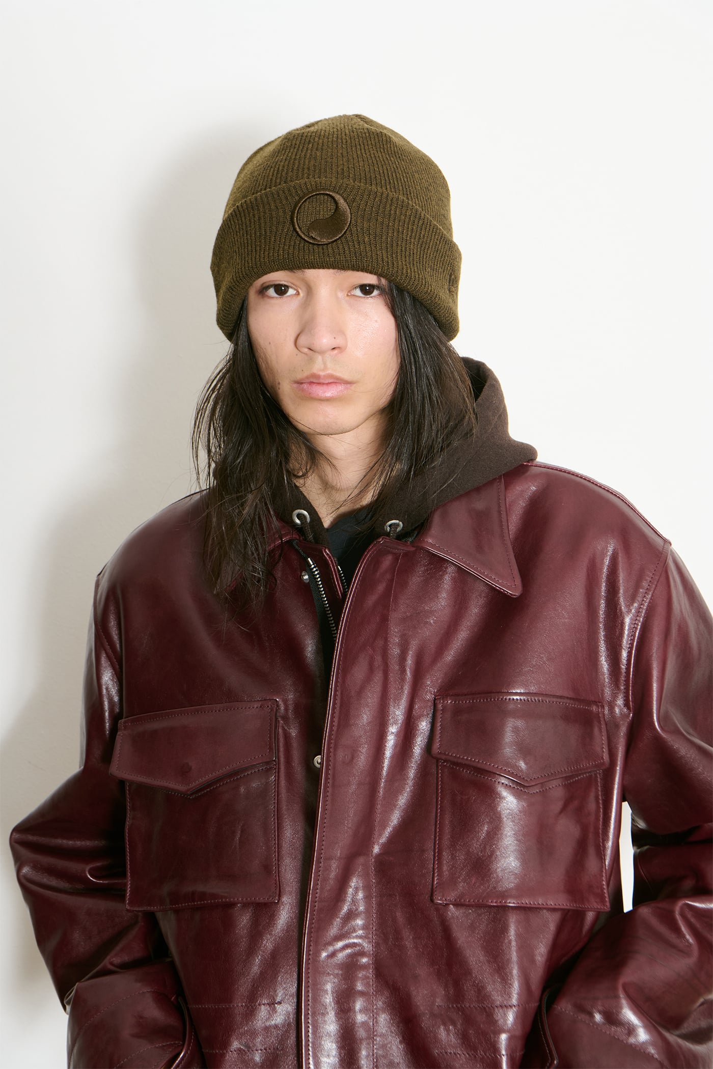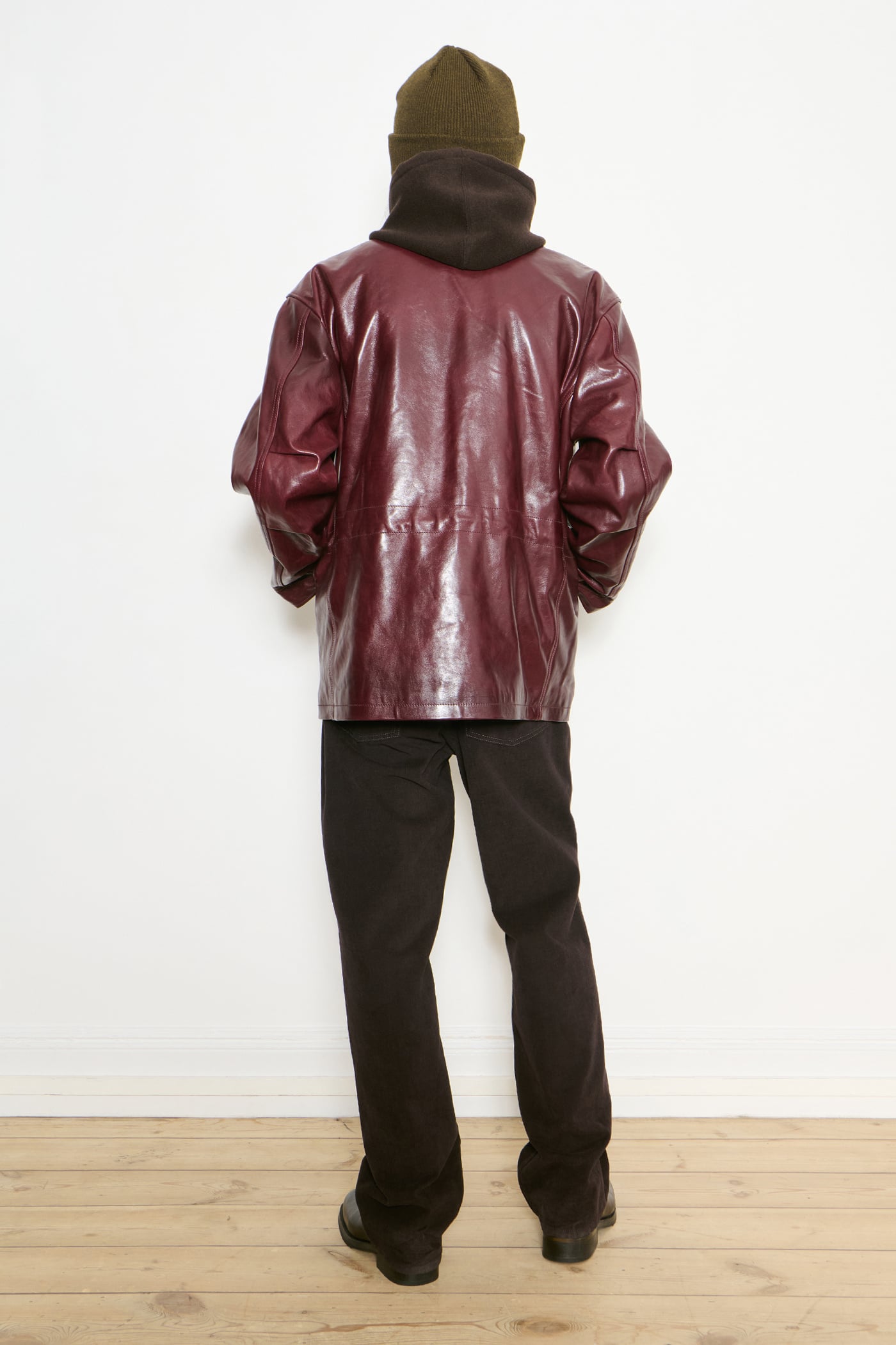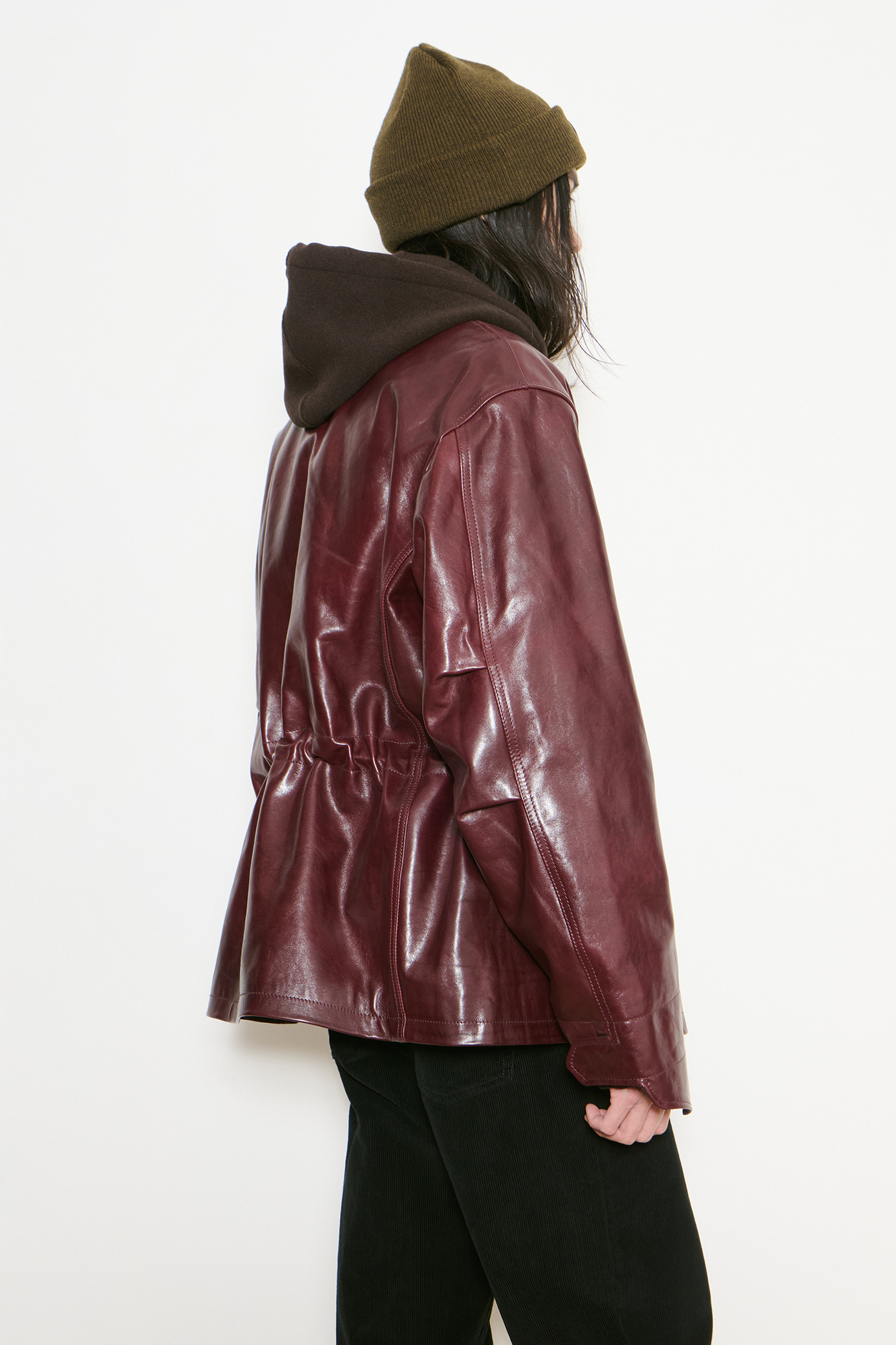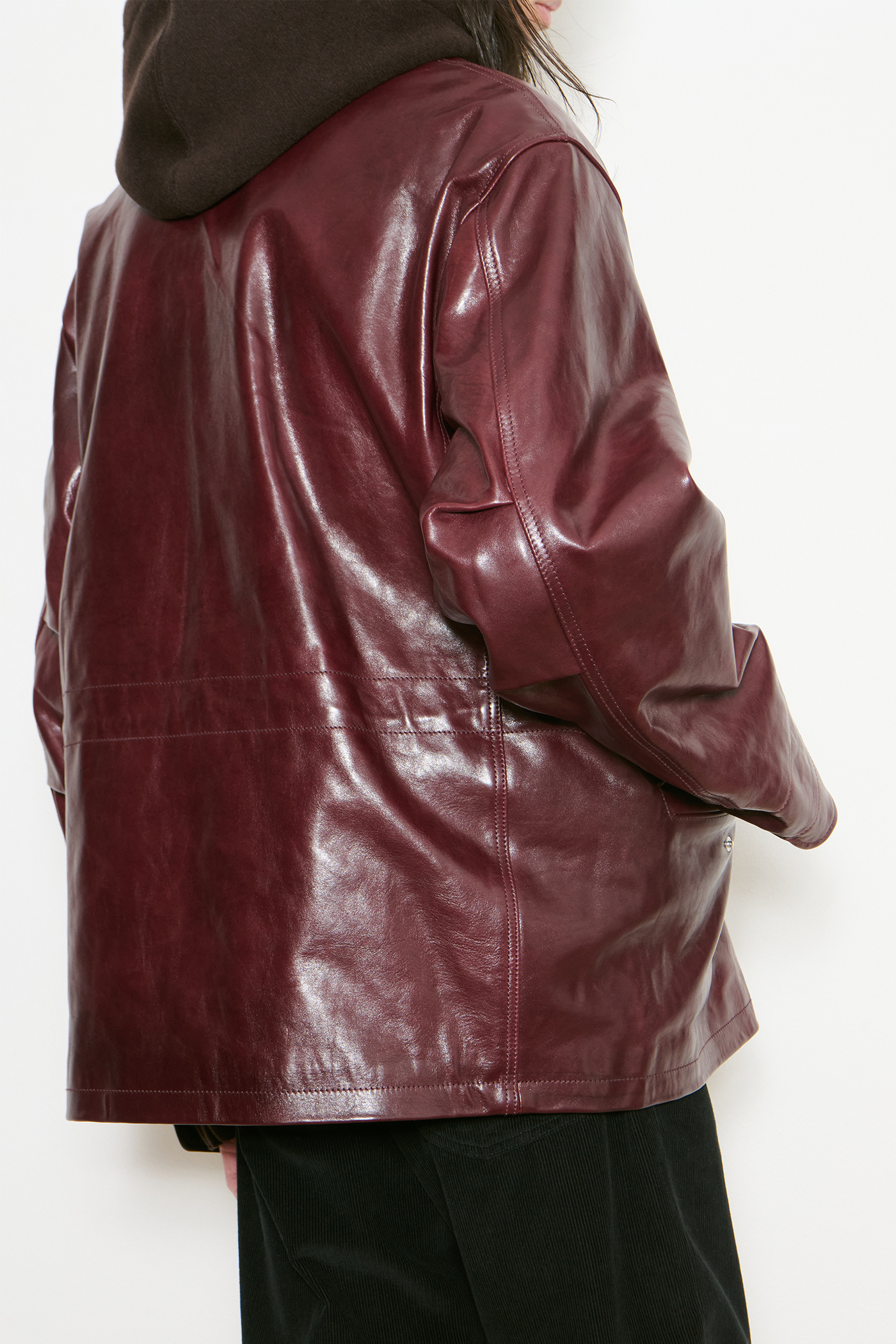 Our Borough Jacket in Chianti Leather. Produced in Italian deadstock leather, the Borough Jacket has a boxy, oversized fit and features chest patch pockets with gussets, front flap pockets, an inside welt pocket, an inside waist drawstring, a foldable hand guard detail, buttoned cuffs, brass hardware, a straight hem and a full lining.