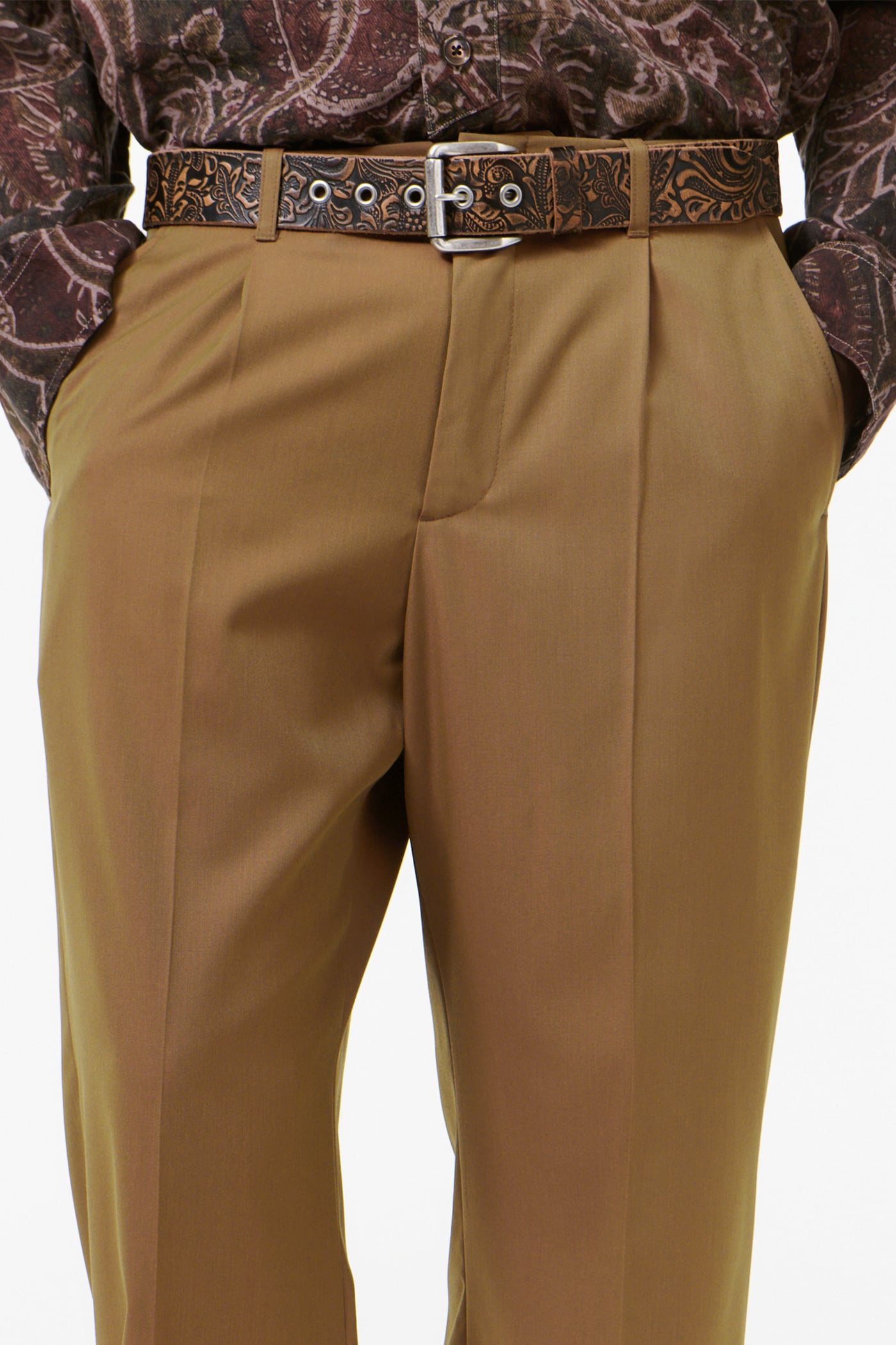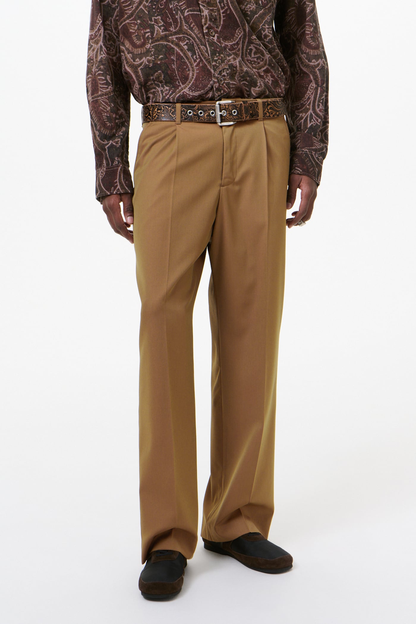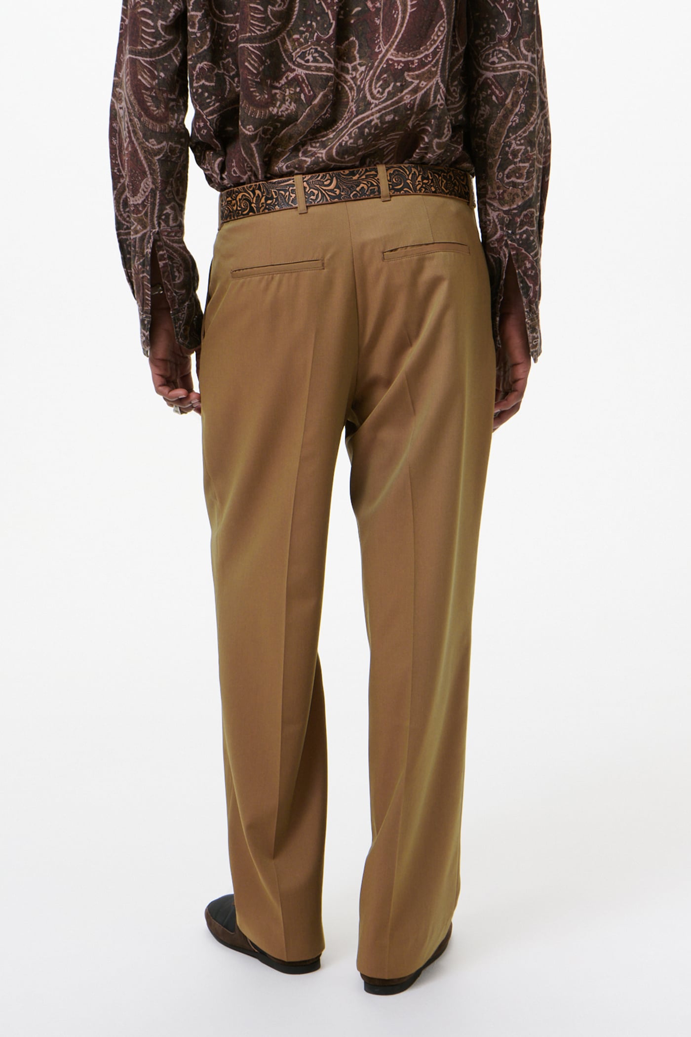 Our Borrowed Chino in Bronze Cangiante Fine Wool. Produced in Italian fine virgin wool with a cangiante effect that subtly shifts between bronze tones, the men's Borrowed Chino has a wide-legged relaxed fit with a pleated front and features a YKK zip fly, a covered hook-and-eye waistband fastening, corozo buttons, two side pockets, two back welt pockets and subtle OL embroidery.
