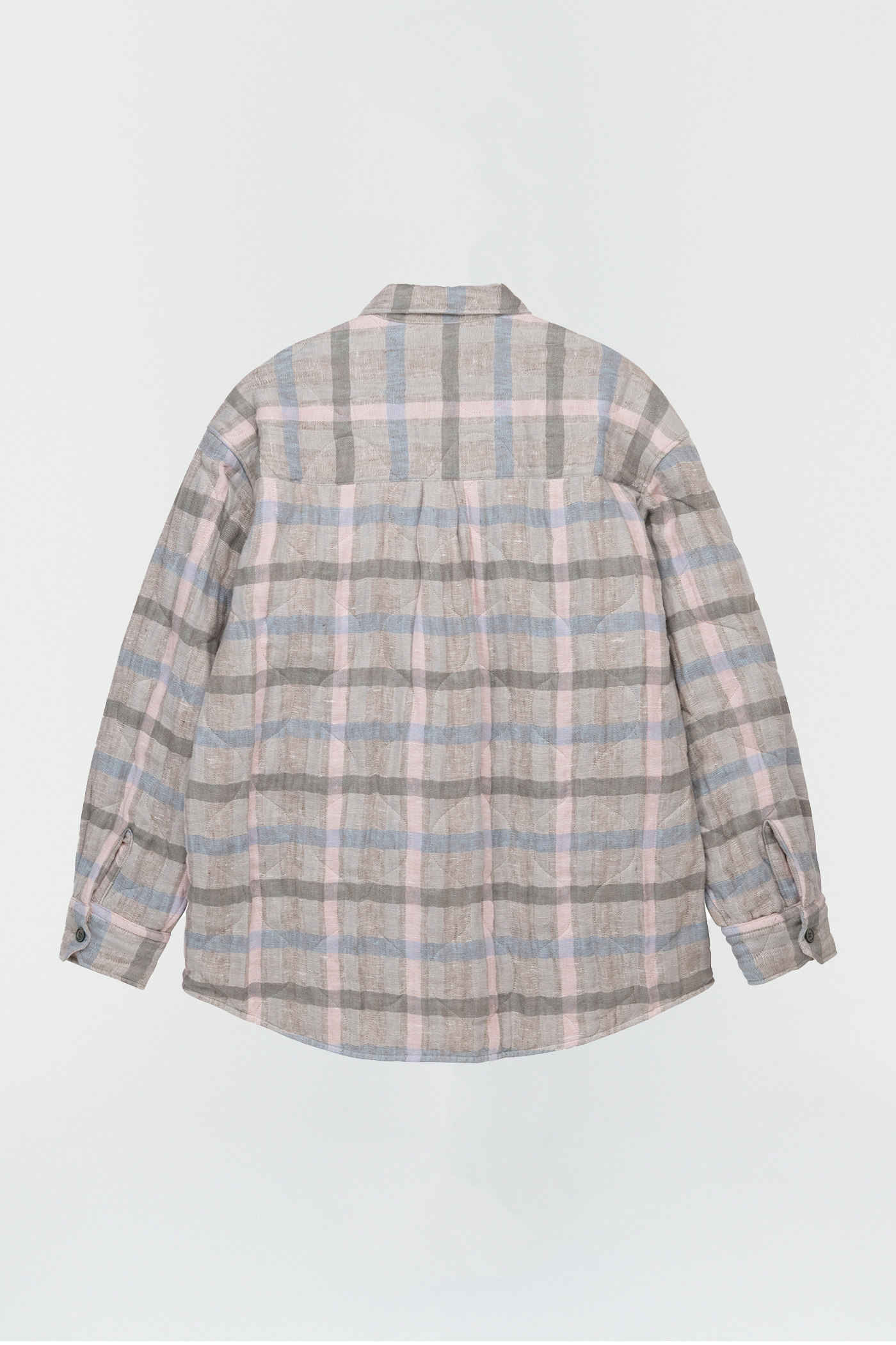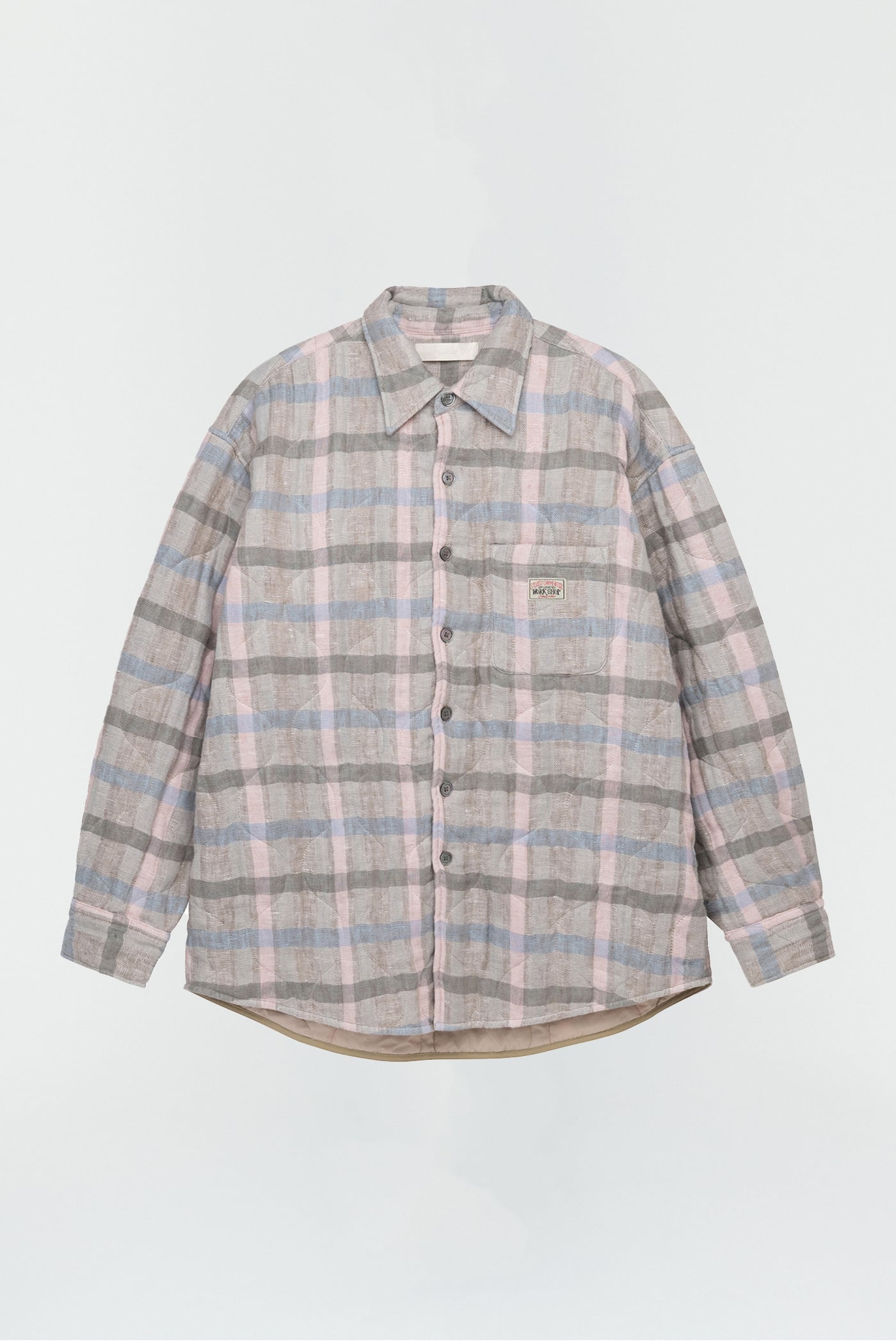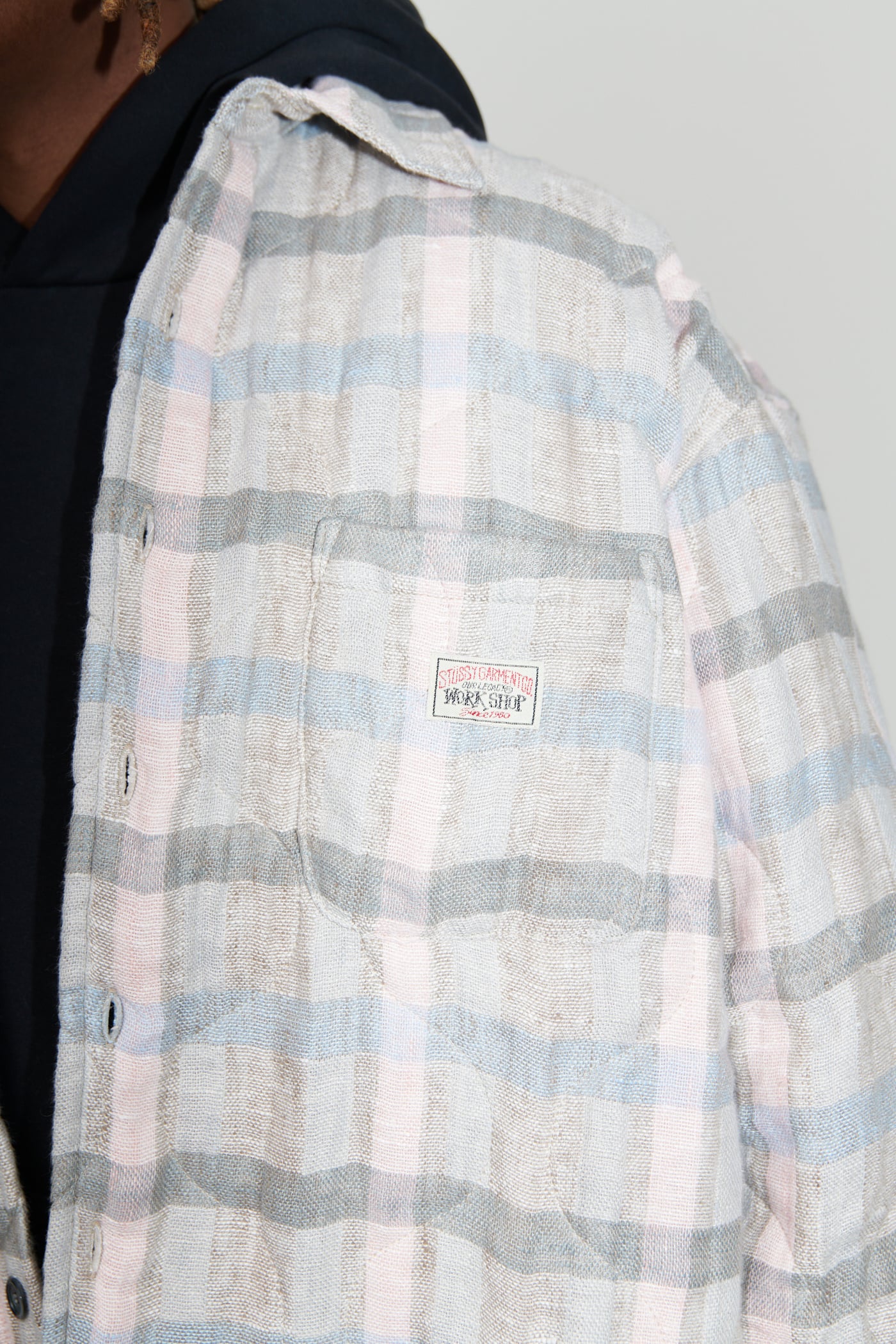 WORK SHOP X STÜSSY Borrowed Jacket in Pale Linen Check. Produced in a washed linen fabric from Lithuania, the Borrowed Jacket is lined with a super light quilt and has a wide, oversized cut and features mother of pearl buttons, a single chest pocket, mitered cuffs and a curved hem.