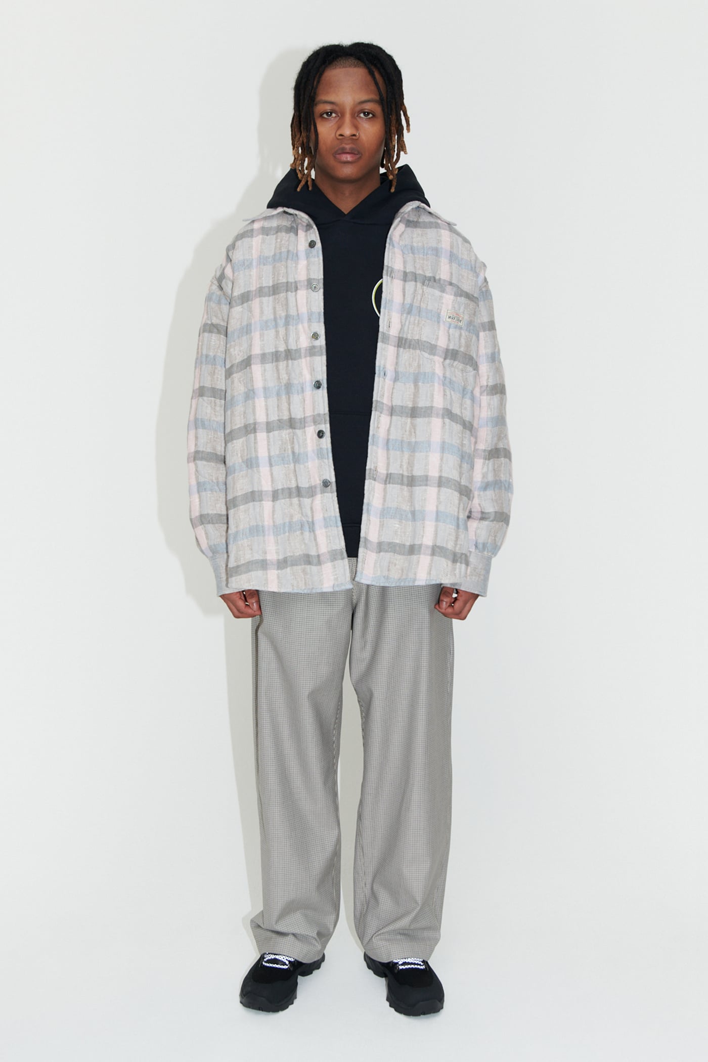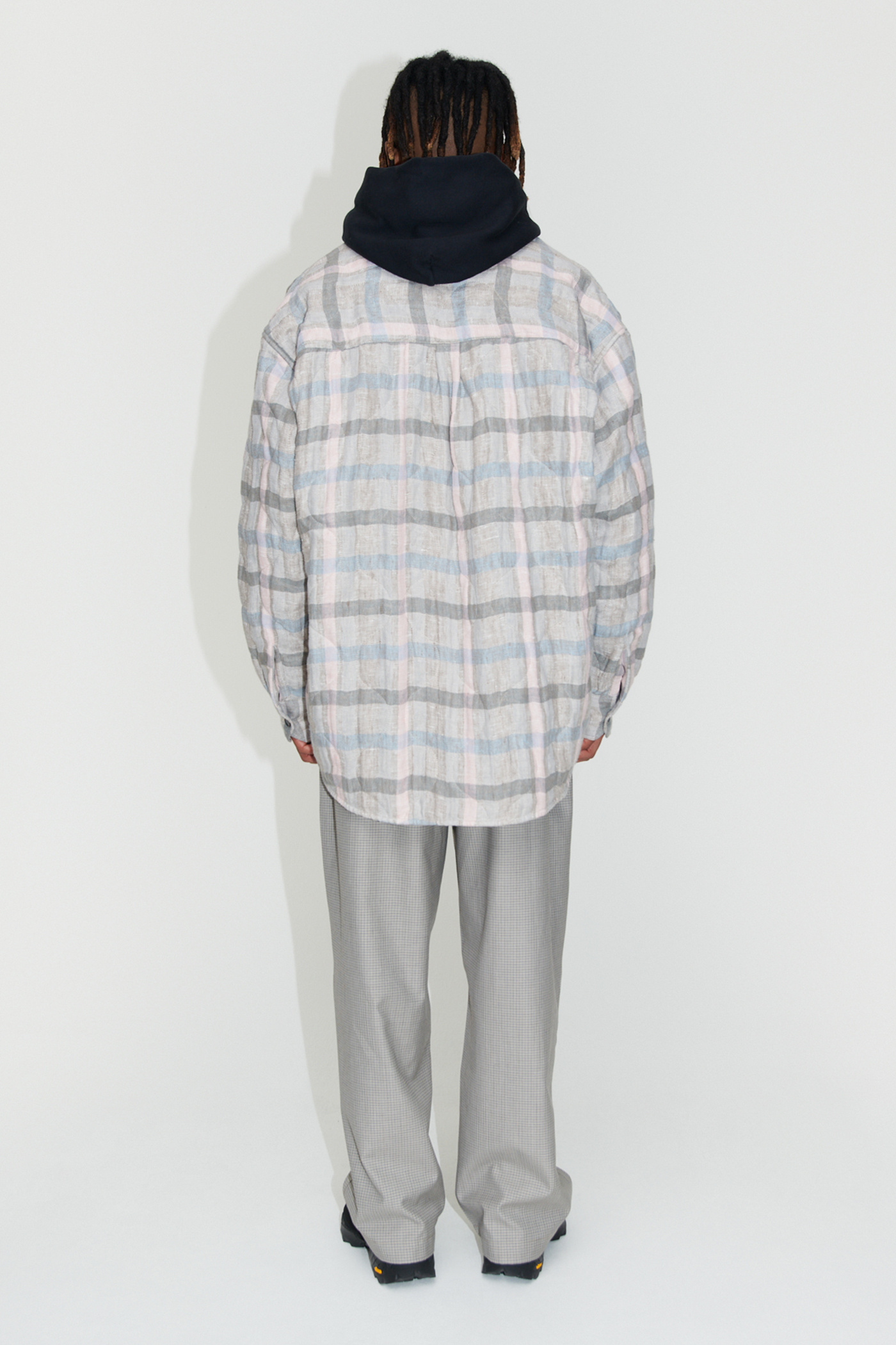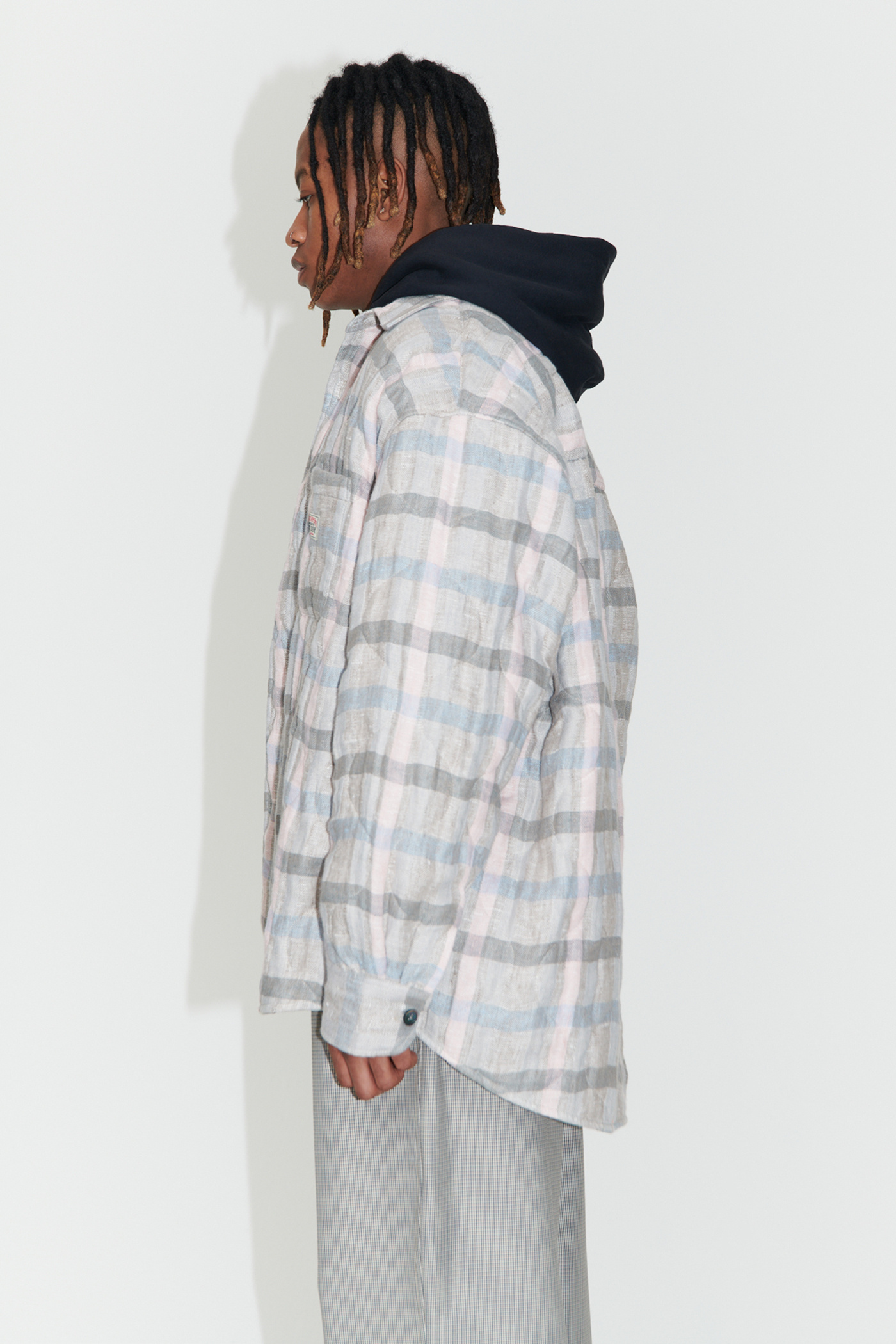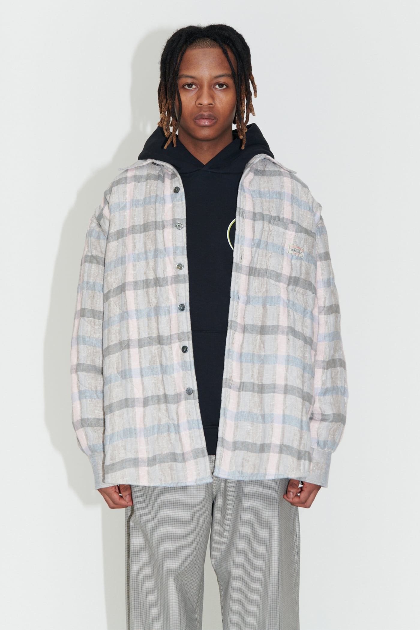 WORK SHOP X STÜSSY Borrowed Jacket in Pale Linen Check. Produced in a washed linen fabric from Lithuania, the Borrowed Jacket is lined with a super light quilt and has a wide, oversized cut and features mother of pearl buttons, a single chest pocket, mitered cuffs and a curved hem.