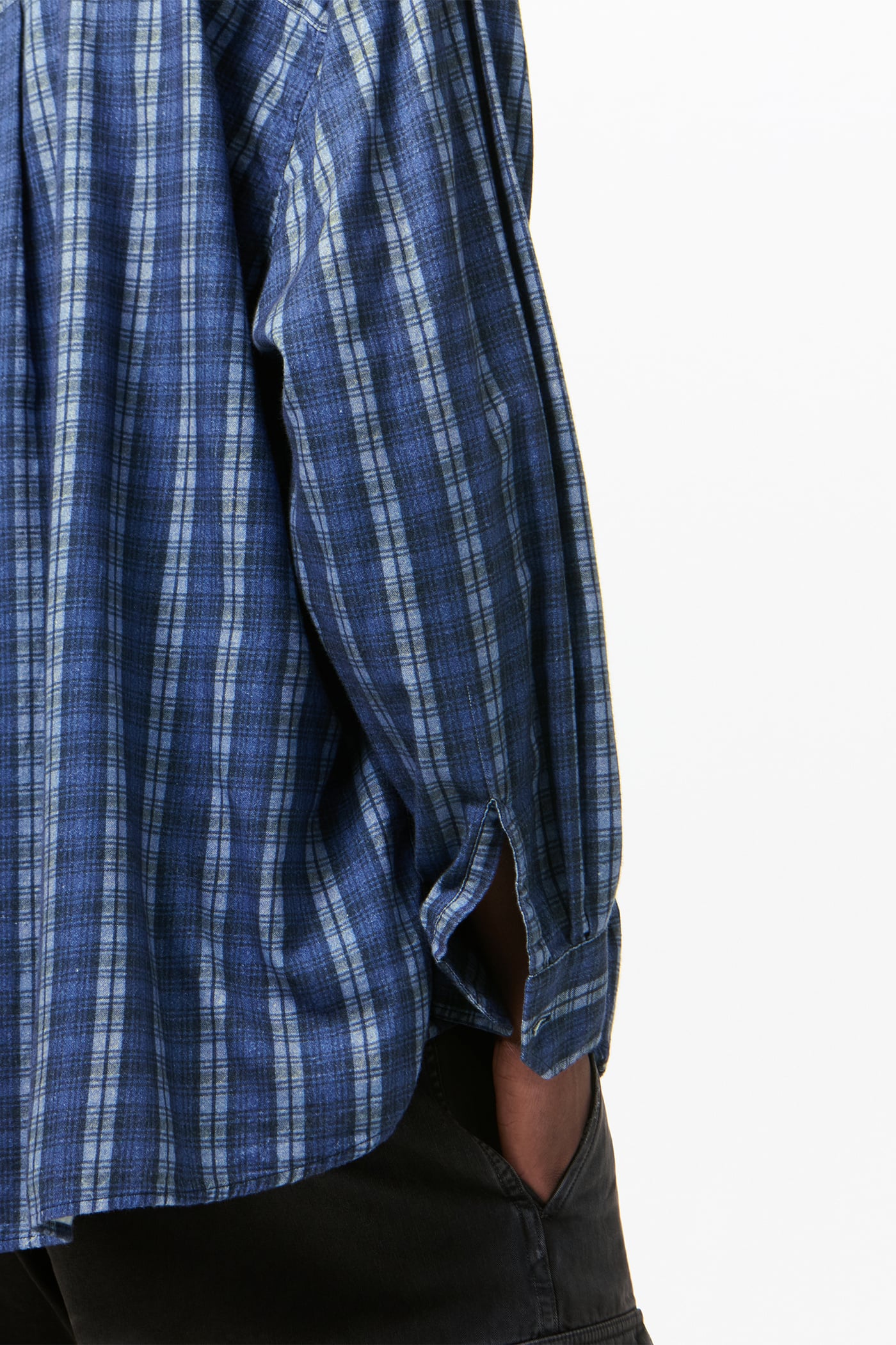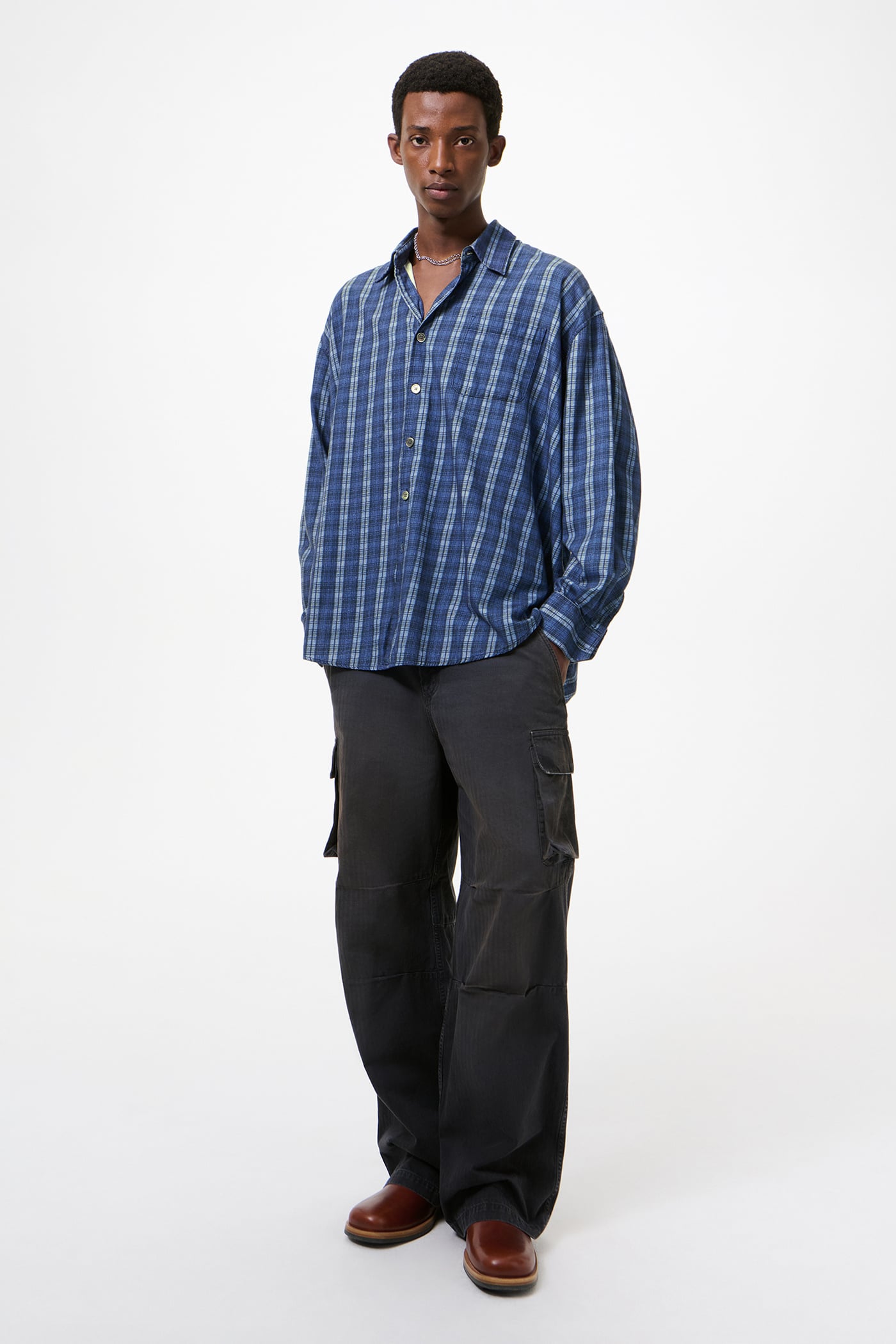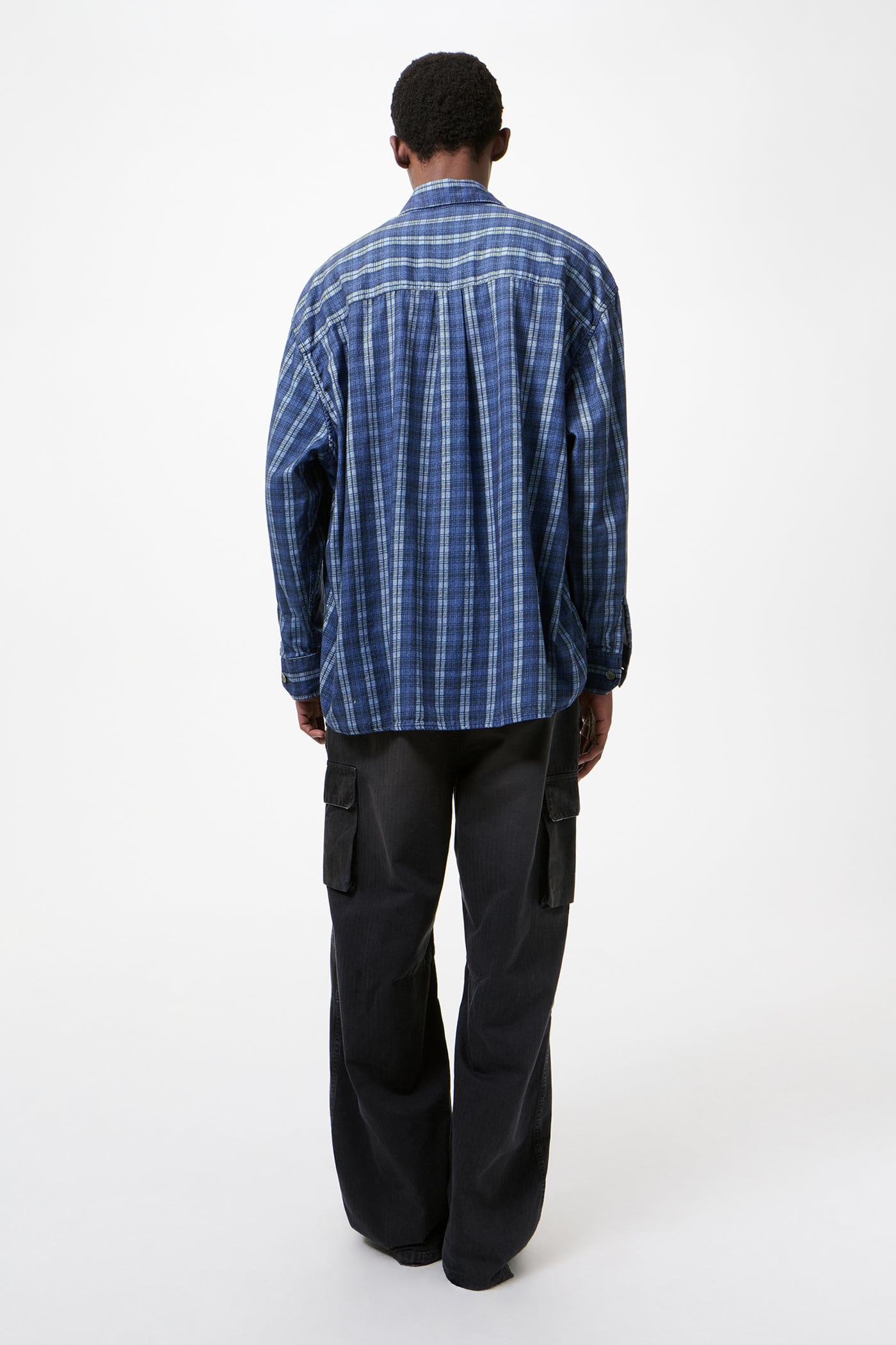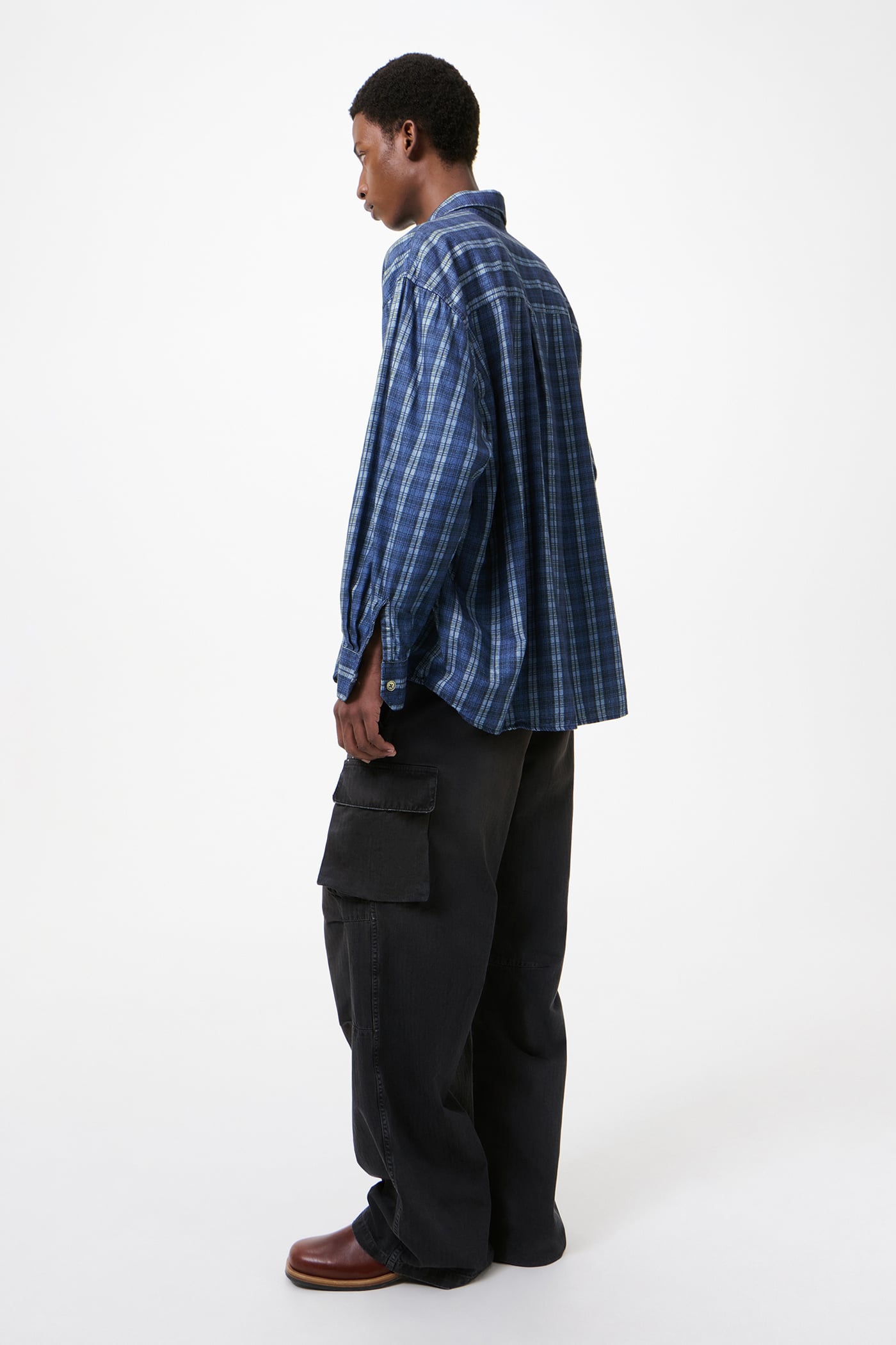 Our Borrowed Shirt in Check Please Print. Produced in a Portuguese cotton fabric with our Check Please pattern, the men's Borrowed Shirt has an oversized fit and features mother of pearl buttons, mitered cuffs, a curved hem and a single chest pocket.