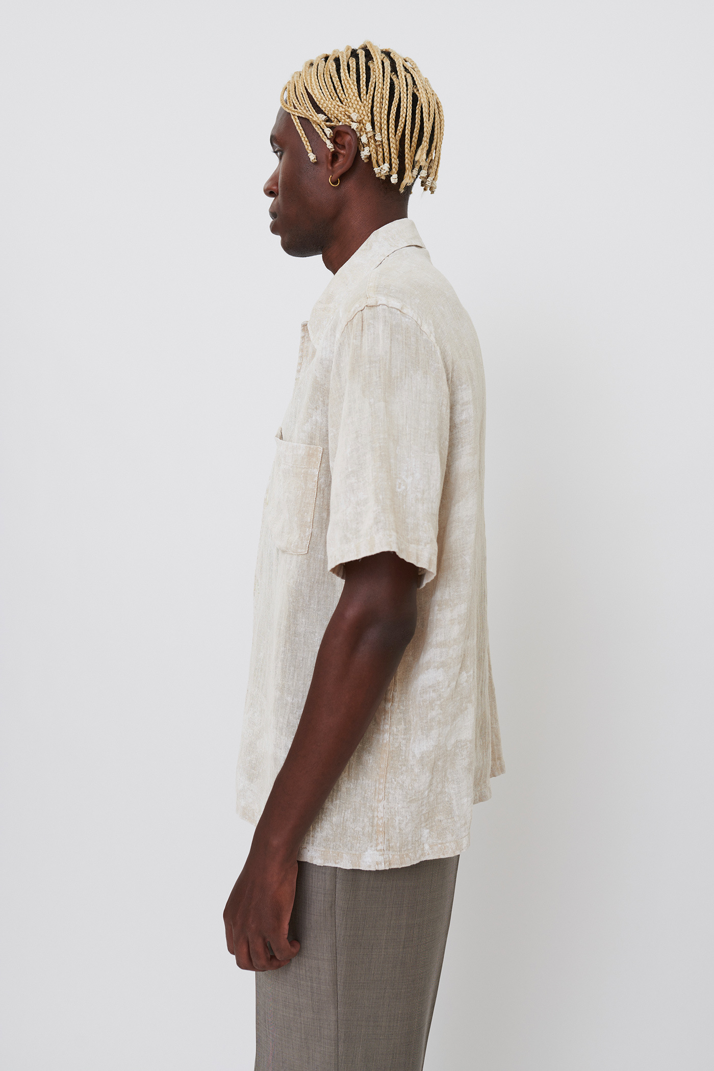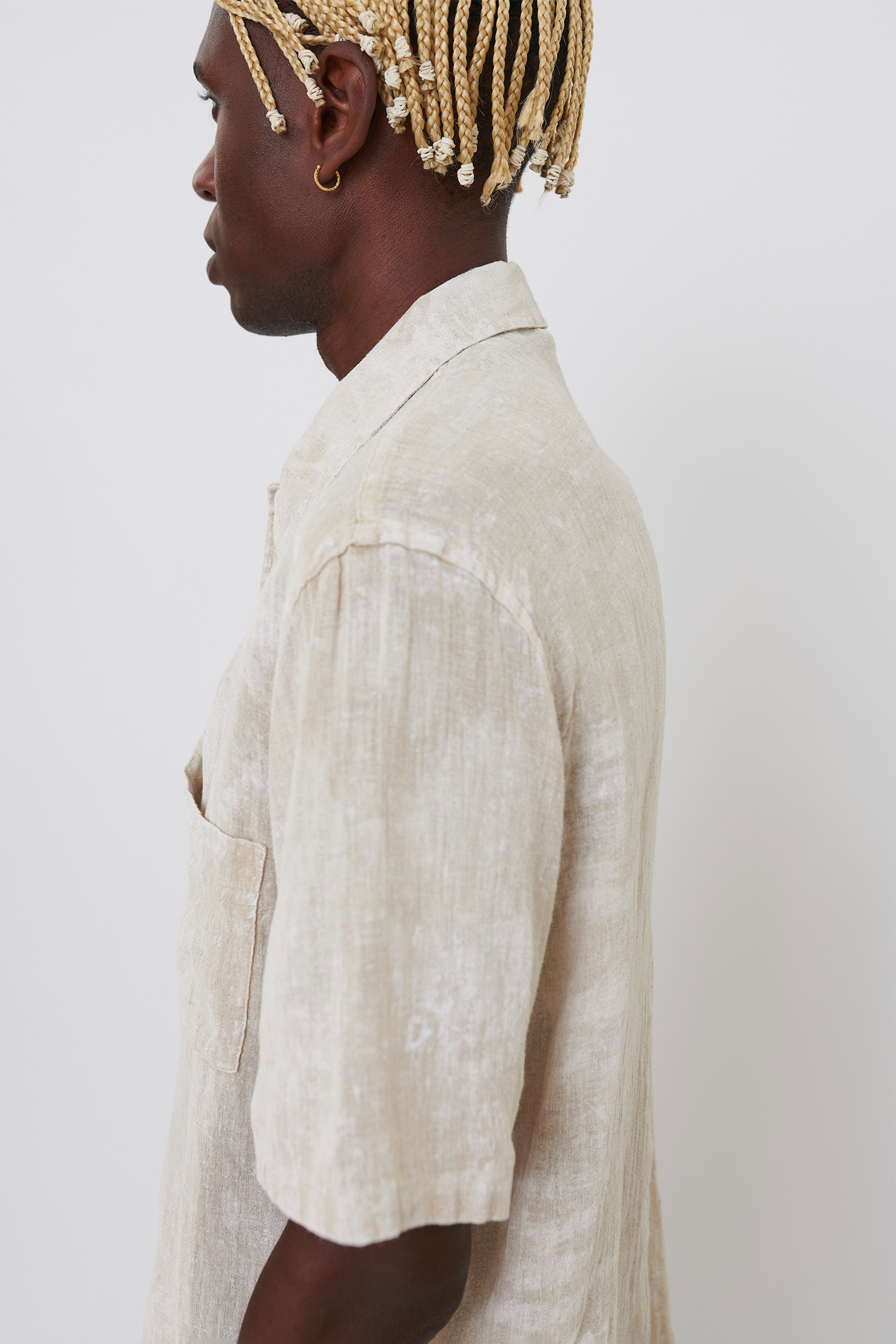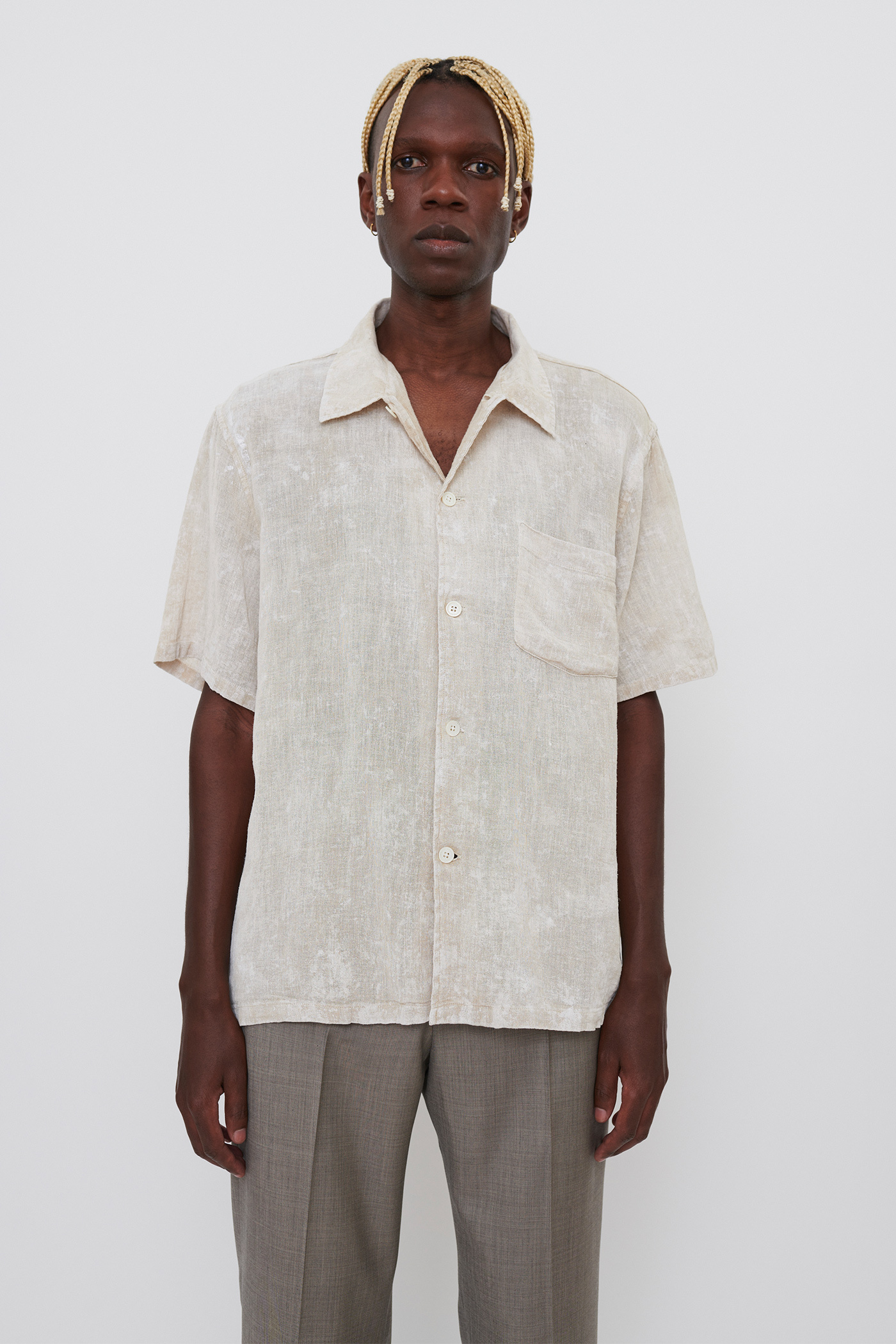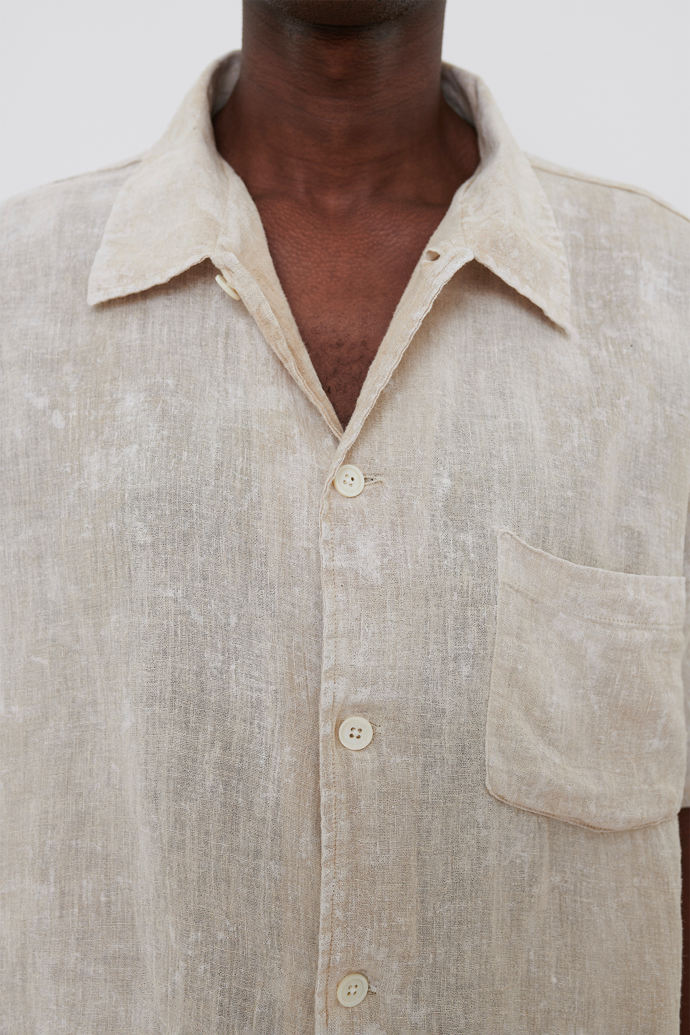 Our Box Shirt Shortsleeve in White Coated Cotton Linen. Produced in an Italian cotton/linen fabric with a slightly sheer weave and a hand-painted coating, our mens Box Shirt Shortsleeve has mother of pearl buttons, a chest pocket, and a straight hem.