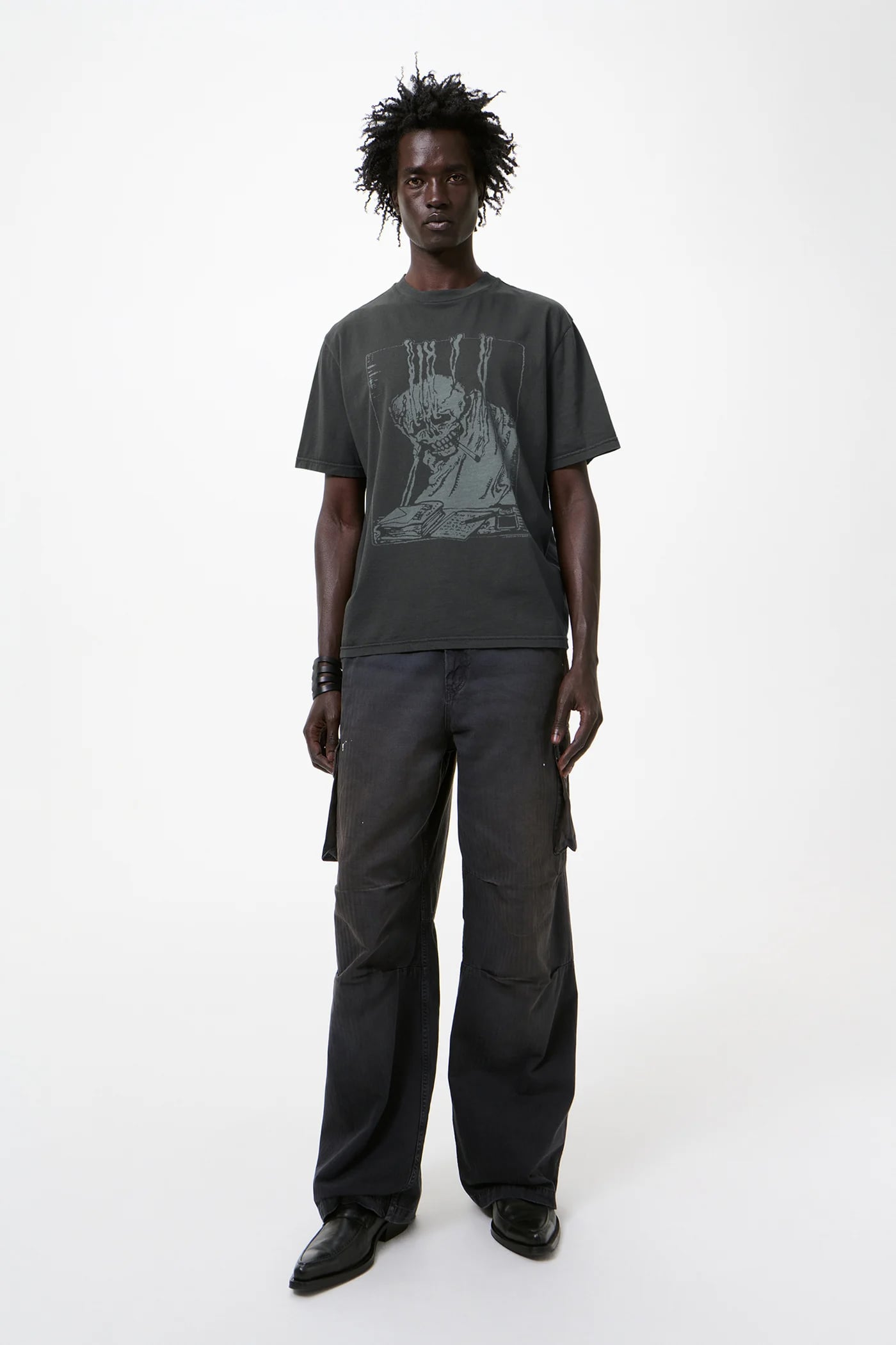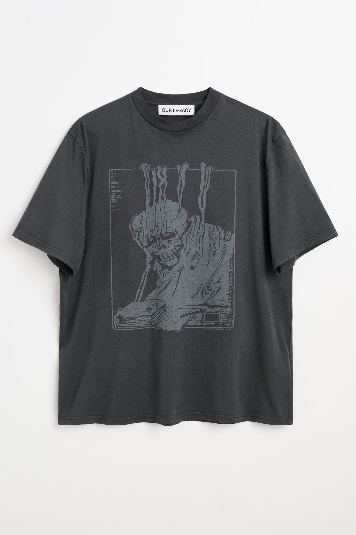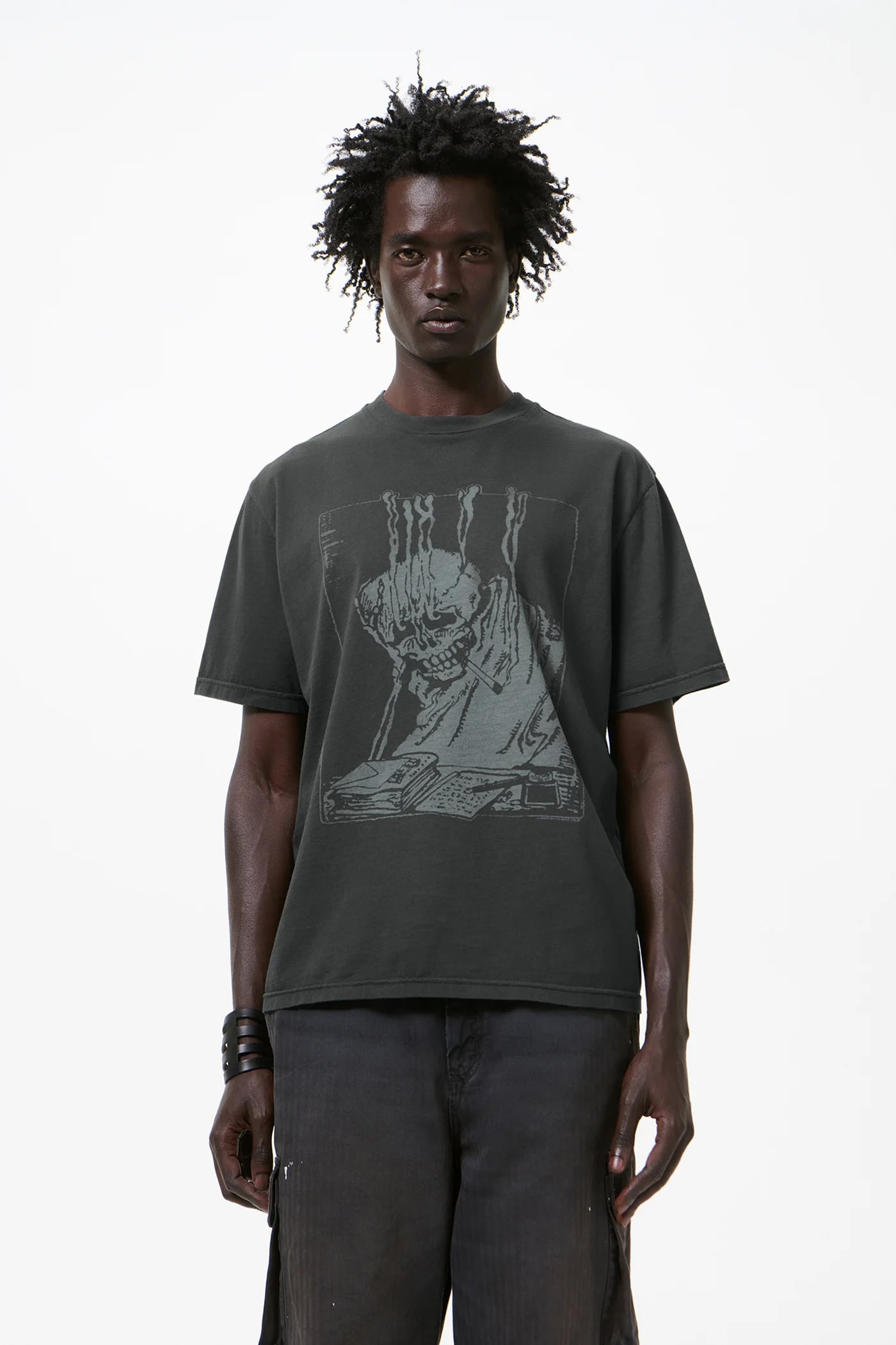 This garment is manufactured using a unique treatment process that gives each piece an individual shade and appearance. The laser print creates intentional small holes within the print that may evolve with wear. Pigment dyeing may result in some color transfer onto lighter garments or surfaces. The garment shall be shaped by its wearer and naturally distress over time.