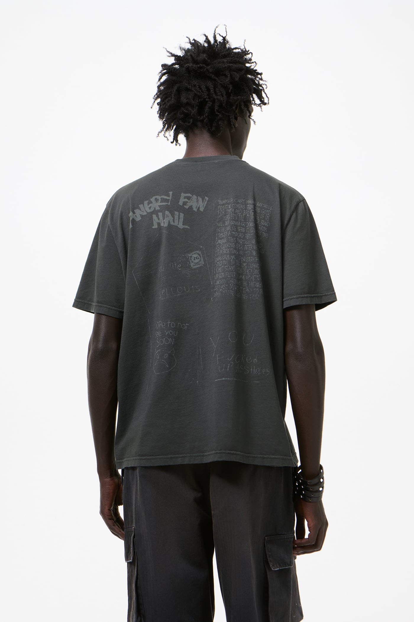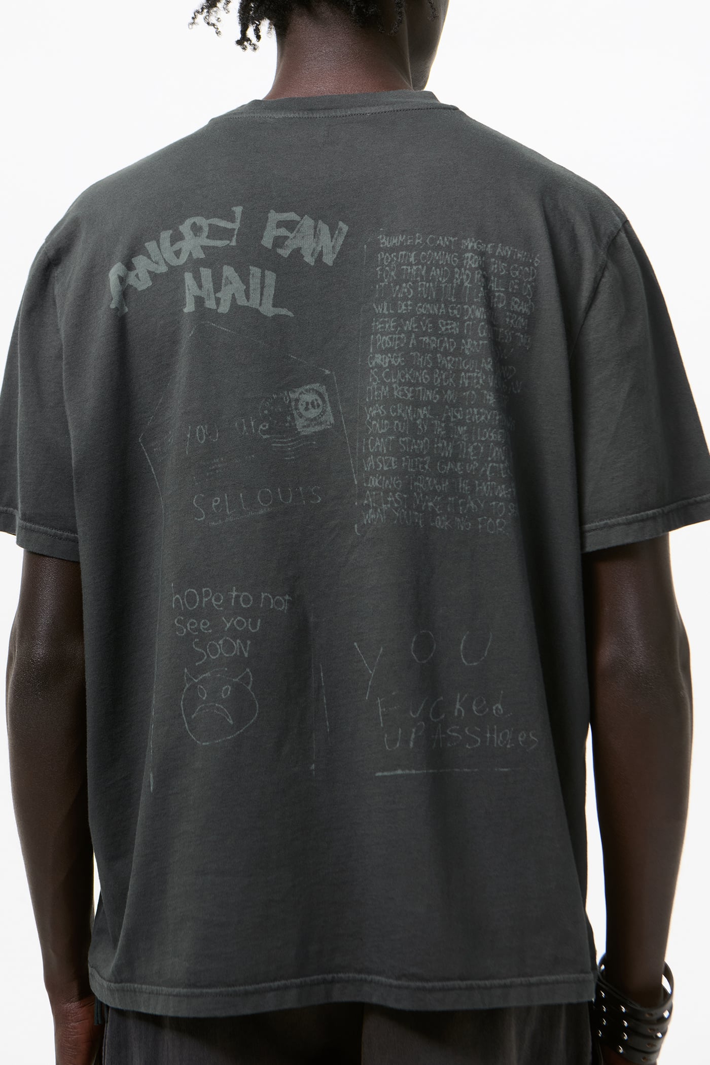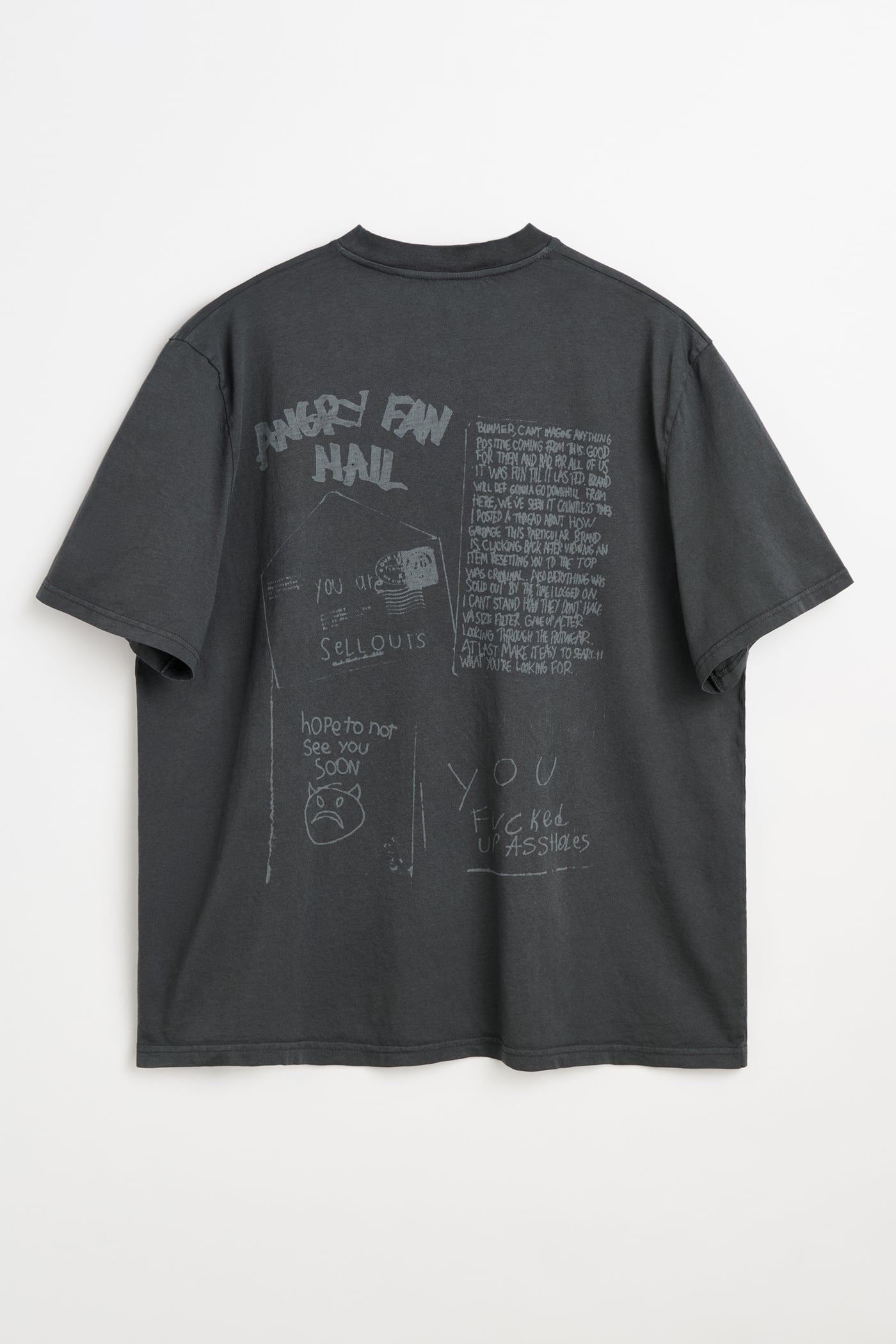 Our Box T-Shirt in Portuguese Cotton Jersey. Produced in a Portuguese cotton jersey, the Box T-Shirt is pigment dyed and laser printed to burn out the color, revealing our Angry Fan Mail graphic, a satirical nod to social media commentary. It has a wide, boxy fit and features a fine rib collar and a straight hem.