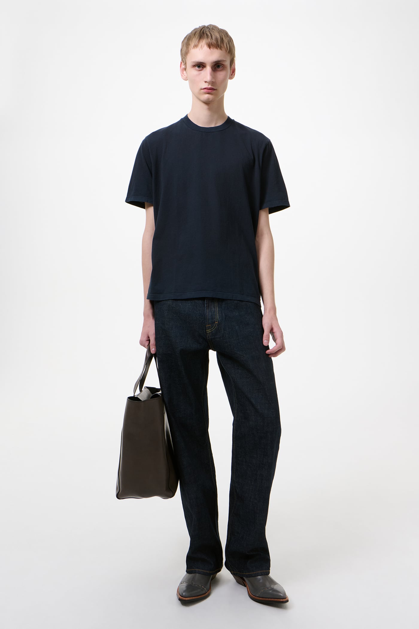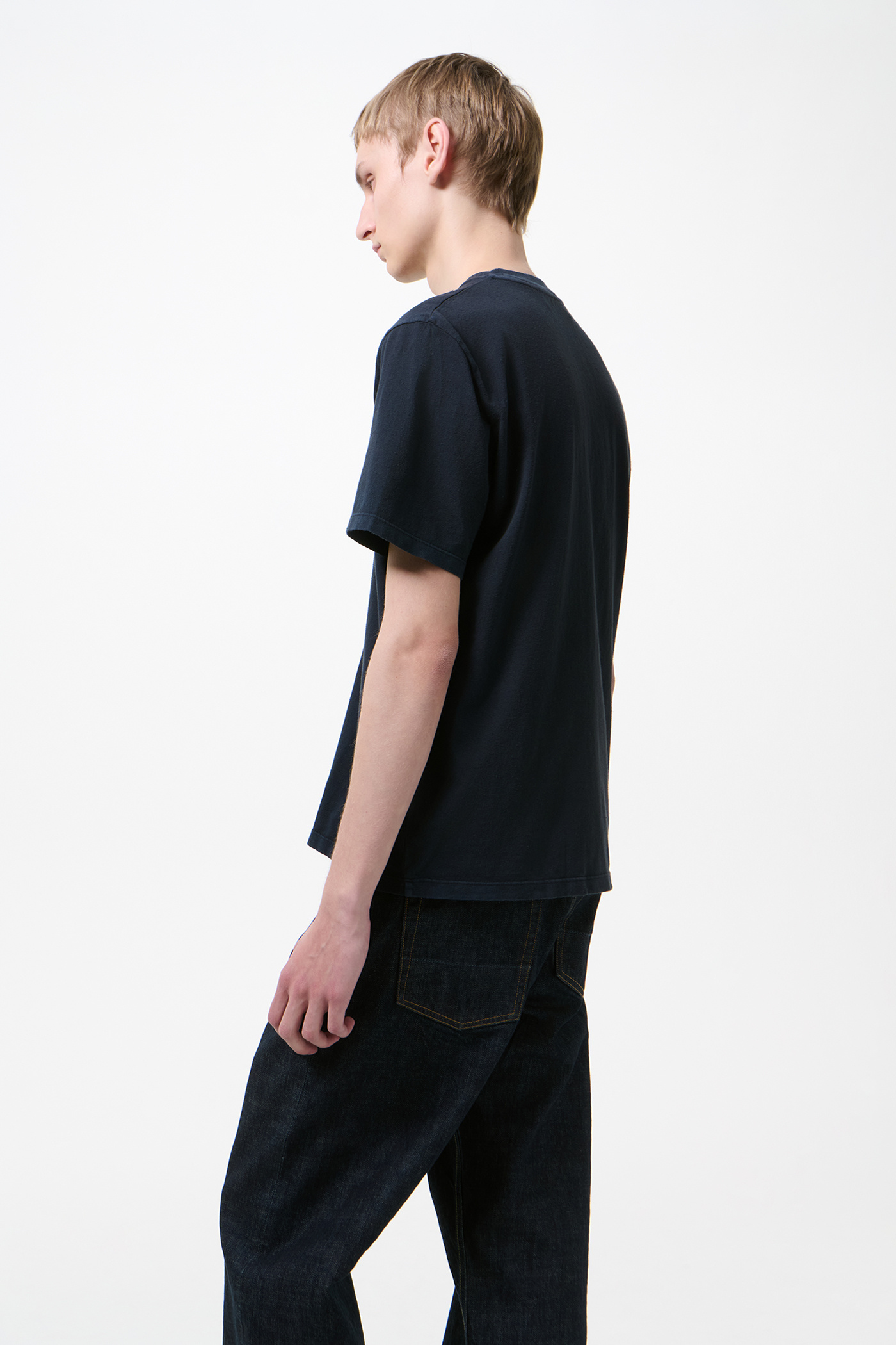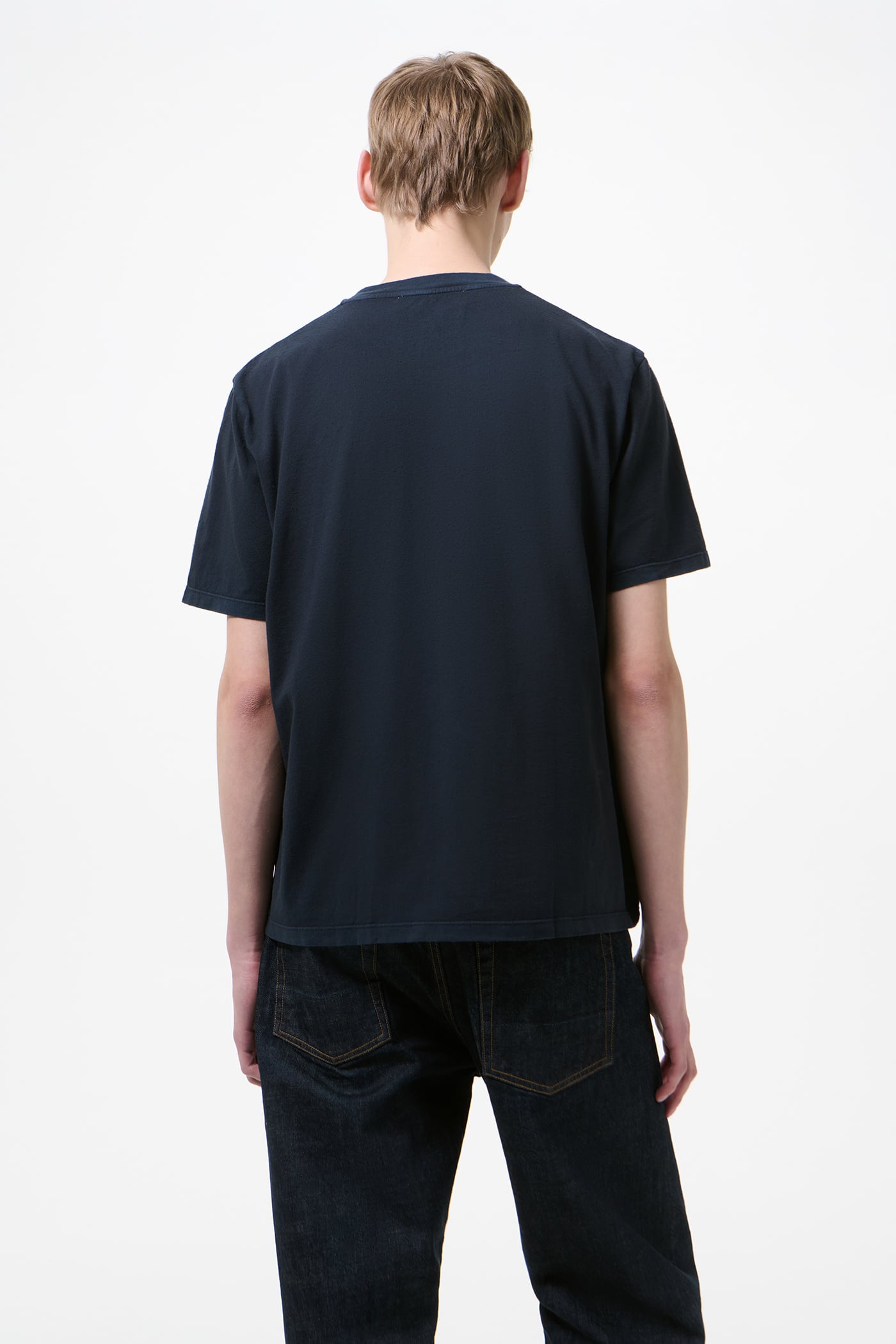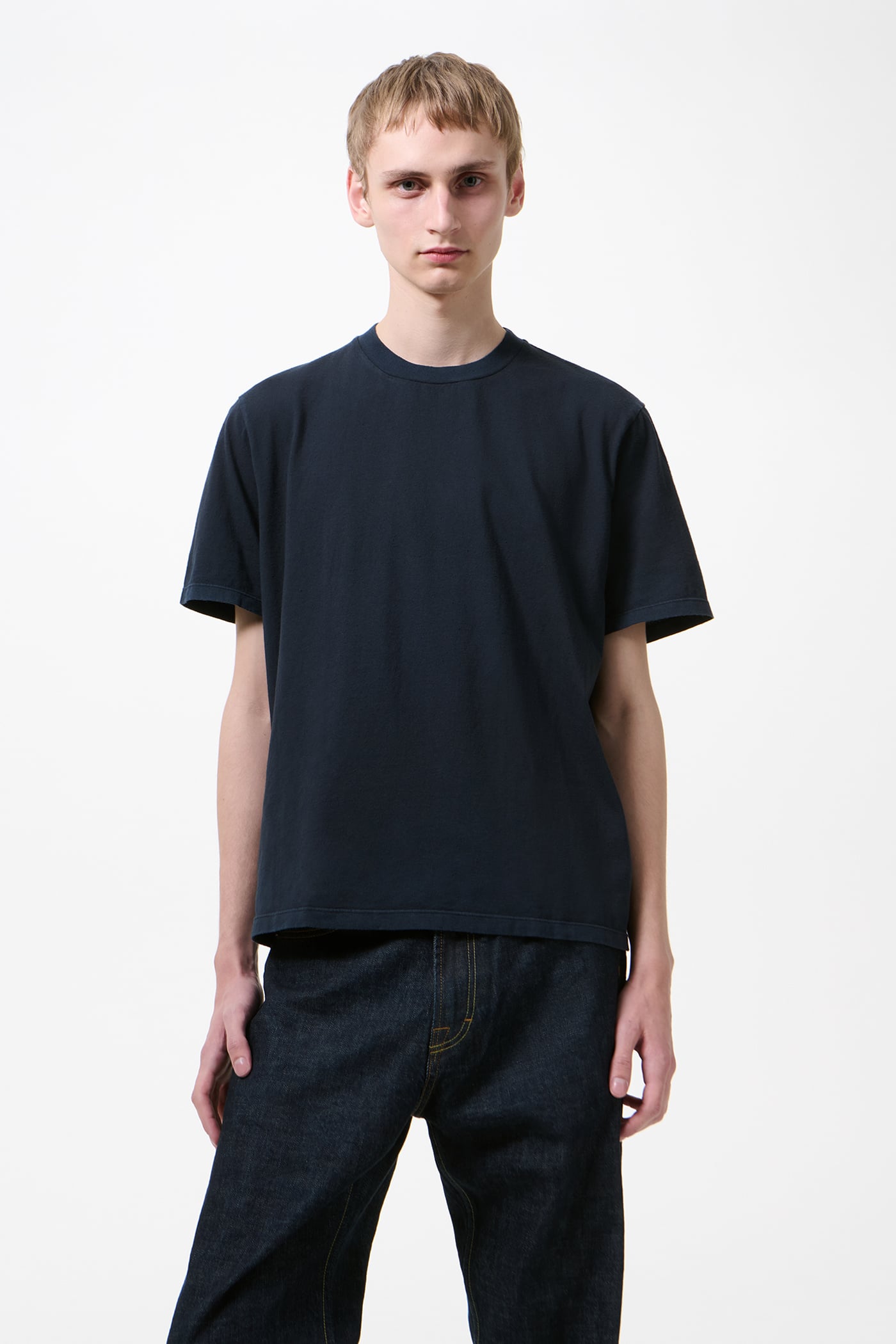 Our Box T-Shirt in Worn Blue Legacy Jersey. Produced in a Portuguese cotton jersey, the mens Box T-Shirt has a relaxed, boxy fit and features a ribbed collar and a straight hem.