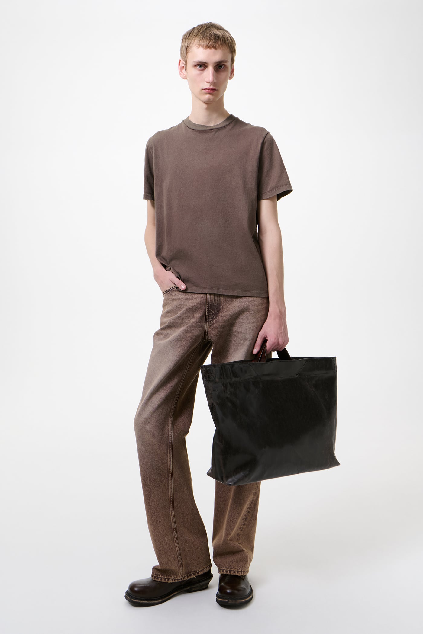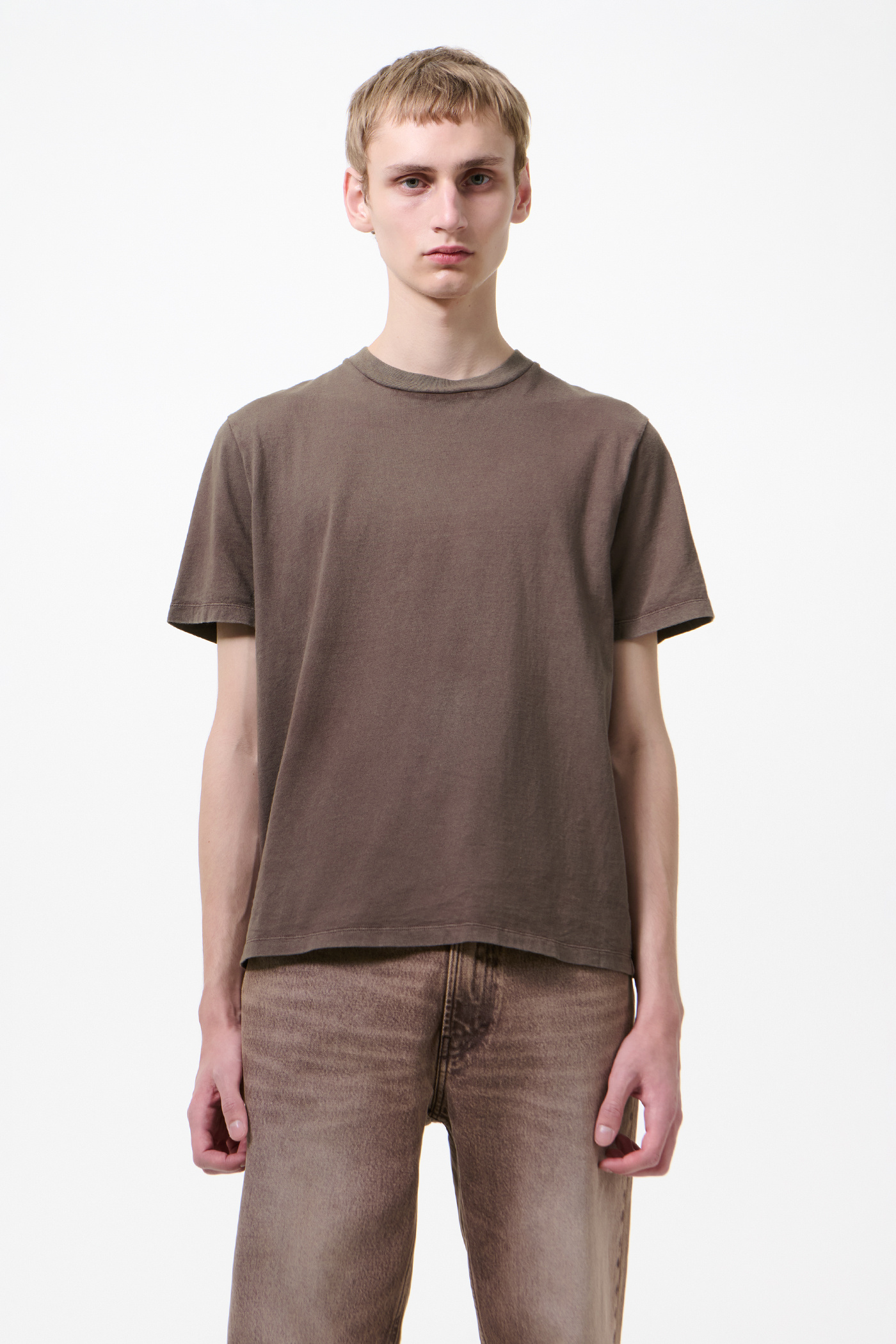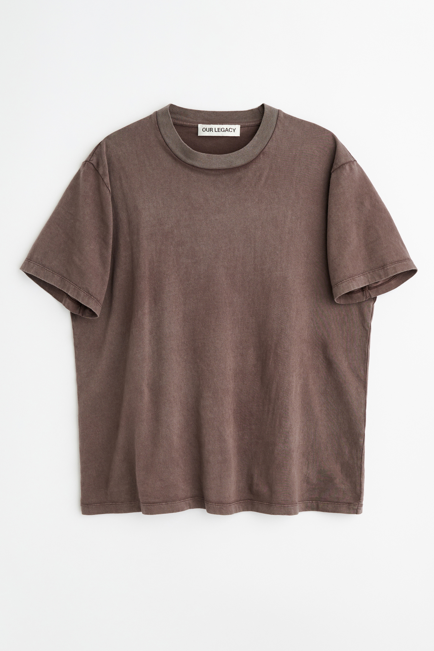 Our Box T-shirt in Worn Brown Legacy Jersey. Produced in Portuguese cotton jersey, the men's Box T-shirt has a boxy fit and features natural pigment dyeing, a ribbed collar and a straight hem.