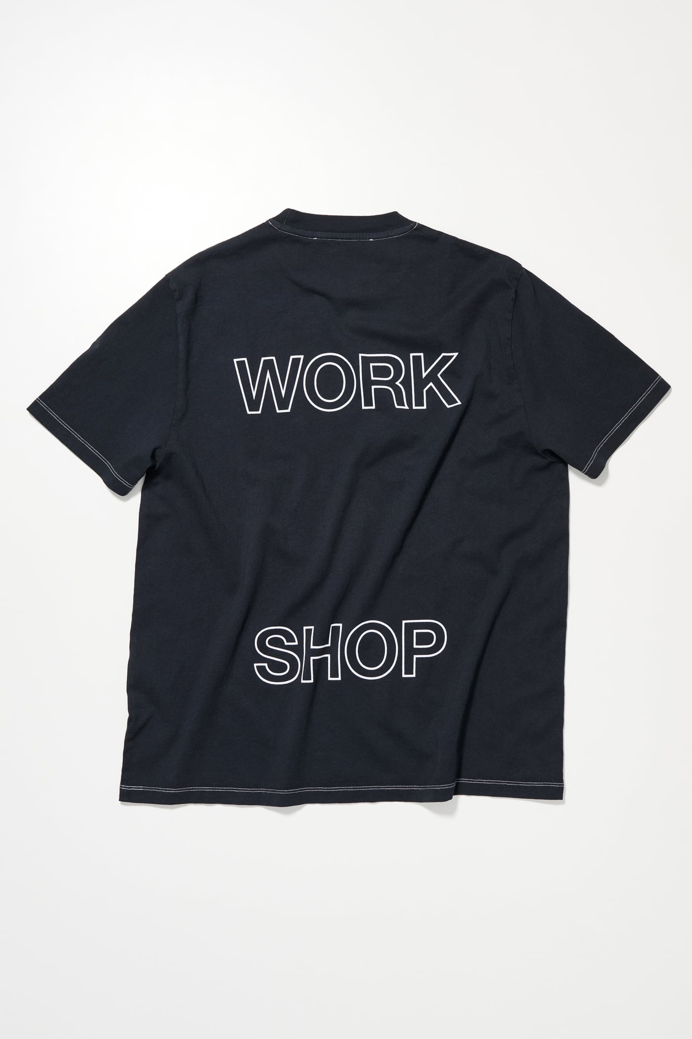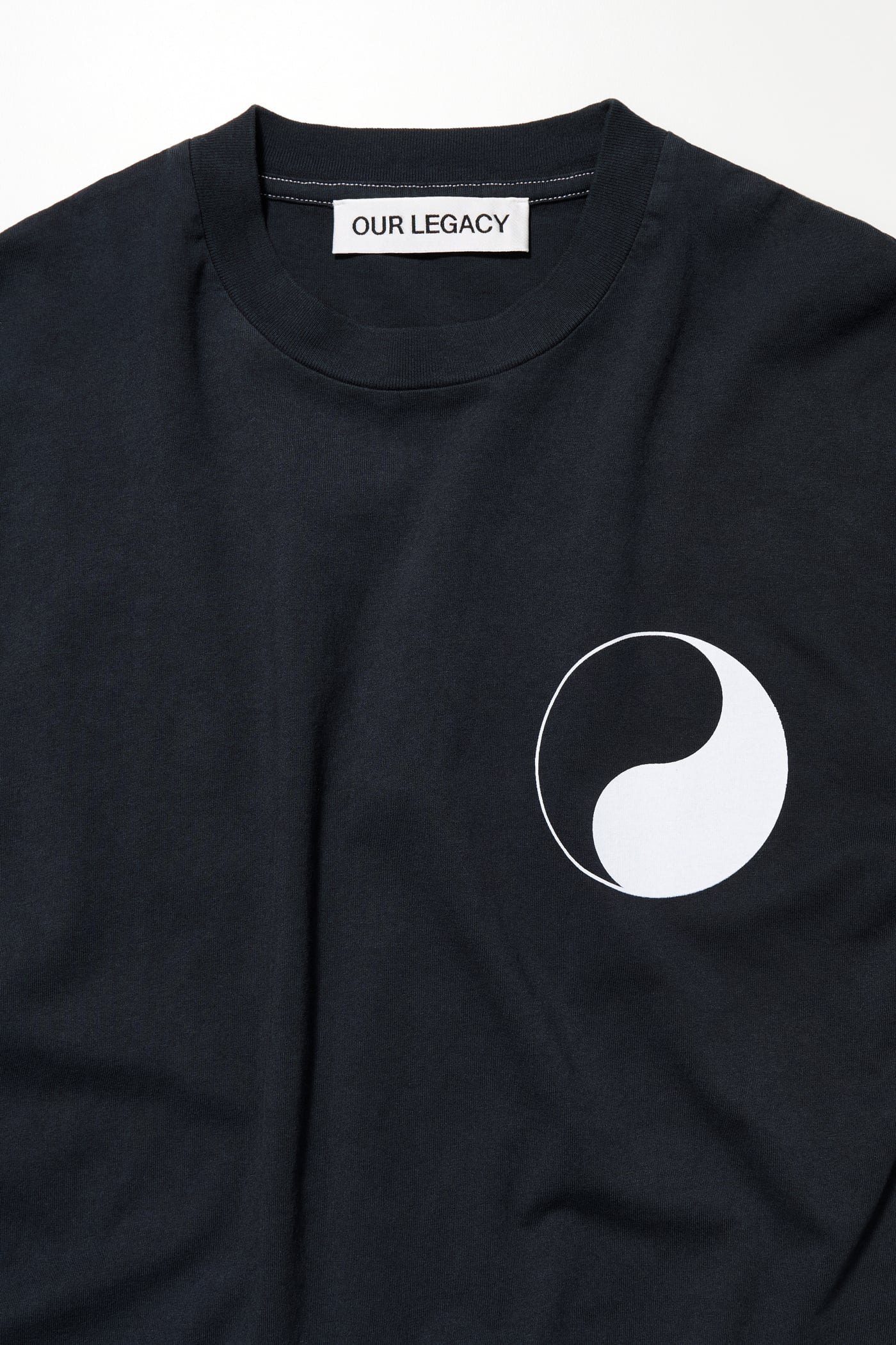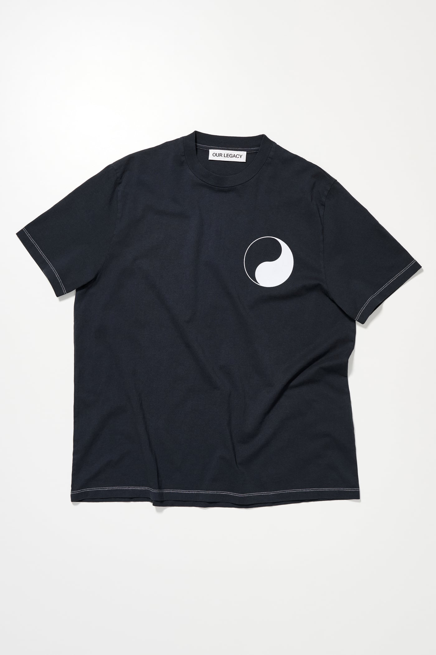 Box T-Shirt in Black Yin Yang Print. Produced in an organic Portuguese cotton jersey, the mens Box T-Shirt has an oversized, boxy fit and features our Yin Yang logo chest print, WORK SHOP back print, a fine rib collar and straight hem.