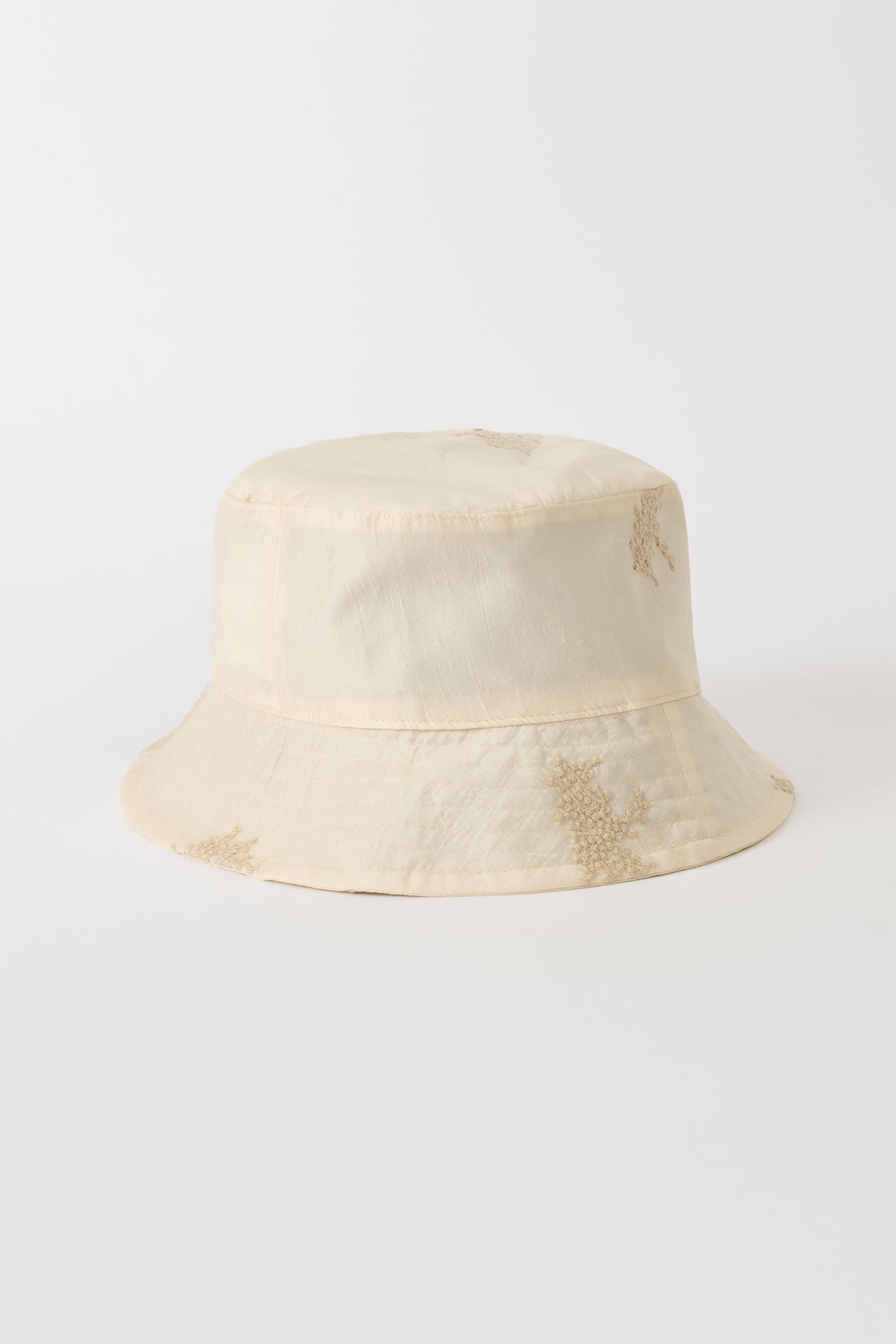 Our Bucket Hat in Ivory Bloom Ethereal Veil. Produced in a lightweight Chinese lyocell and polyester blend, the Bucket Hat features a stitched brim, delicate embroidery floral details and a metal Our Legacy bean rivet.