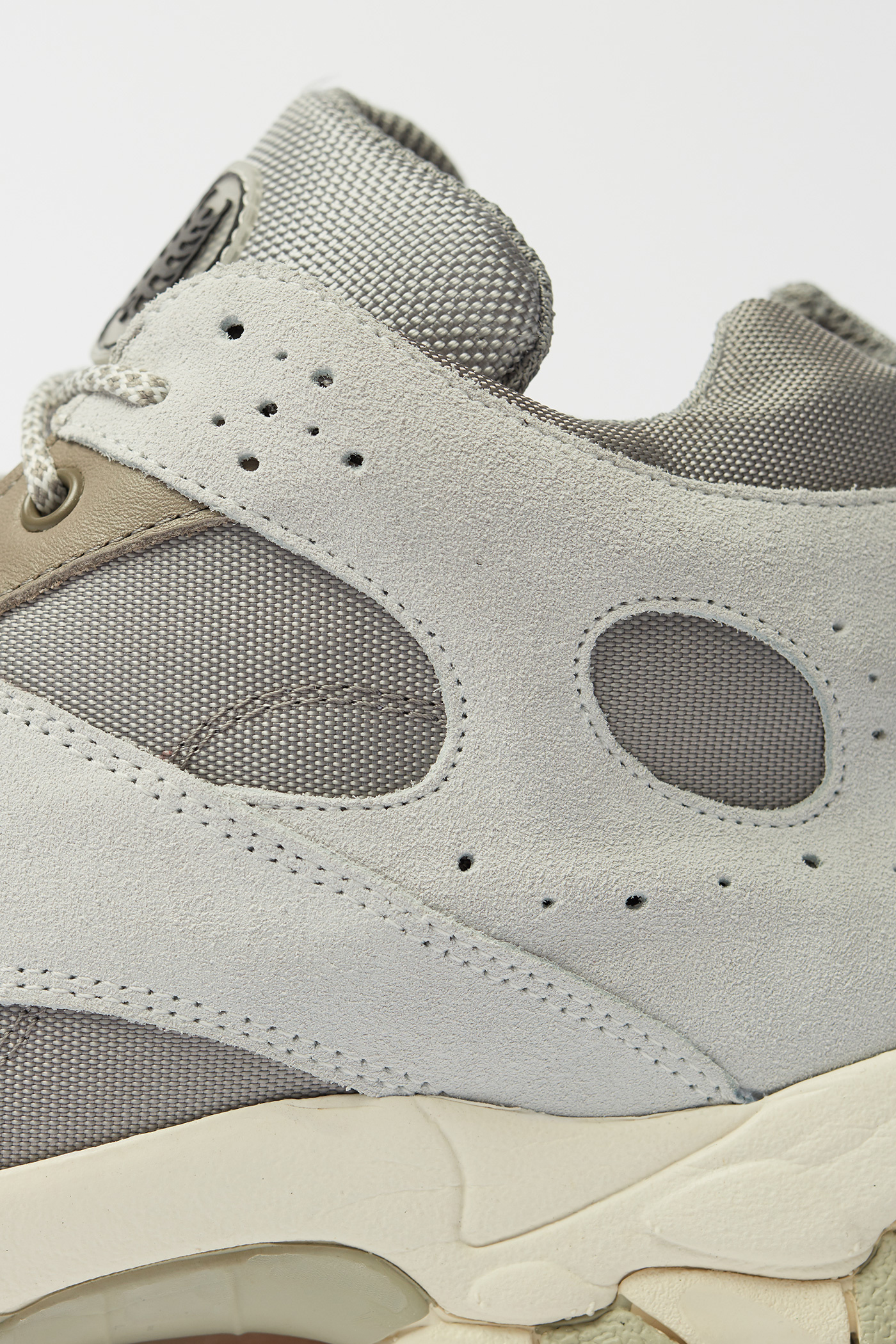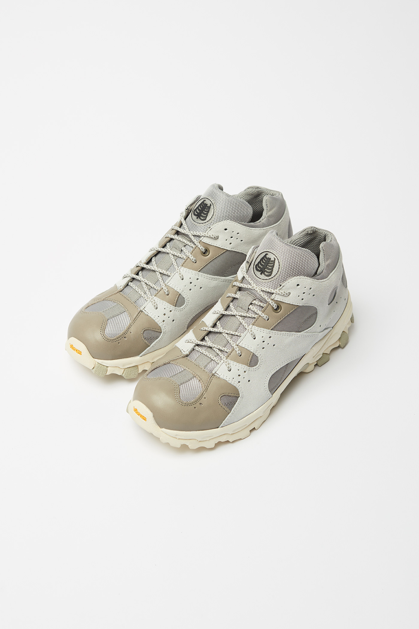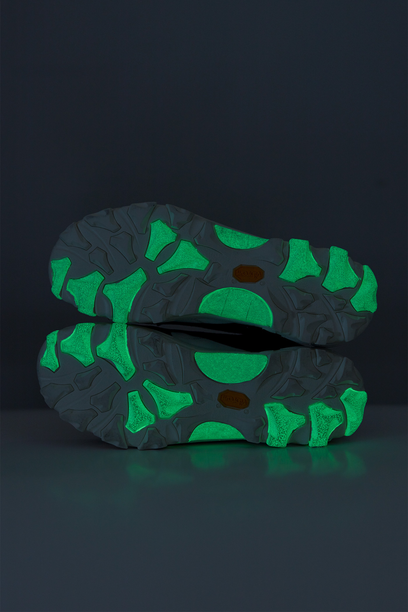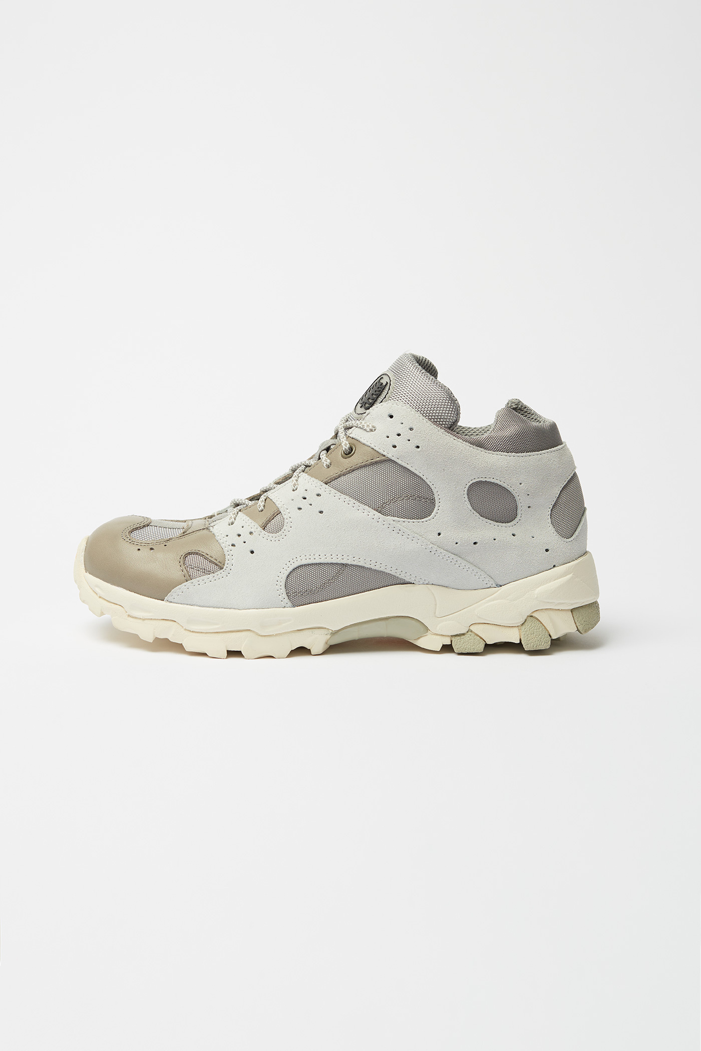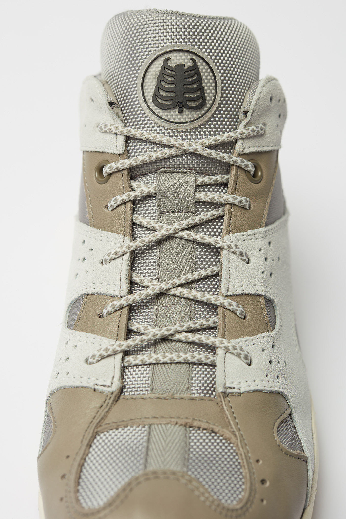Our Cage Sneaker in Roccia. Produced in Italian suede and leather with ballistic cordura panels, the mens mid height Cage Sneaker features a Vibram sole with glow in the dark sections, jacquard laces and a rubber rib cage patch on the tongue.