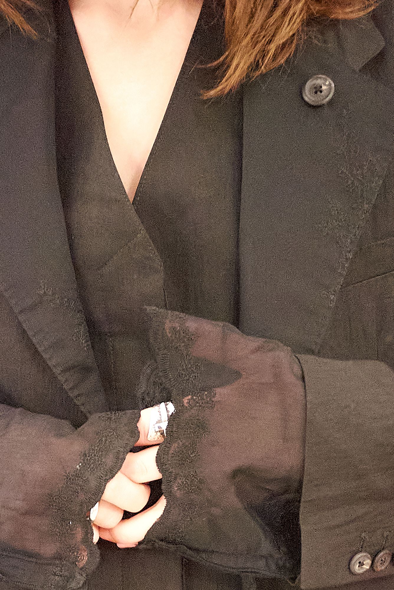 Ava: The reversible Drip Blazer. The added lace on the sleeves and hem adds bit of flair to my everyday outfit, making a garment that can be quite boxy and masculine more feminine and romantic.