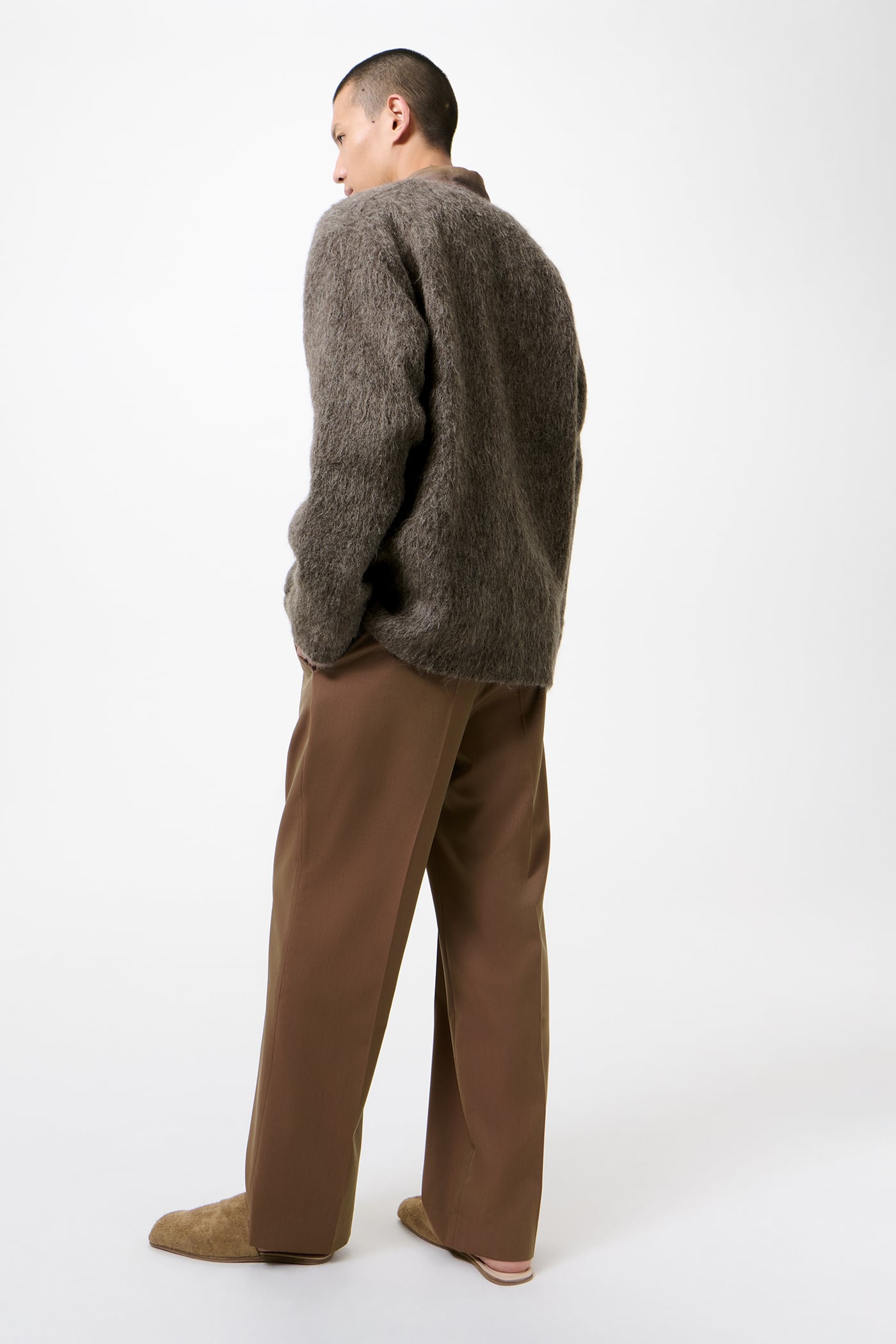 Our Cardigan in Mole Grey Hairy Wool. Produced in Italian yarn with a soft, hairy texture, this cardigan is crafted from a blend of wool, polyester, acrylic, alpaca, polyamide and other fibres. The Cardigan has a relaxed fit and features a V-neck collar, leather buttons and two front pockets.