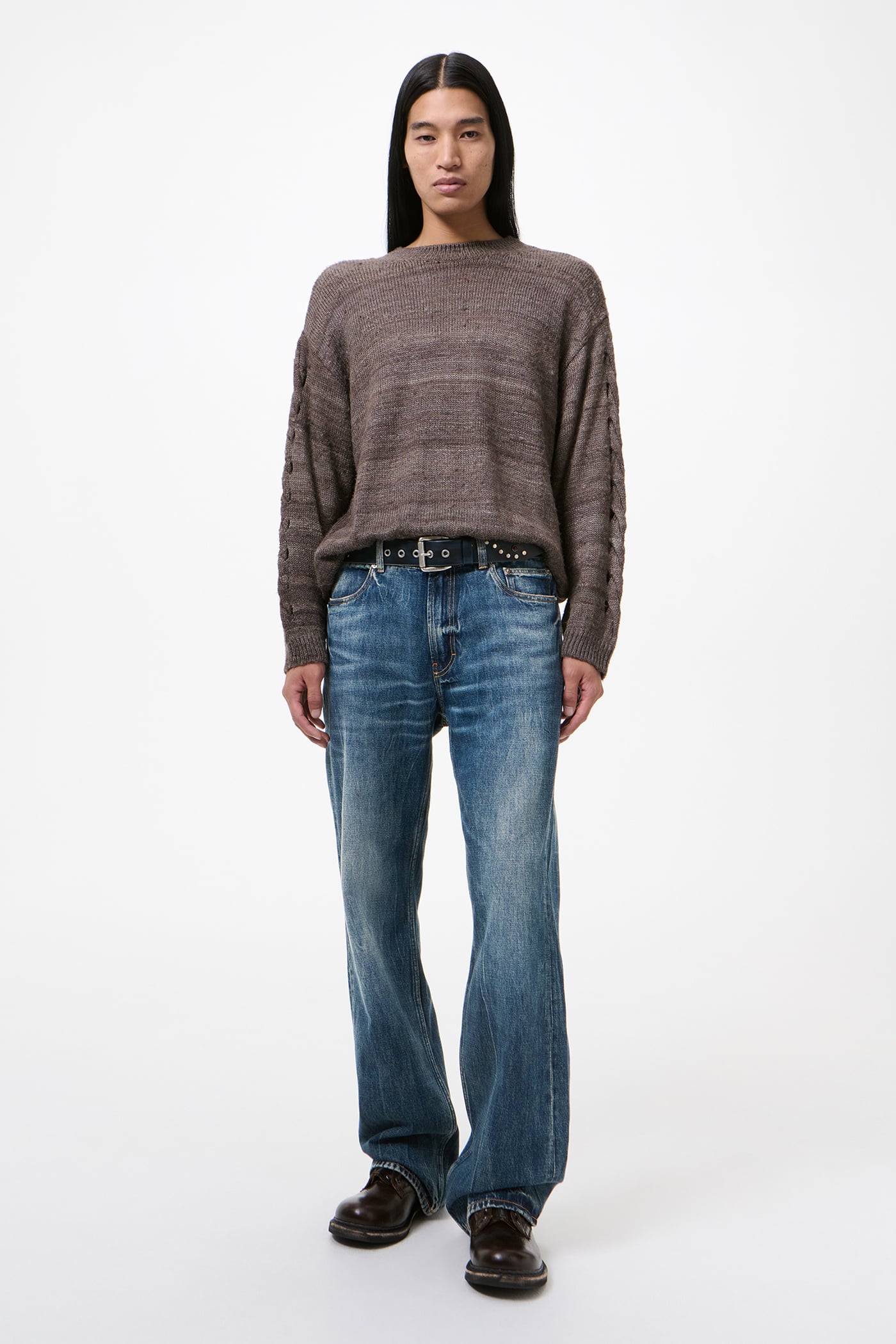 The broken twill denim reimagines the classic twill weave by interrupting its traditional diagonal lines to form an irregular, zigzag texture. This distinctive pattern enhances the fabric's aesthetic appeal while reducing the twisting often seen in standard denim. The fade and distressing of this broken twill denim have been meticulously crafted by hand, utilizing artisanal techniques that create natural, uneven pressure and movement unattainable by machine, ensuring every piece has its own character.