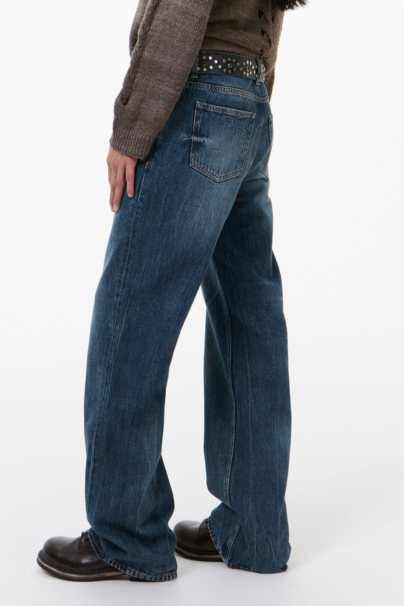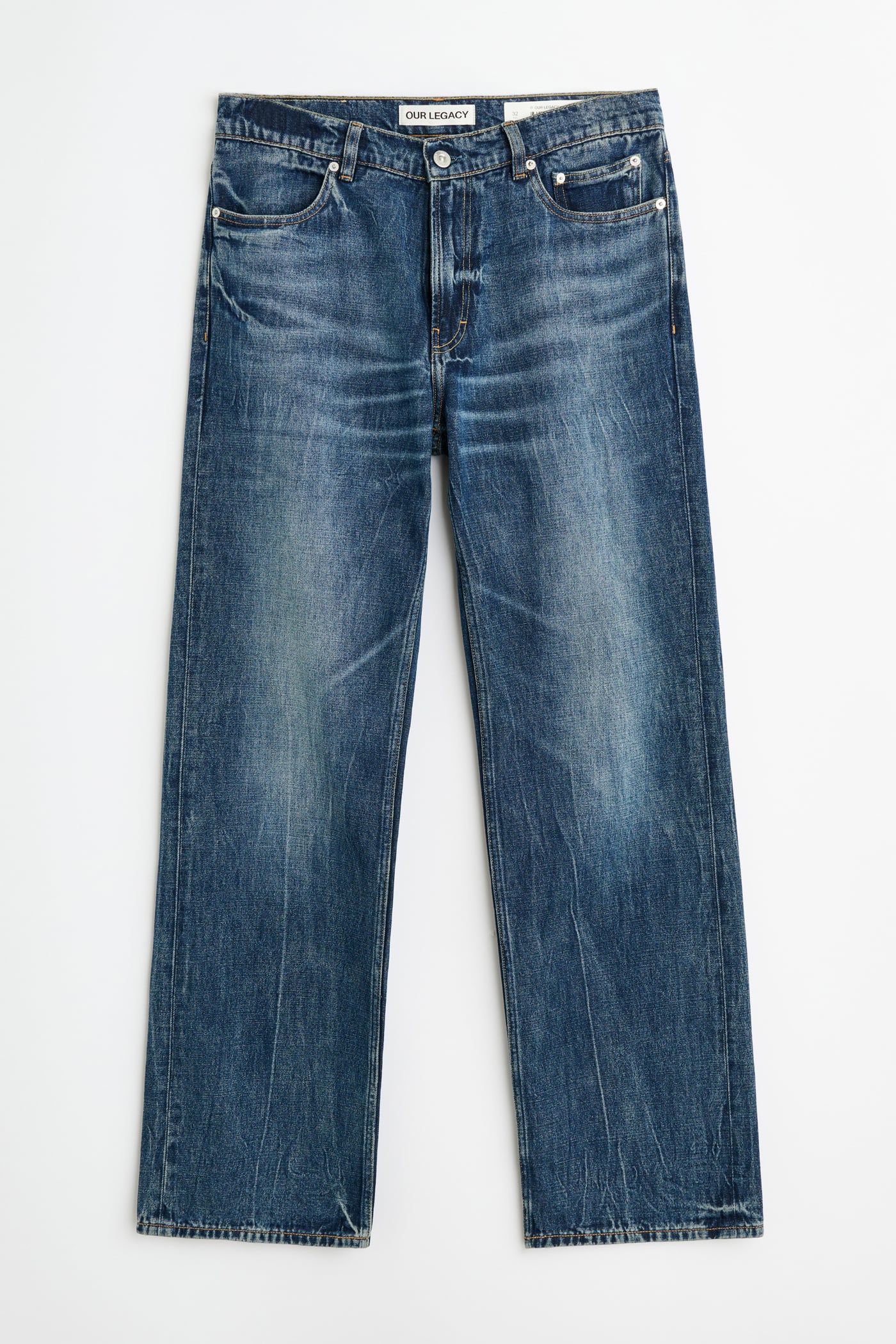 Our Carlson Cut in Vienna Blue Wash. Produced in Turkish broken twill denim that has been indigo dyed and vintage washed, the Carlson Cut has a high waist, straight hip and an extended leg with a slight boot cut, and features a zip fly, steel rivets, five pockets and an Our Legacy embossed patch.