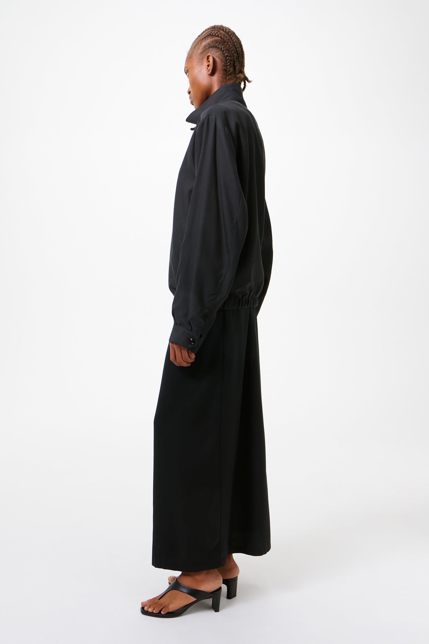 Our Casino Jacket in Still Black Calm Cupro Cotton. Produced in a Japanese cupro and cotton fabric, the Casino Jacket has a short, boxy fit and features a funnel neck collar, a Lampo two way zip, corozo button cuffs and an elastic hem. The lightweight material balances a soft hand with durable wear.