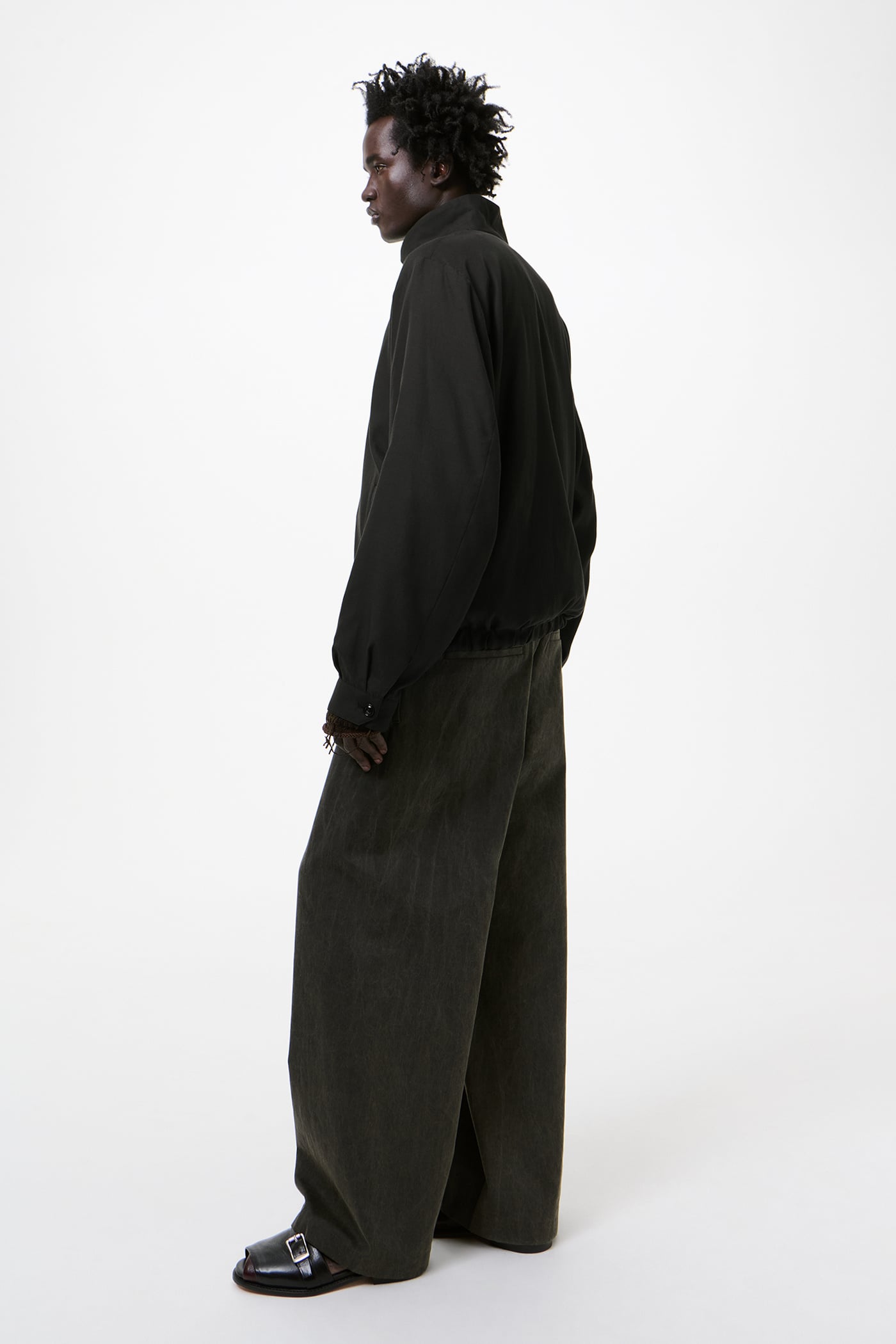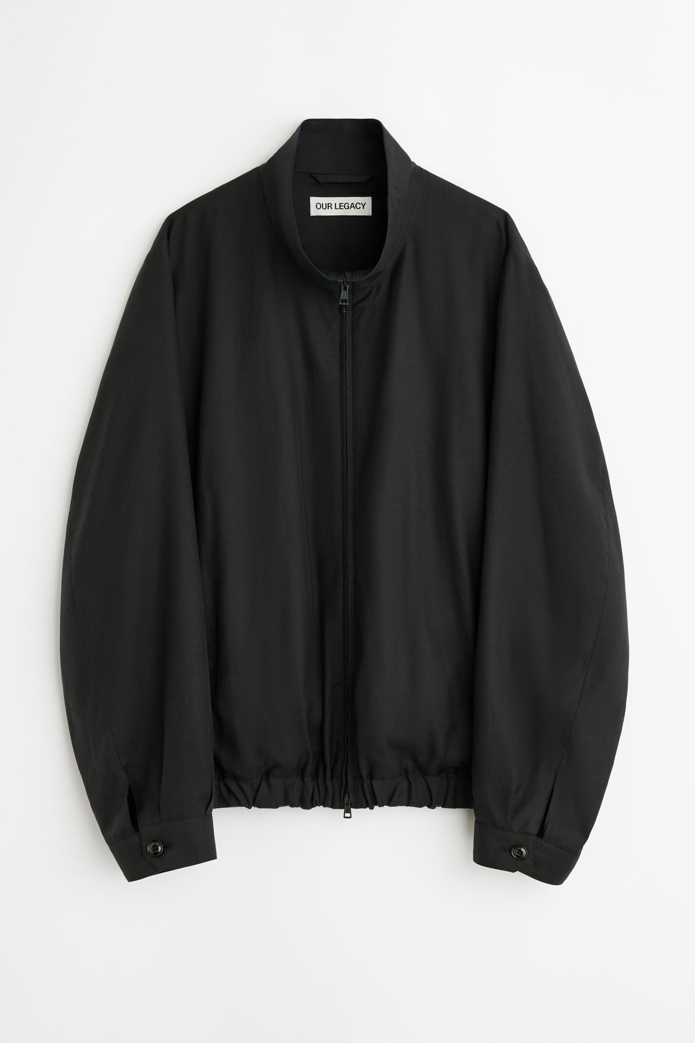 Our Casino Jacket in Still Black Calm Cupro Cotton. Produced in a Japanese cupro and cotton fabric, the Casino Jacket has a short, boxy fit and features a funnel neck collar, a Lampo two way zip, corozo button cuffs and an elastic hem. The lightweight material balances a soft hand with durable wear.