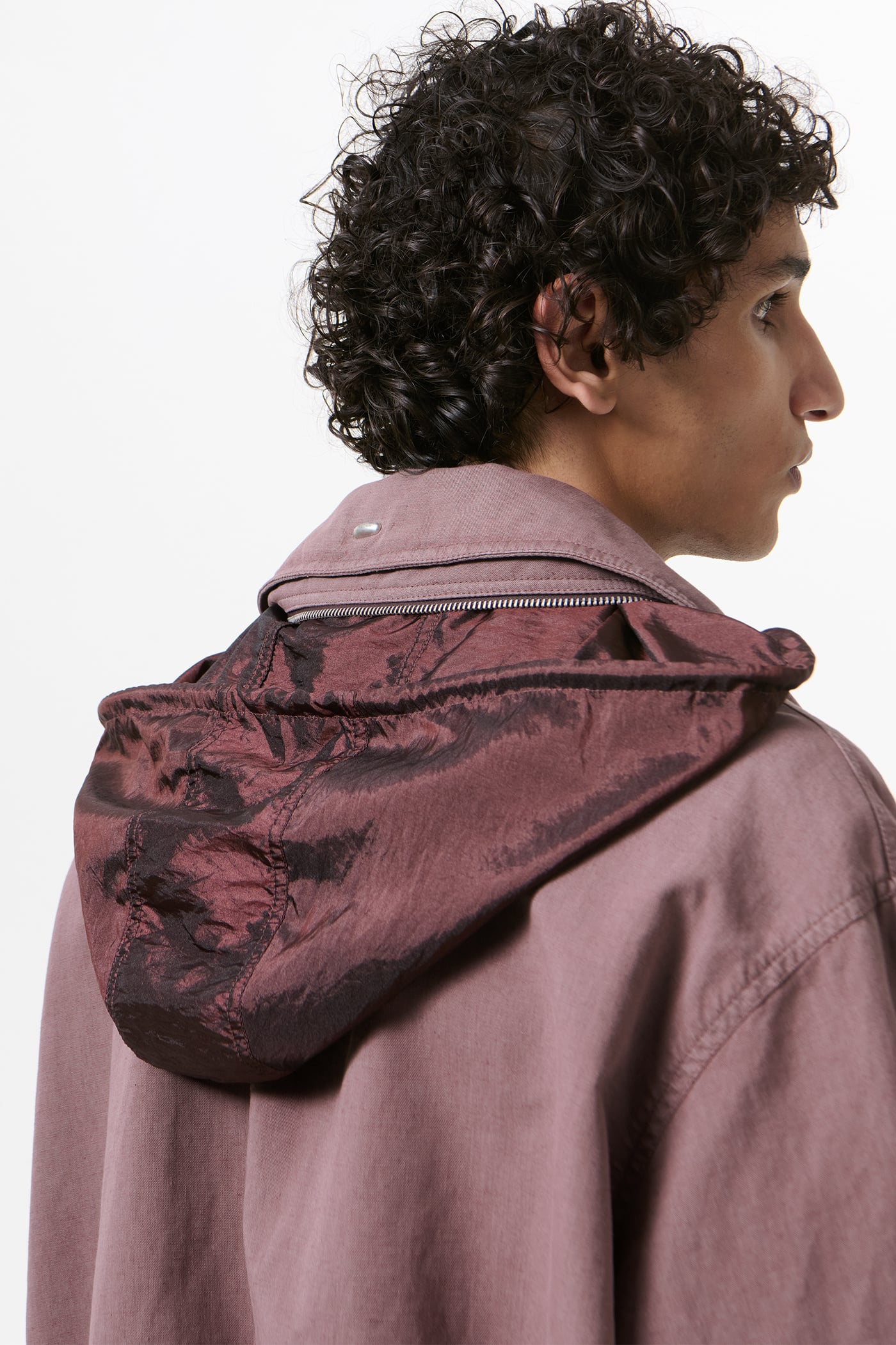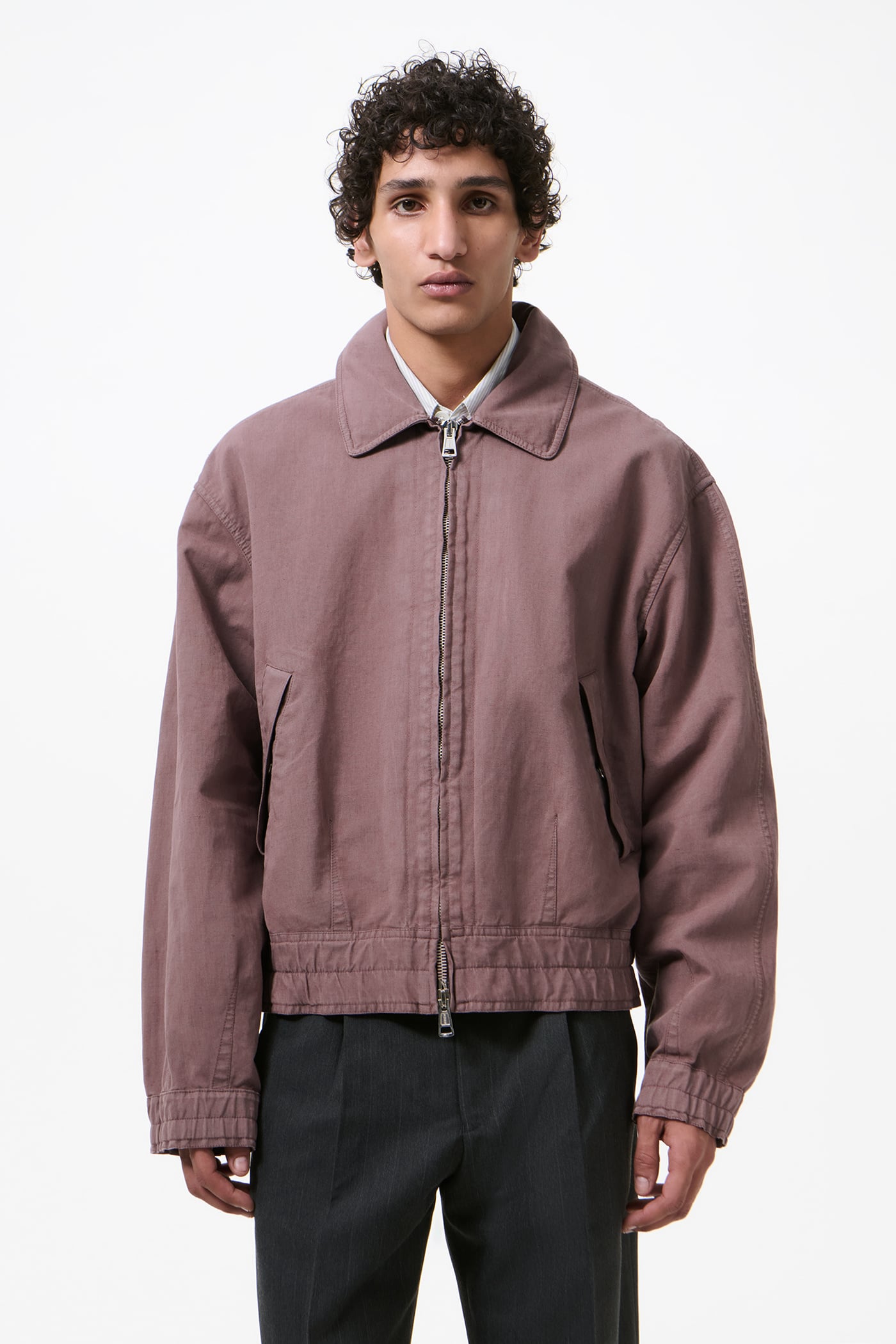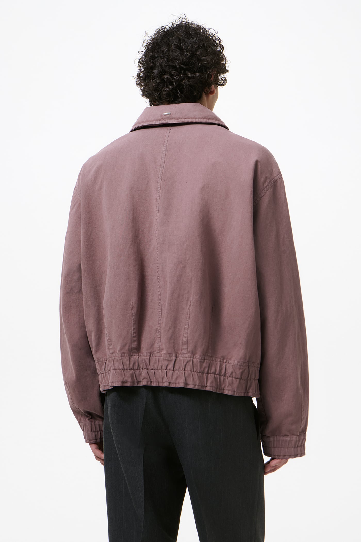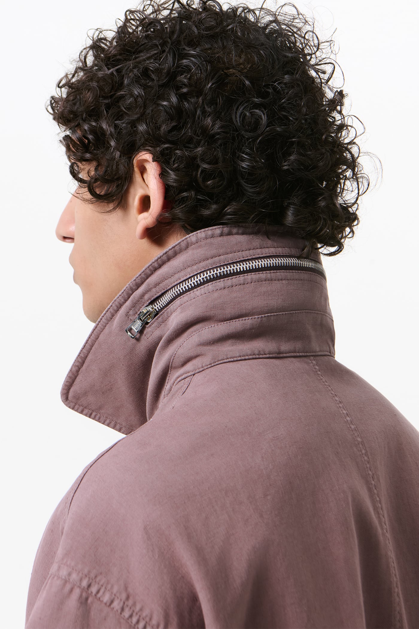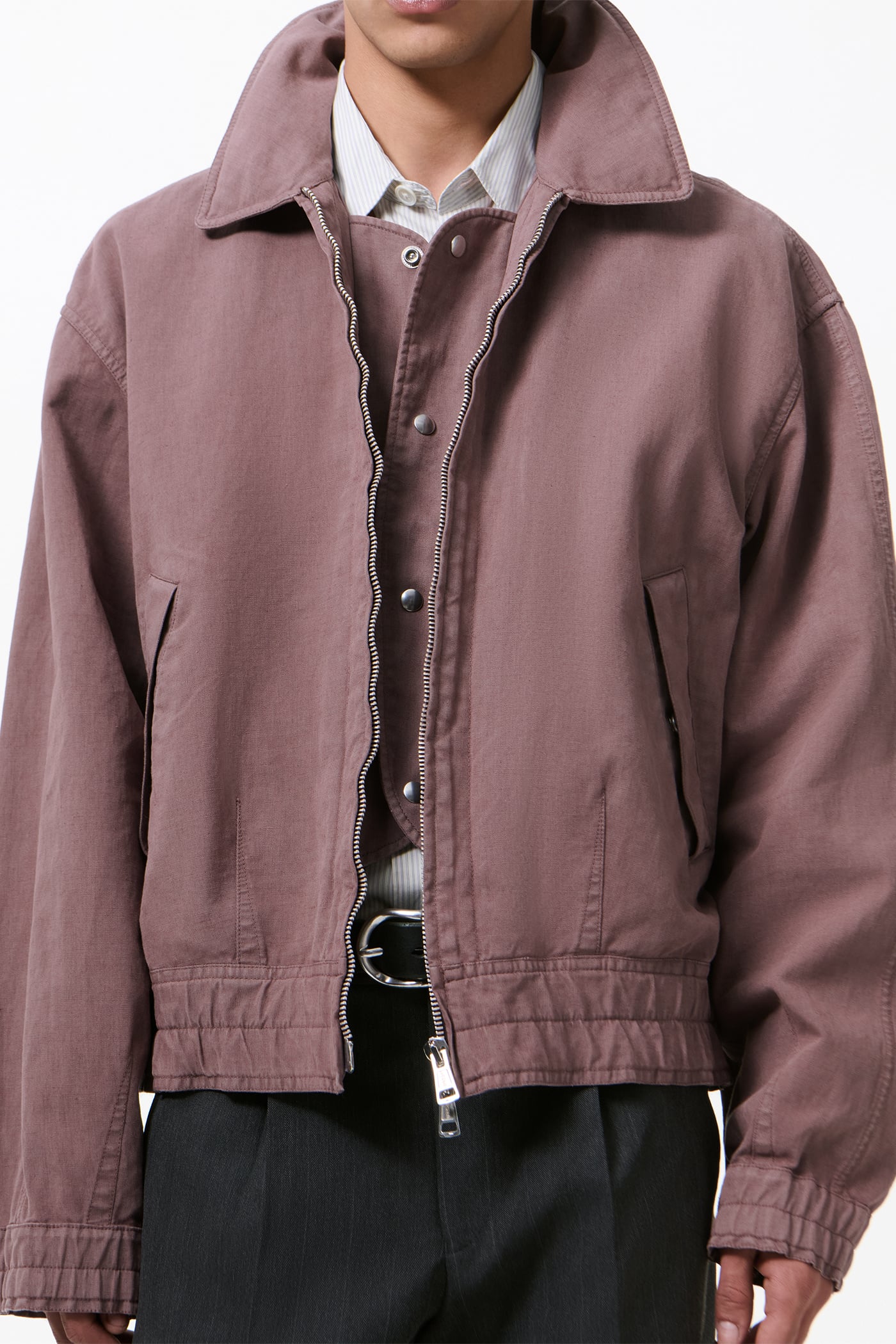 Our Command Jacket in Port Soft Coat. Produced in a piece dyed Chinese cotton, linen and polyurethane blend fabric, the Command Jacket is built on a bomber silhouette with a short body, darted details and elasticated cuffs and hem. It features a rounded collar with an under-collar zip that conceals a contrast fabric hood, a front zipper hidden by a grown-on bumper, and a double zip guard that snaps together to allow the jacket to be worn closed without fastening the zip for a layered look. Additional details include frogmouth welt pockets with snaps and stitched-through darts running into the elasticated hem and cuffs.
