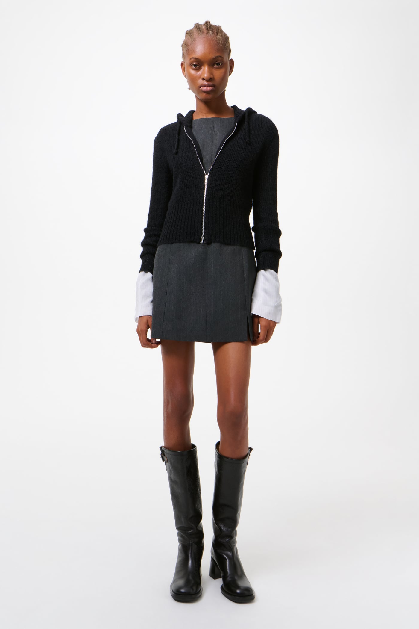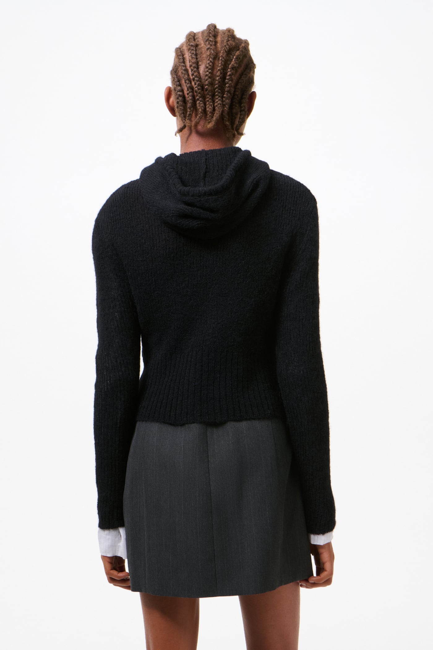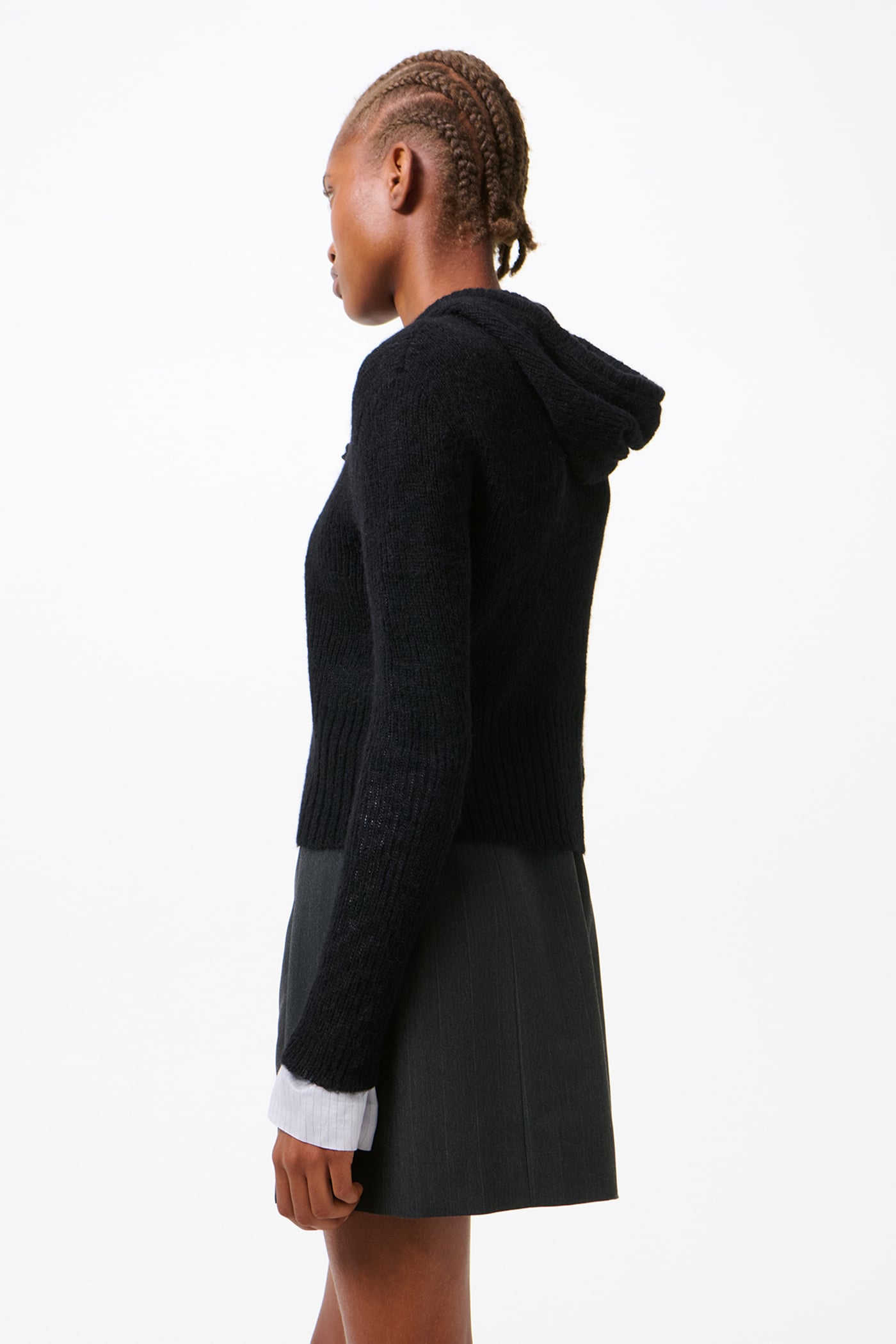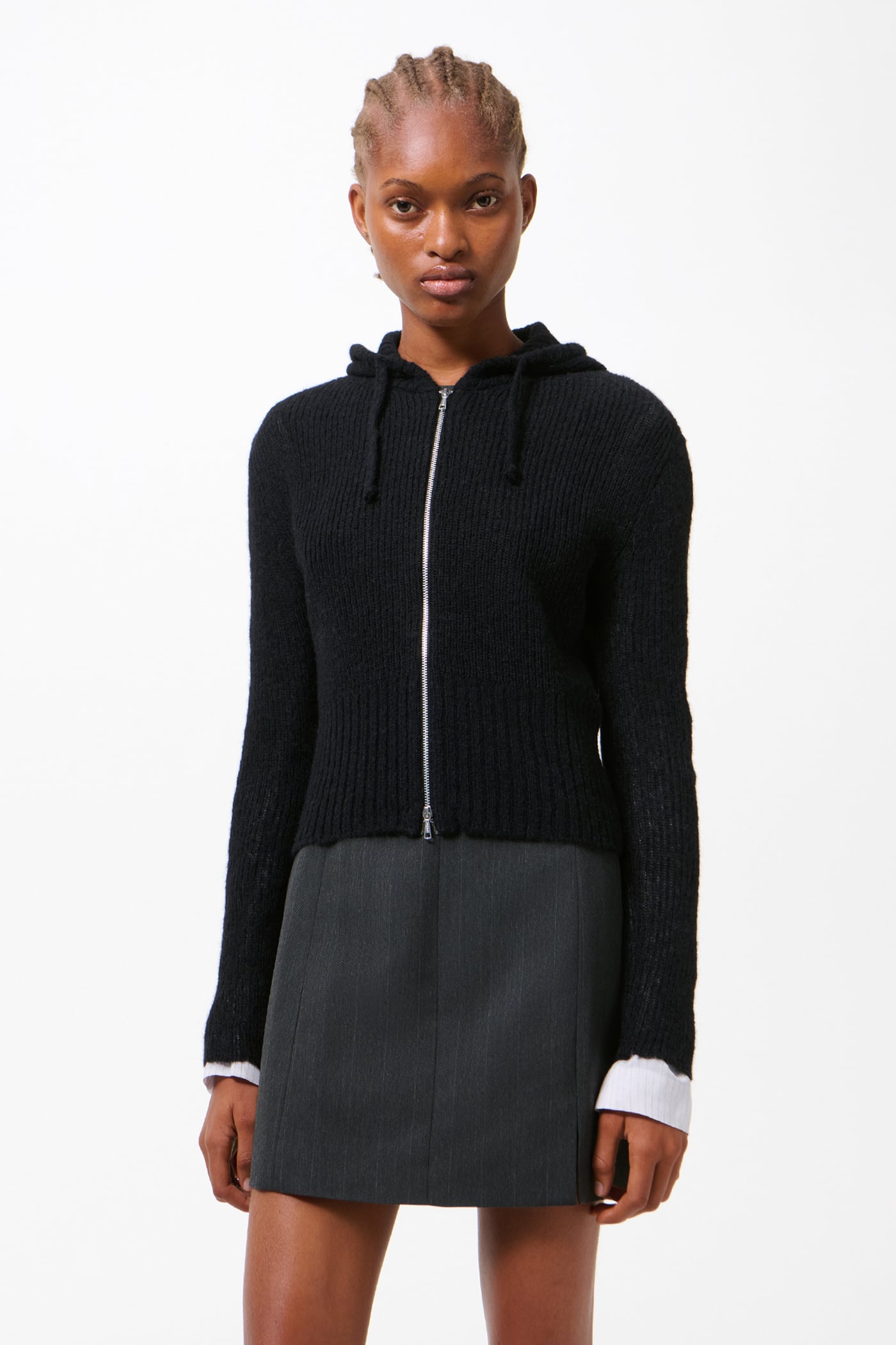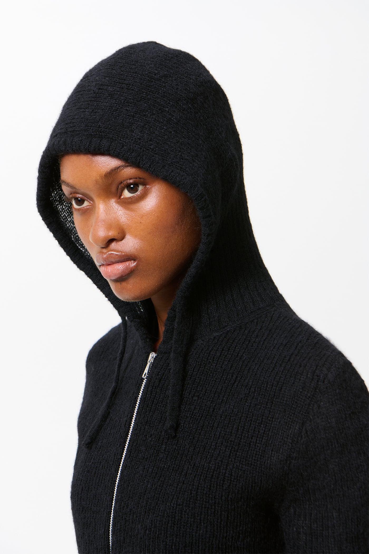 Our Compact Hood in Black Fuzzy Alpaca. Produced in a Italian fabric blend, the womens ribbed knit Compact Hood has a straight fit and features a drawstring hood, a two way zip and an enhanced ribbed hem.
