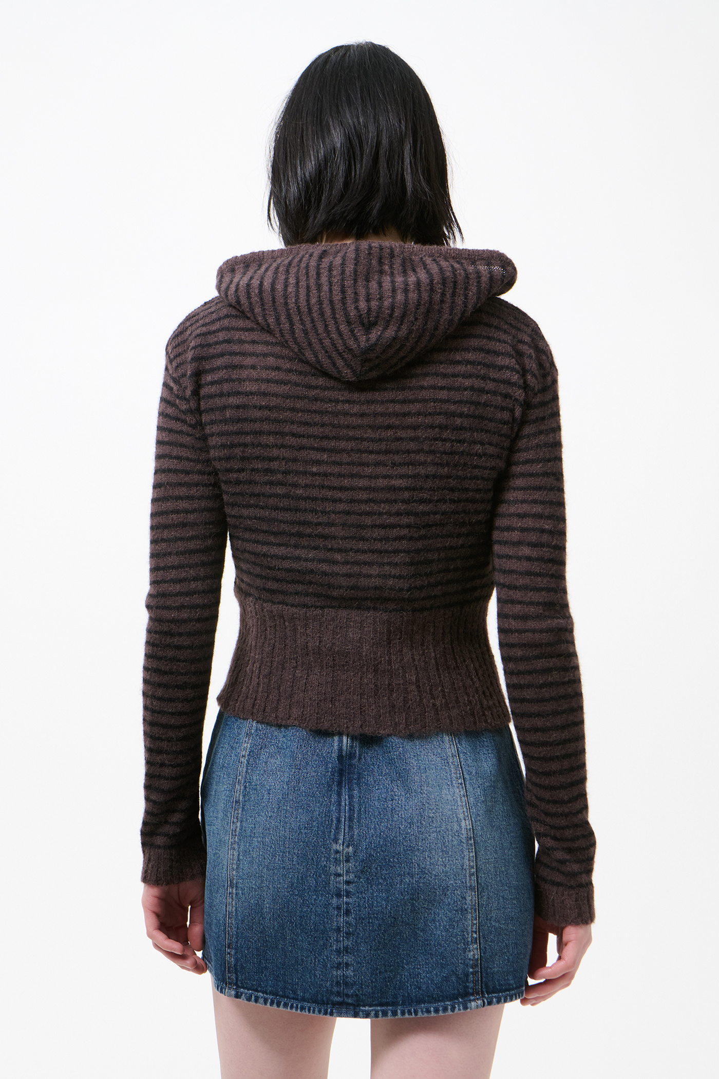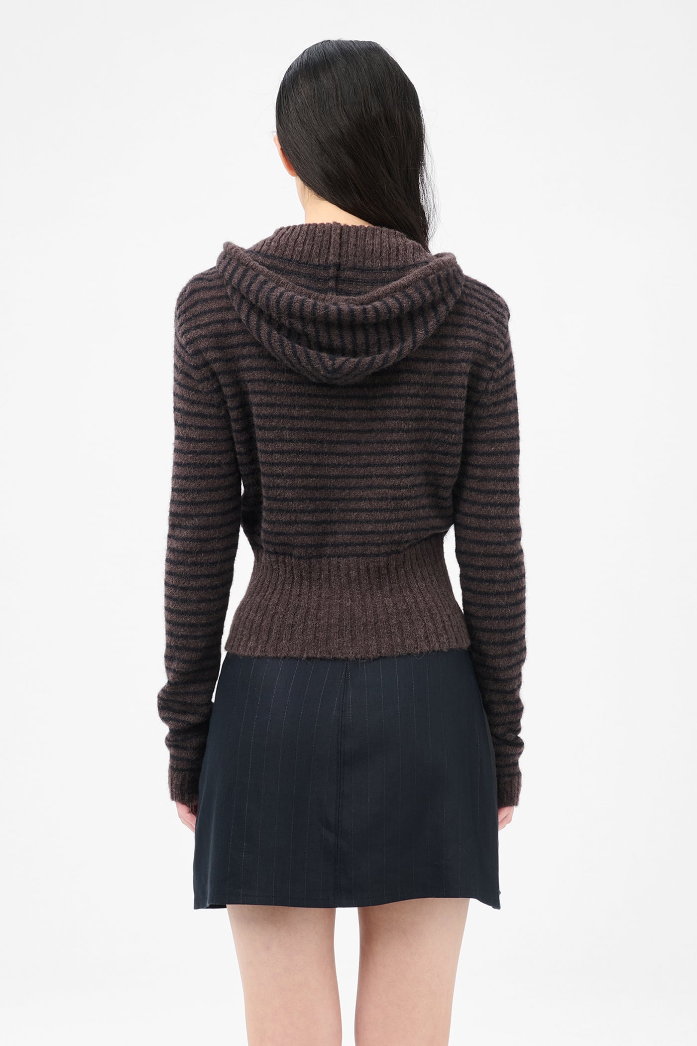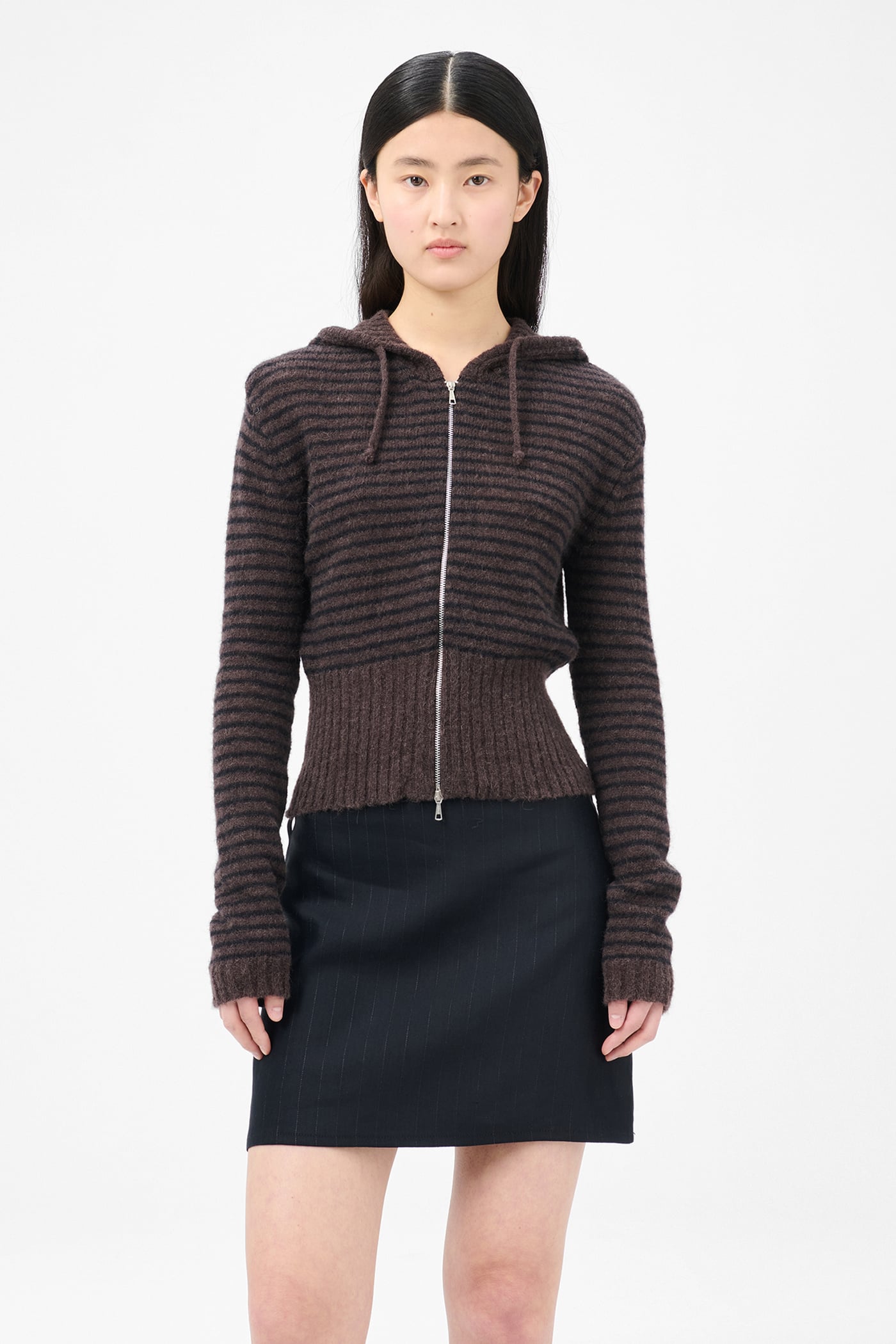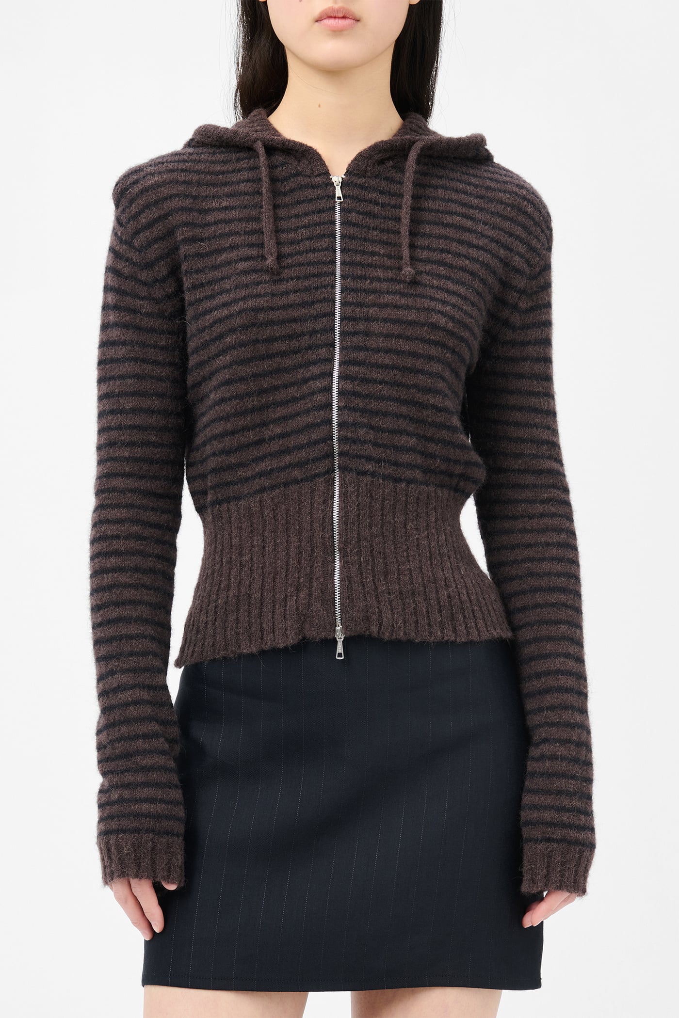 Our Compact Hood in Dirt Stripe Fuzzy Alpaca. Produced in Italian yarn combining alpaca and RWS wool with recycled polyamide and polyamide, the women's Compact Hood has a slim fit and features a striped pattern, drawstring hood, Lampo two-way zip and enhanced ribbed hem.