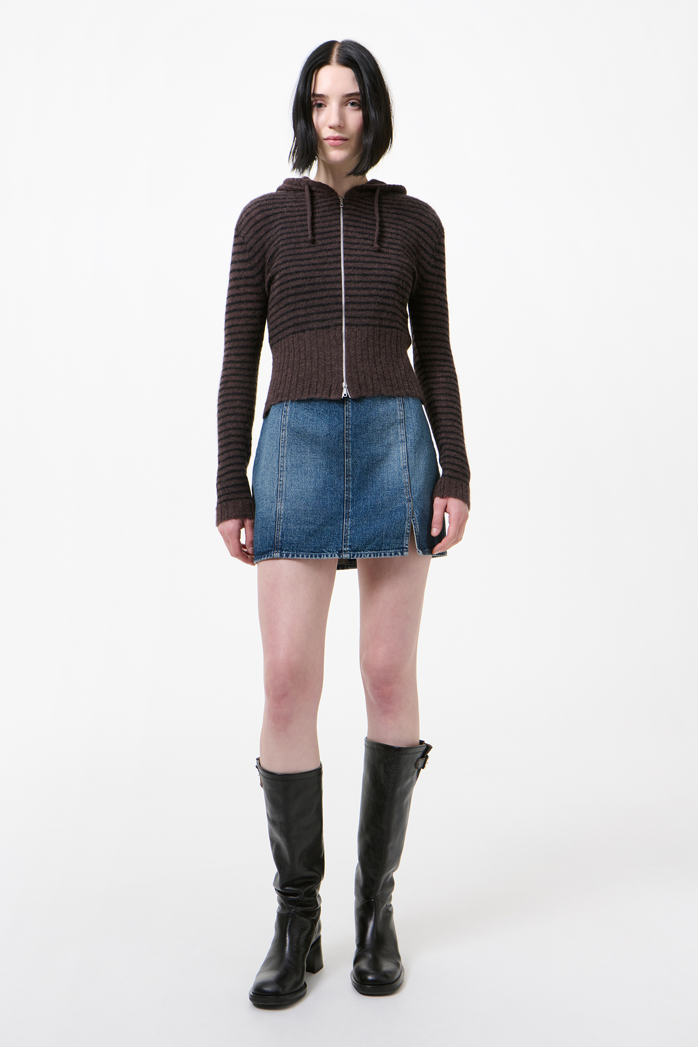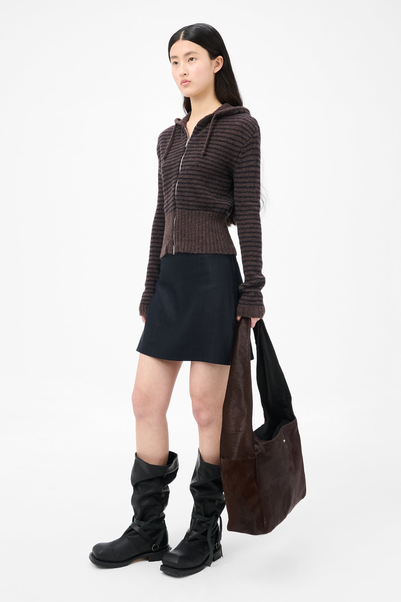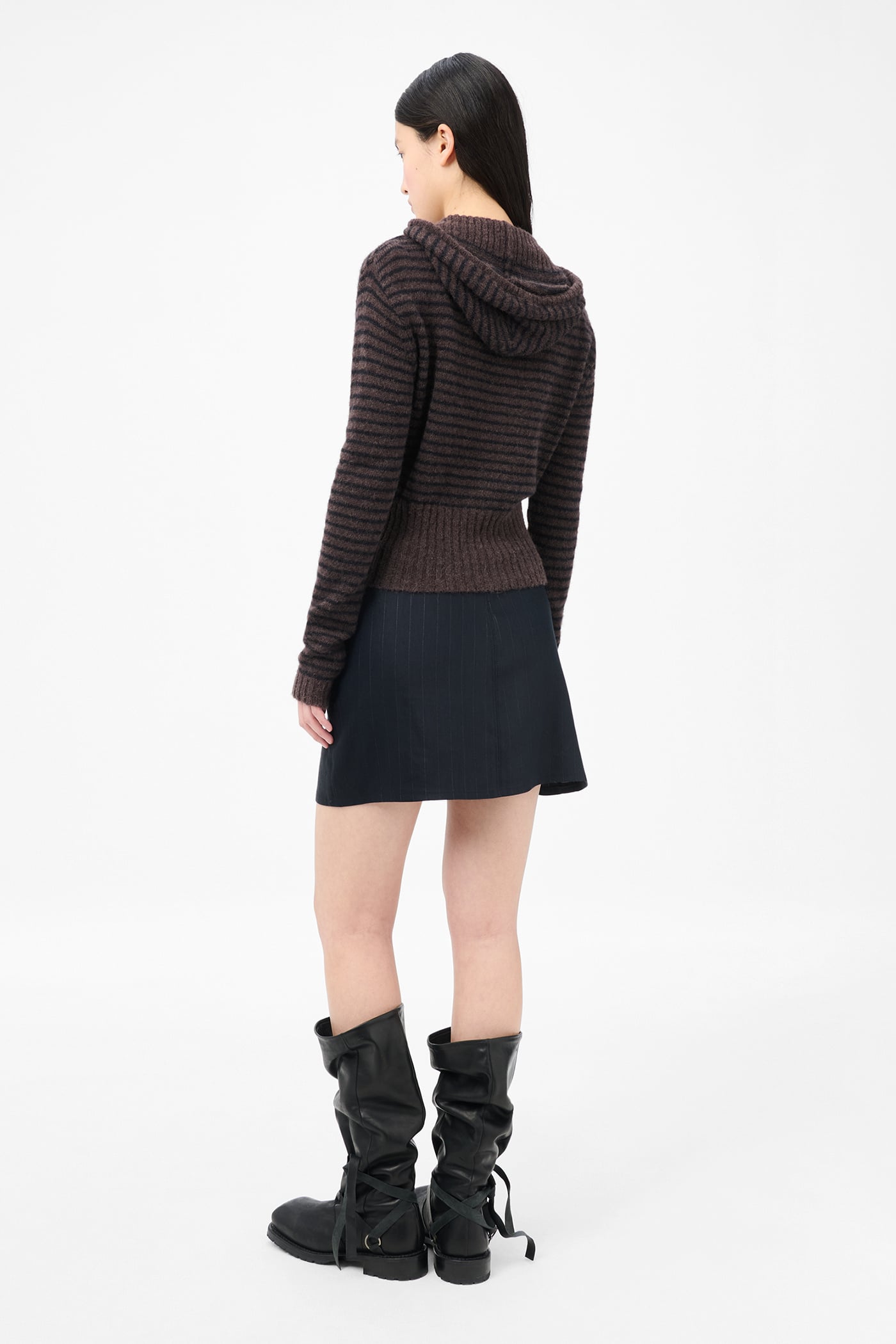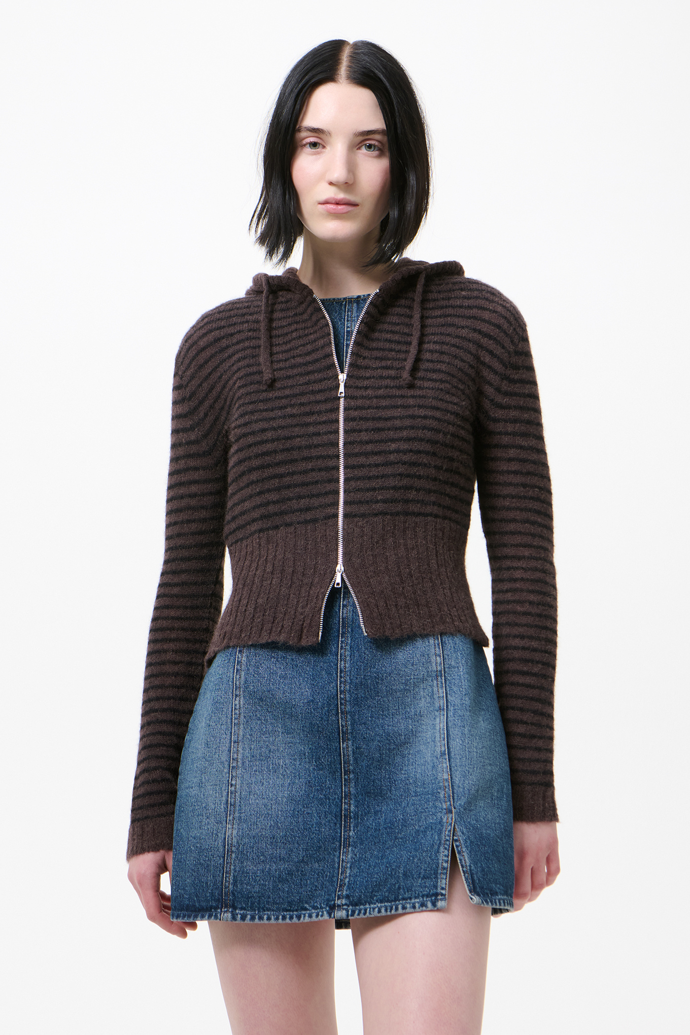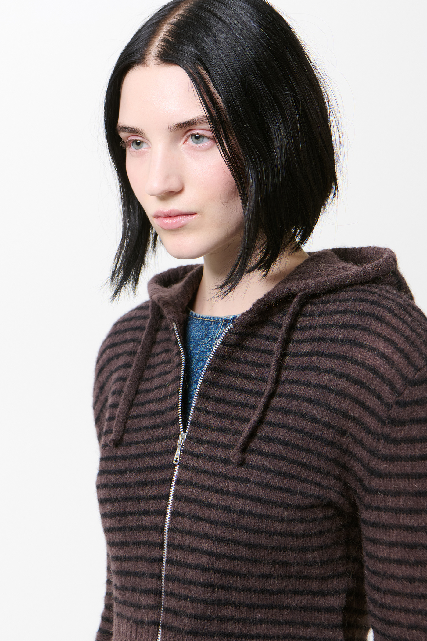 Our Compact Hood in Dirt Stripe Fuzzy Alpaca. Produced in Italian yarn combining alpaca and RWS wool with recycled polyamide and polyamide, the women's Compact Hood has a slim fit and features a striped pattern, drawstring hood, Lampo two-way zip and enhanced ribbed hem.