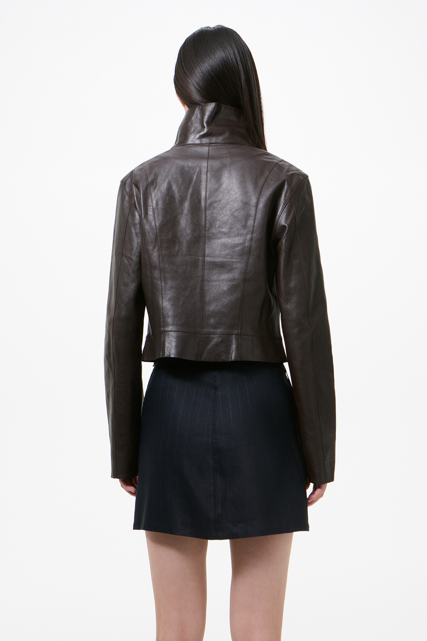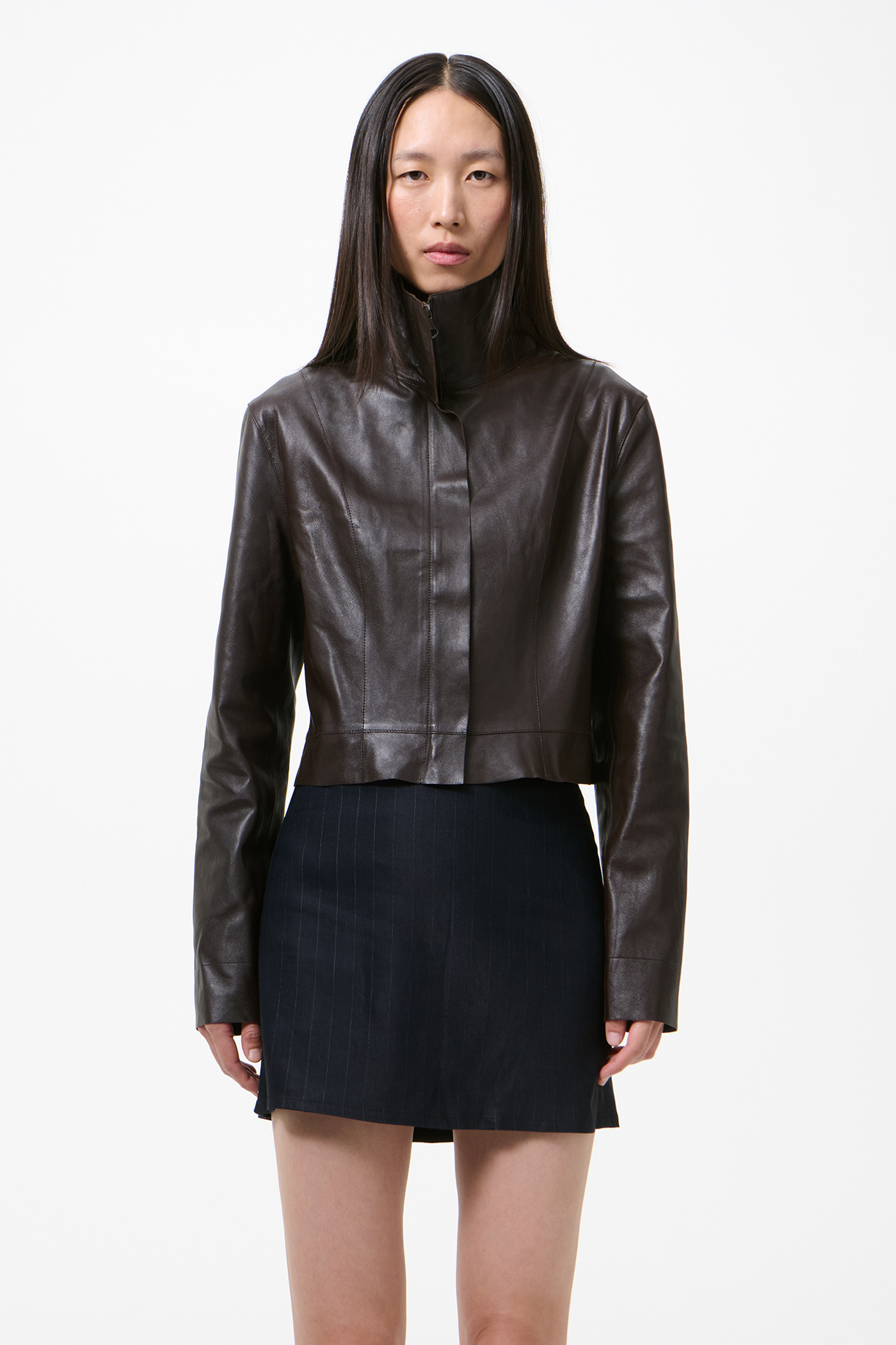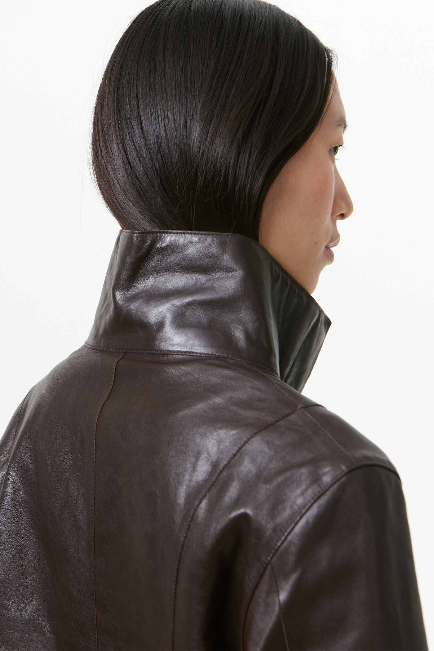 Our Concealed Jacket in Umber Brown Fluid Calfskin. Produced in Turkish calfskin leather, the women's Concealed Jacket has a fitted silhouette that finishes at the waist and features a folded collar that can be worn flat or zipped all the way up, a hidden placket with zip closure, full lining, and a raw hem. This cropped version of the Concealed Coat has a simplistic yet neat construction with no pockets, giving it a shirt-like aesthetic. The backside of the leather is specially treated to provide a slightly stiffer touch while maintaining the fluid quality of the calfskin.