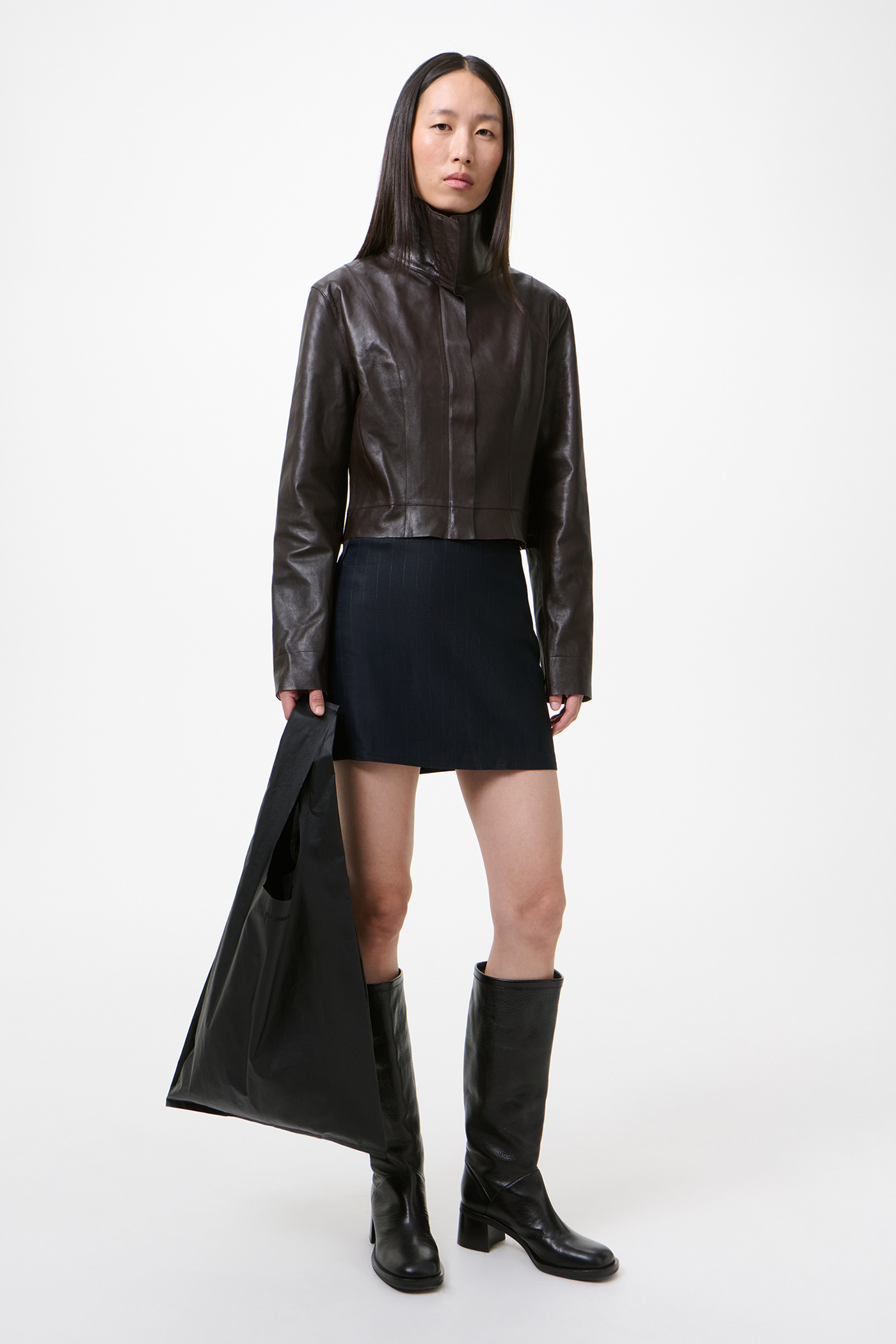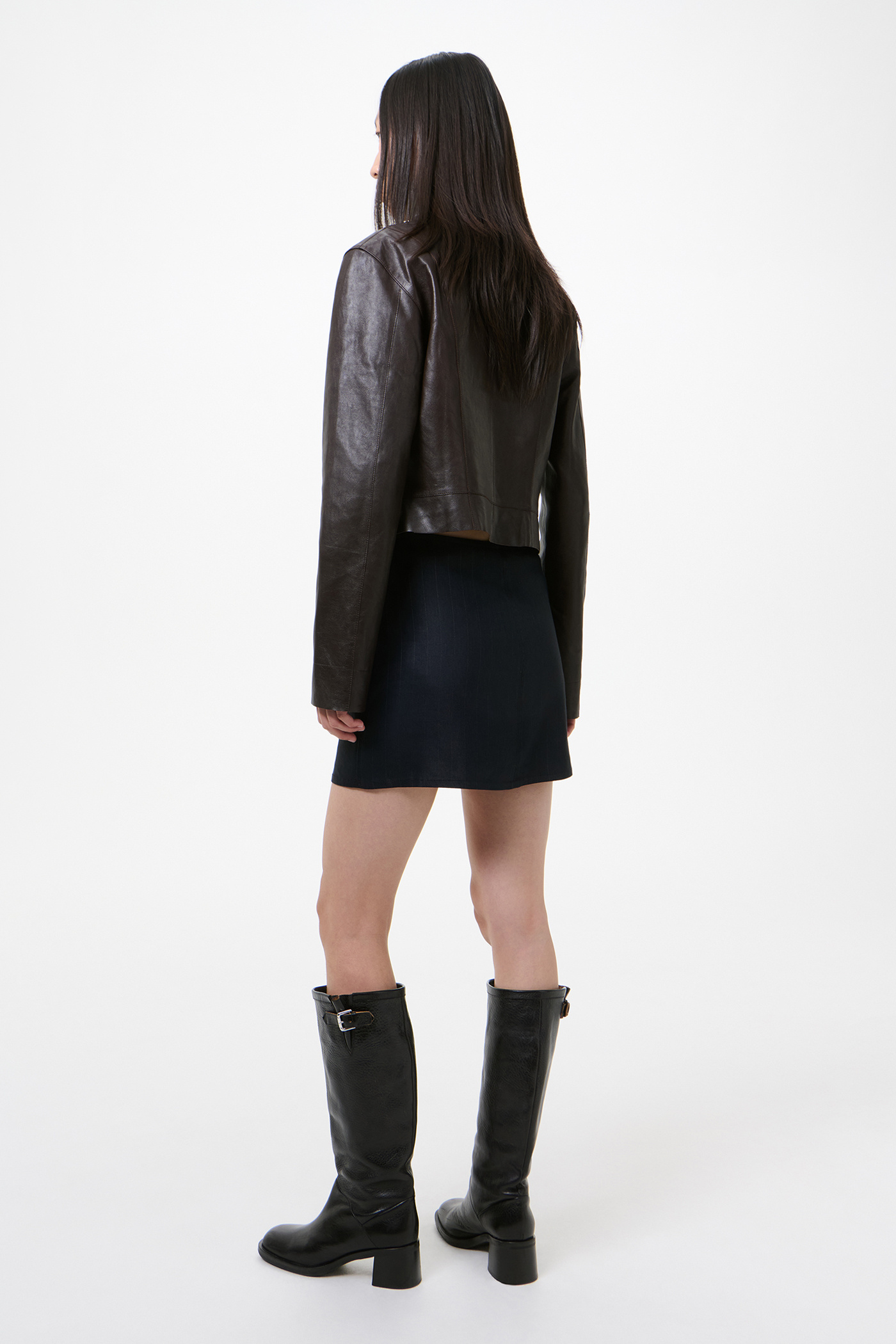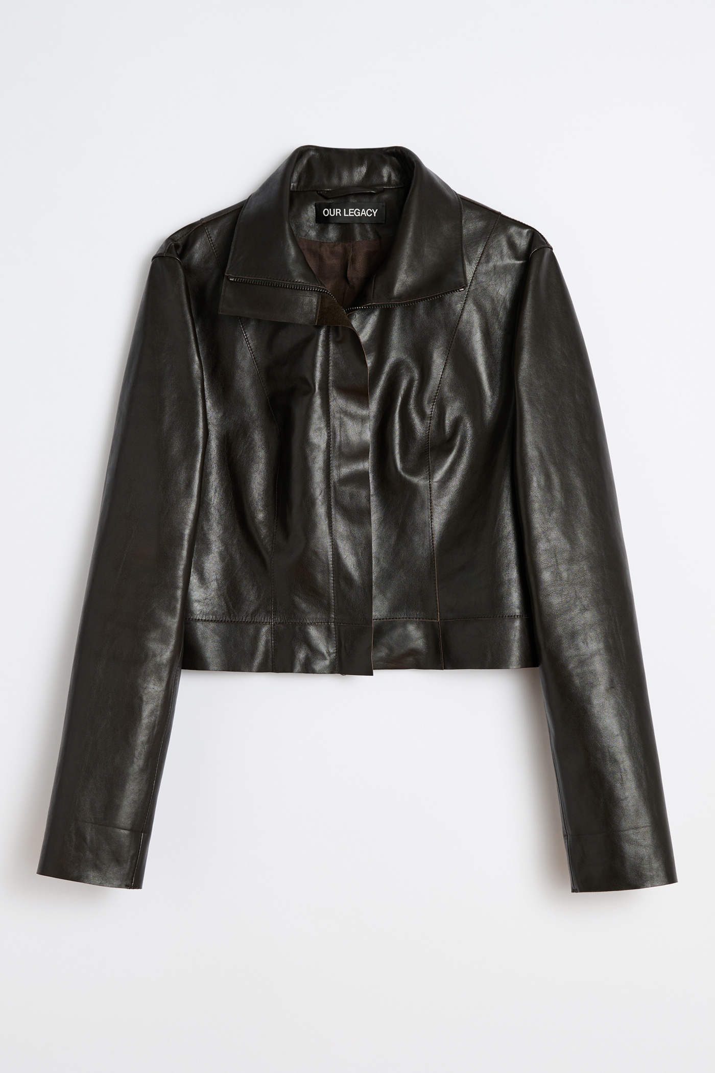 Our Concealed Jacket in Umber Brown Fluid Calfskin. Produced in Turkish calfskin leather, the women's Concealed Jacket has a fitted silhouette that finishes at the waist and features a folded collar that can be worn flat or zipped all the way up, a hidden placket with zip closure, full lining, and a raw hem. This cropped version of the Concealed Coat has a simplistic yet neat construction with no pockets, giving it a shirt-like aesthetic. The backside of the leather is specially treated to provide a slightly stiffer touch while maintaining the fluid quality of the calfskin.