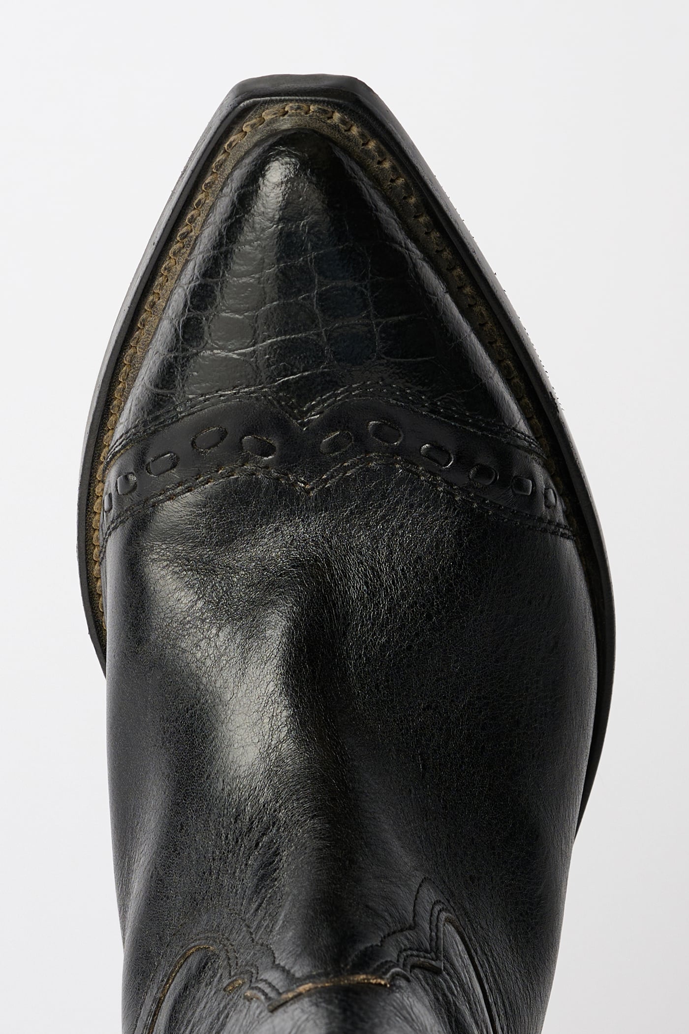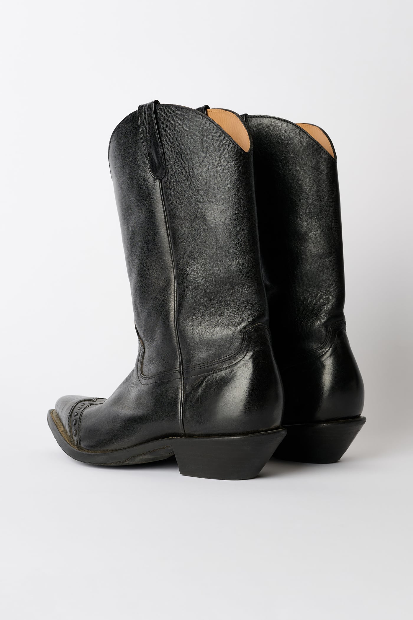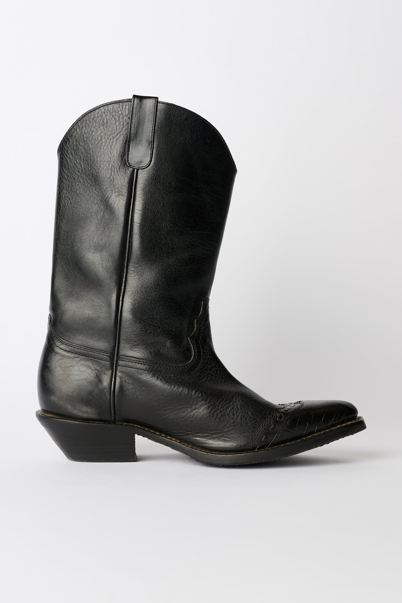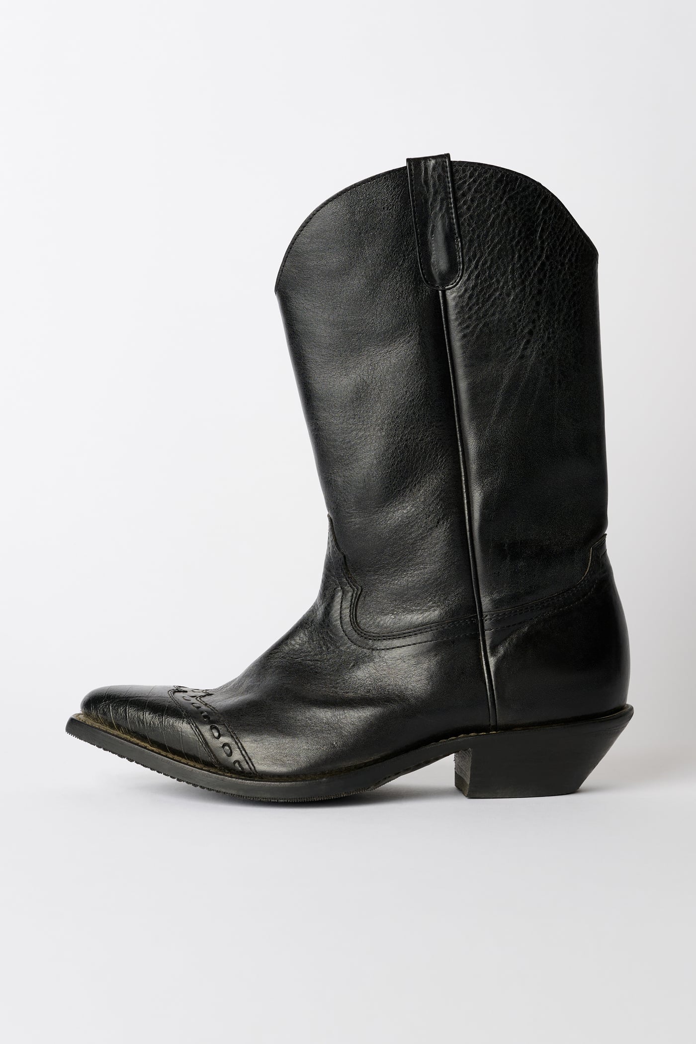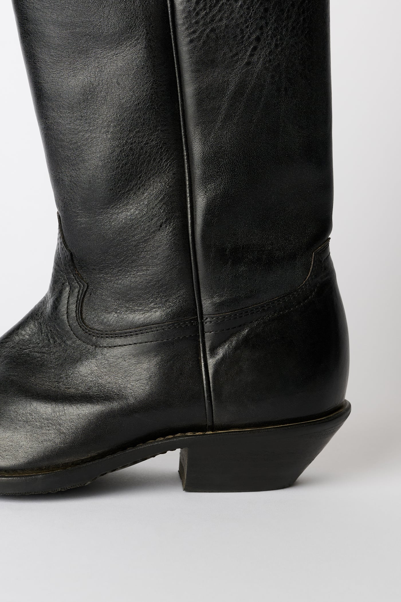 Our Consultant Boot in Deep Black Leather. Produced in Italian vegetable-tanned full grain cow leather, the Consultant Boot features hand-made stitching along the toe cap, classic cowboy cutlines, a fitted last with a wider, angled shaft, and a 5 cm high heel.