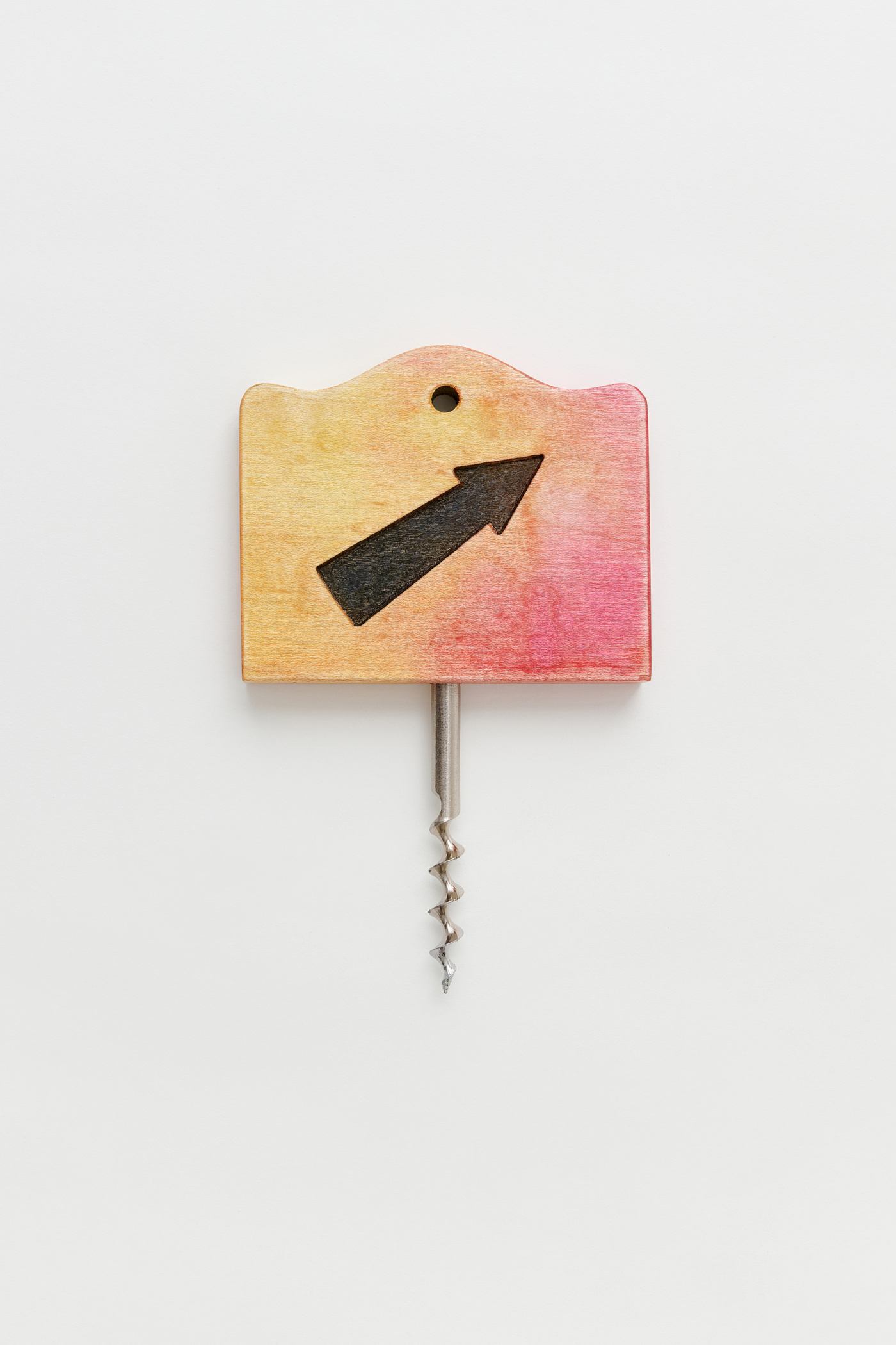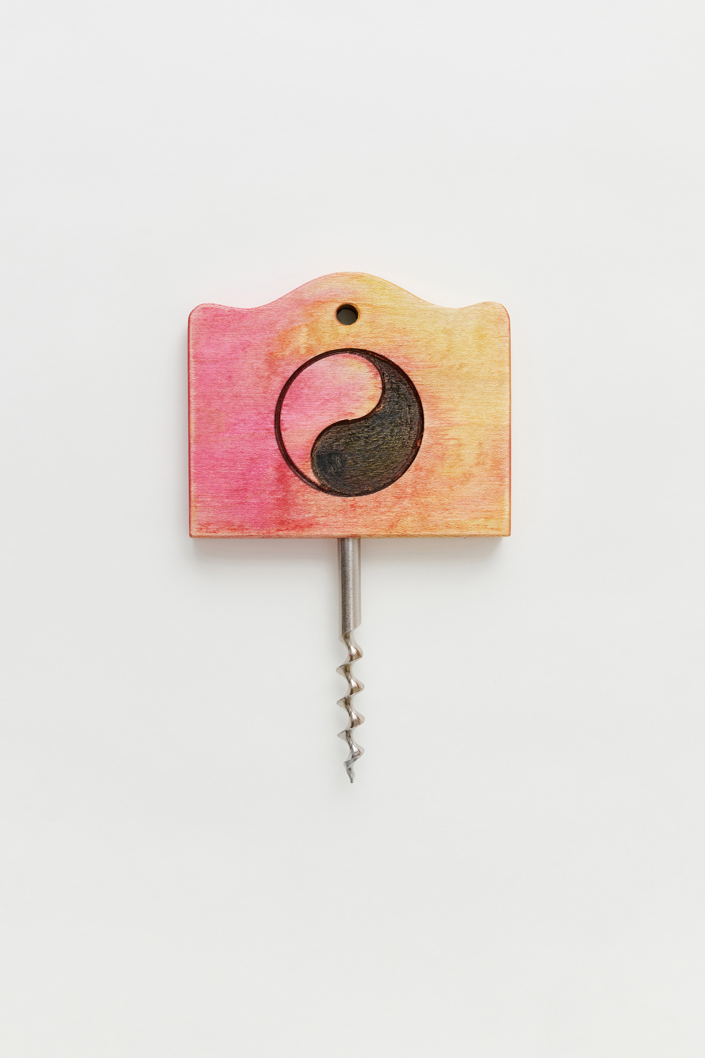 Work Shop Cork Screw in Overdyed Pine. Made in Stockholm by artist Fredrik Paulsen from upcycled pine wood with a metal cork screw, the bottle opener has been dyed by hand and features a Yin Yang logo on one side and the Gabrio Bini Arrow logo on the other.