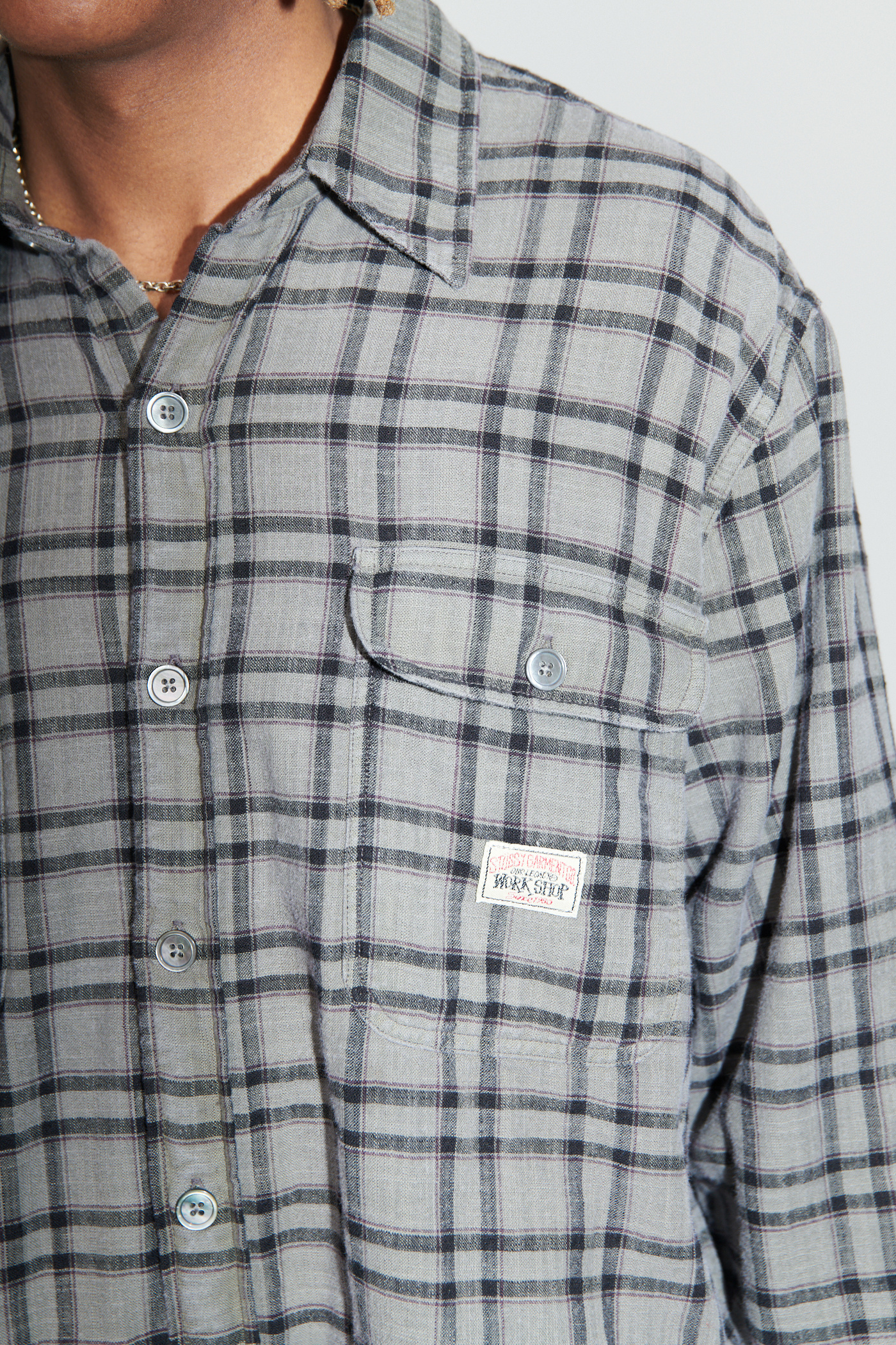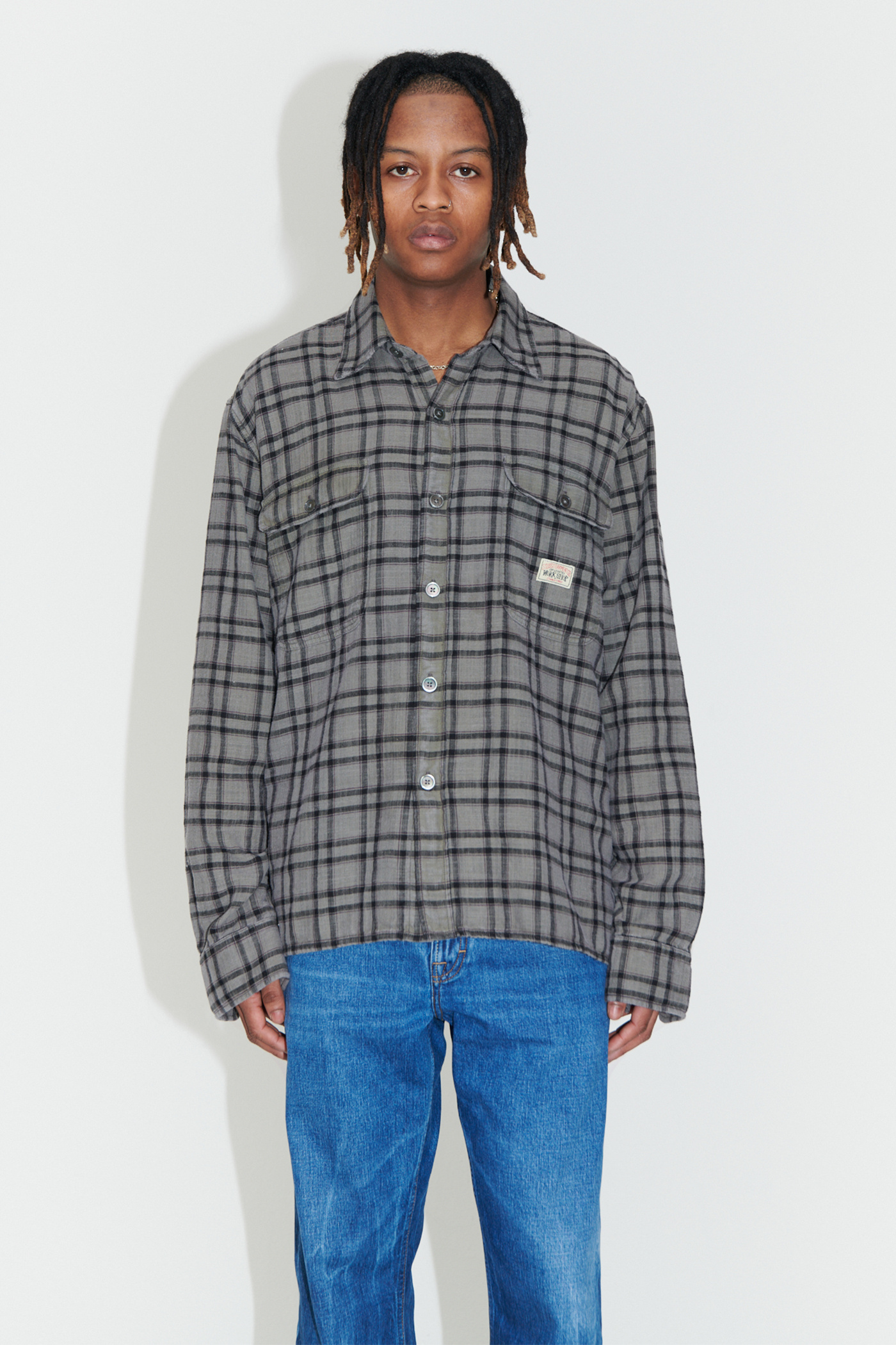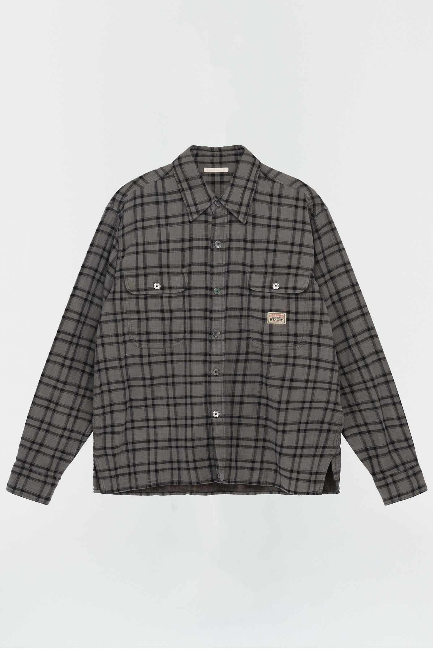 WORK SHOP X STÜSSY Country Shirt in Overdyed Check. Produced in an overdyed light double weave fabric from the Our Legacy archive, the Country Shirt features two flapped patch pockets on the chest, a WORK SHOP X STÜSSY woven patch, mother of pearl buttons and a vented straight hem.
