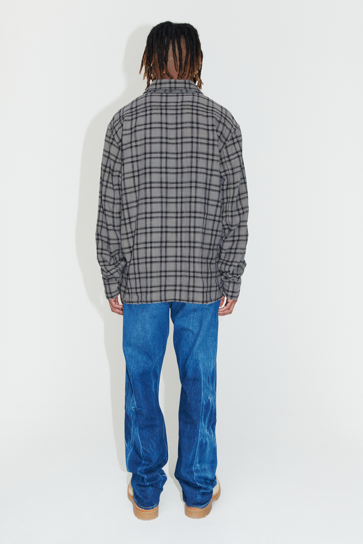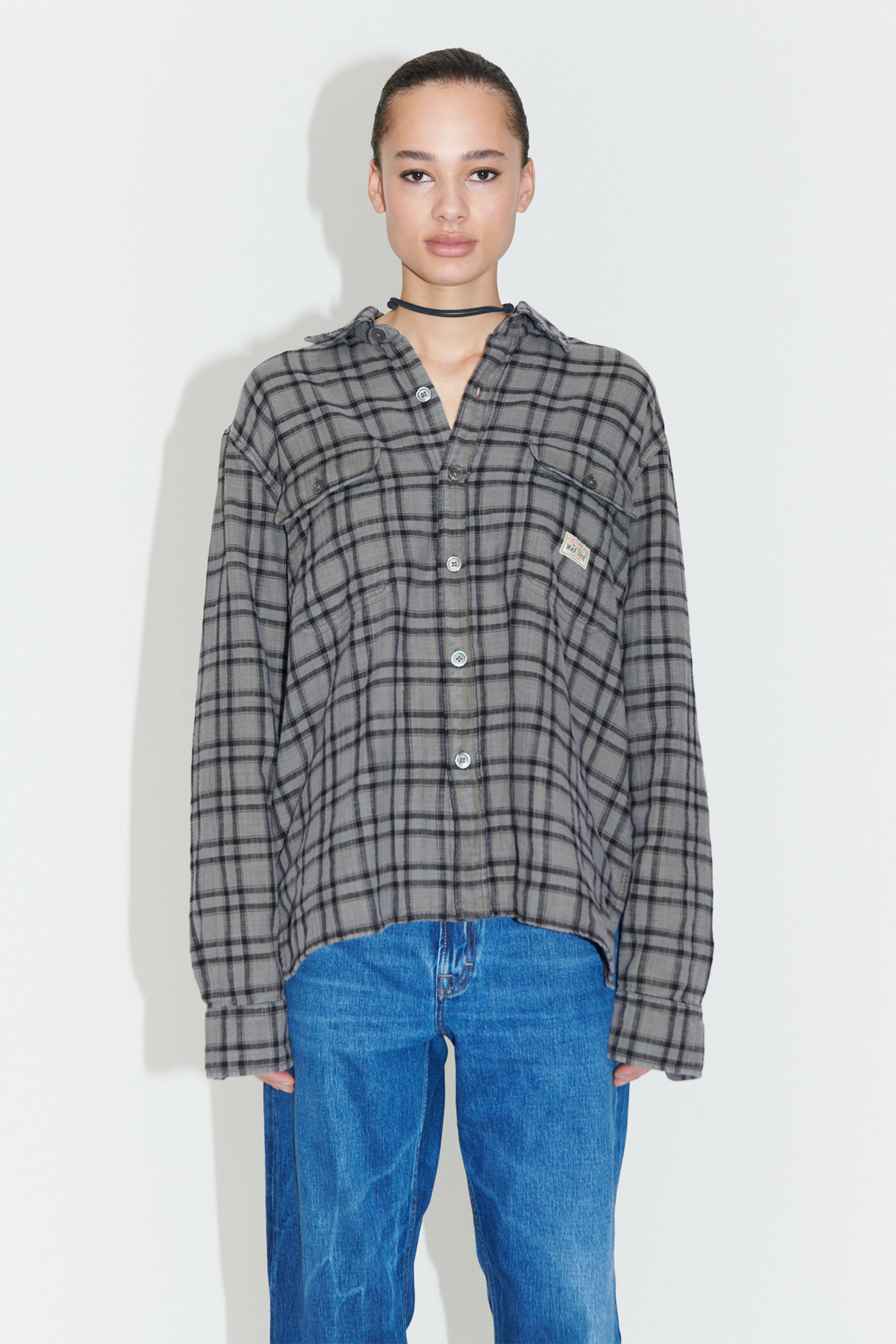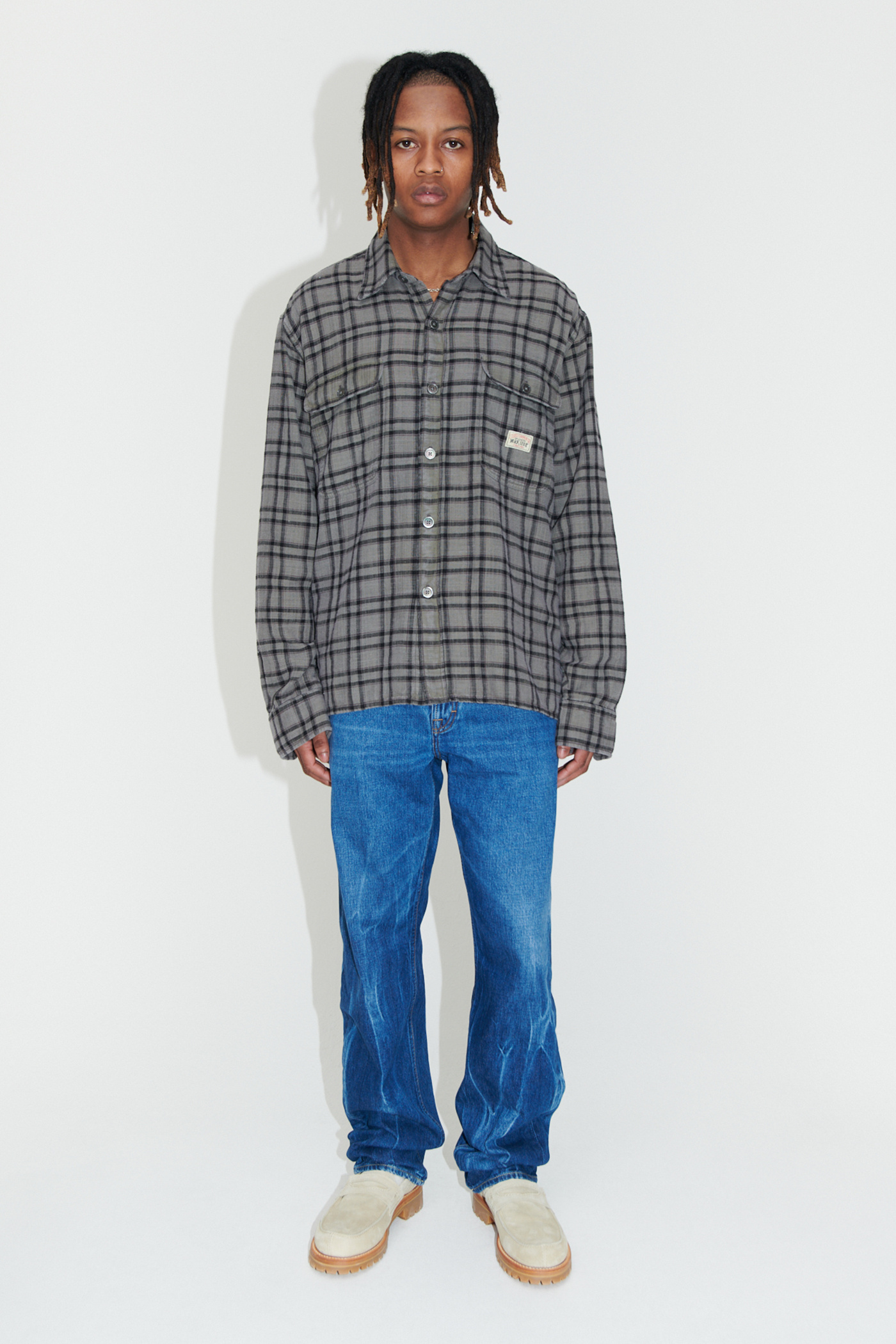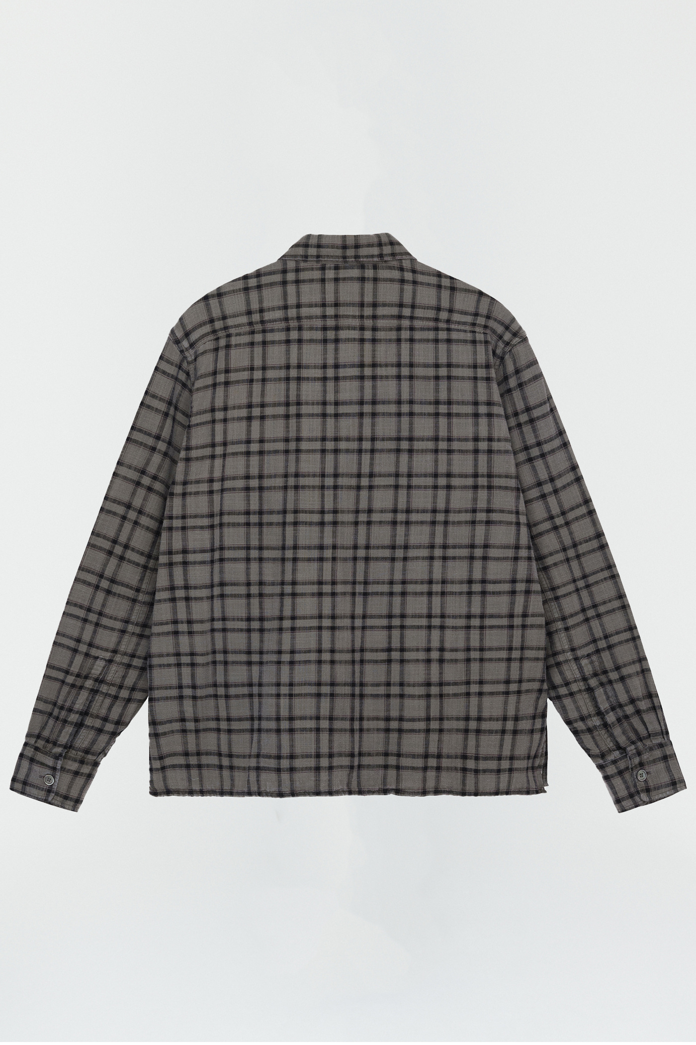 WORK SHOP X STÜSSY Country Shirt in Overdyed Check. Produced in an overdyed light double weave fabric from the Our Legacy archive, the Country Shirt features two flapped patch pockets on the chest, a WORK SHOP X STÜSSY woven patch, mother of pearl buttons and a vented straight hem.